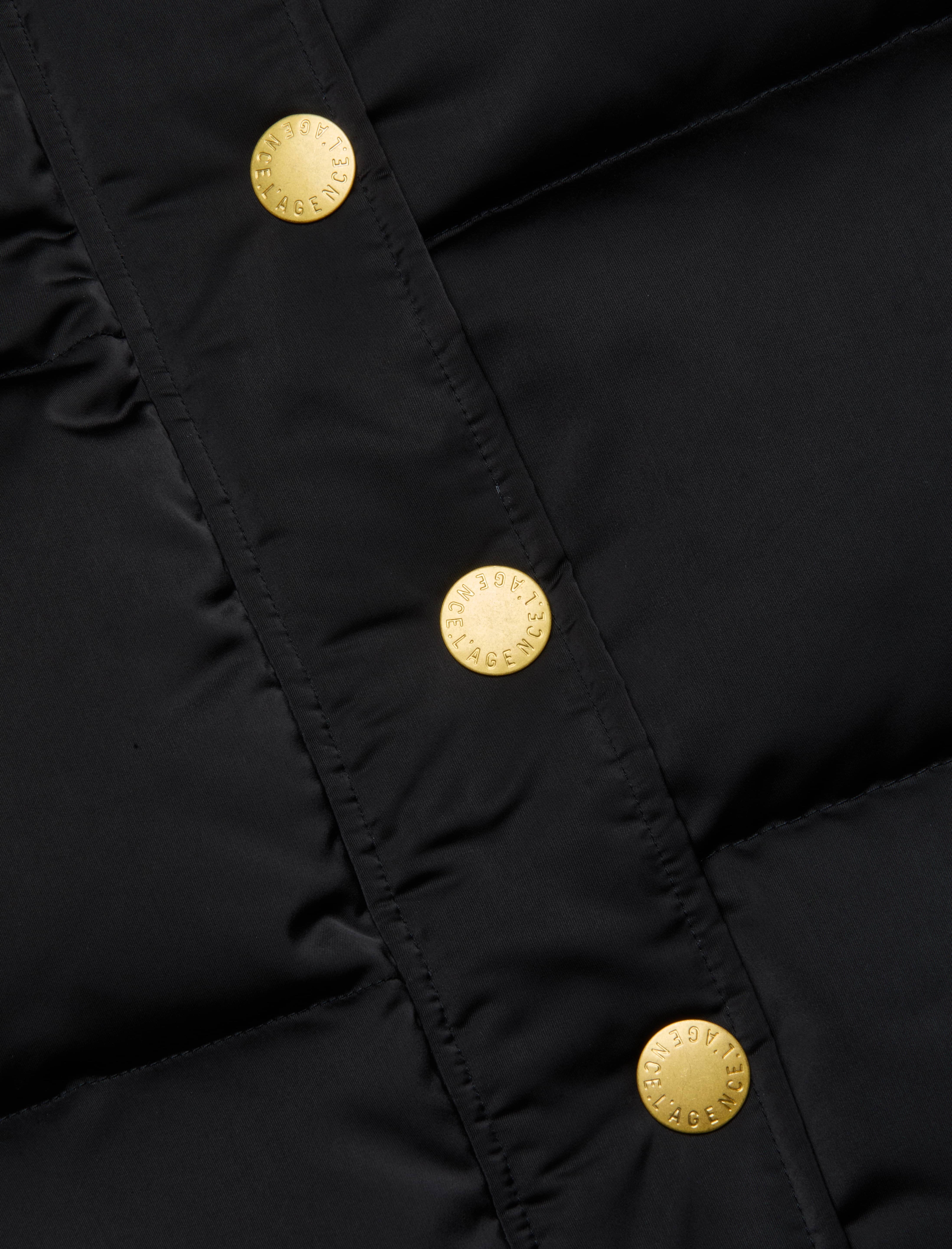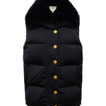 This style debuted at our Fall ‘25 NYFW presentation. Striking the balance between cozy and refined, the Nalo oversized puffer vest is a standout in cold-weather dressing. The plush faux fur collar and gold logo buttons add a luxe finish, while its voluminous silhouette layers effortlessly over everything, from chunky knits to sleek sweater dresses.