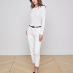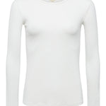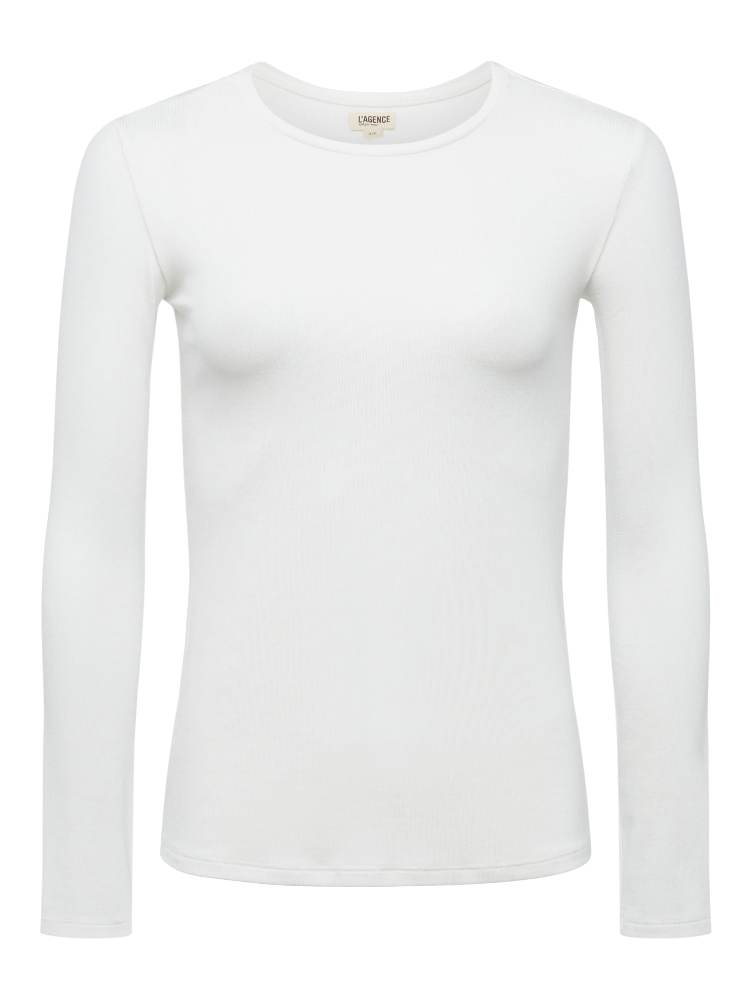 Modern and elegant slim-fit top in pure white. Ultra-soft ribbed micro modal has a luxuriously silky hand and clings lightly to the figure. Look includes crew neck and sleek long sleeves. Beautiful wardrobe stable that works on its own or as a base layering piece.