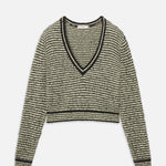 A textured V-neck sweater in a striped knit with soft brushed trim. Designed with a deep V neckline, long sleeves, and a cropped silhouette with ribbed hem.