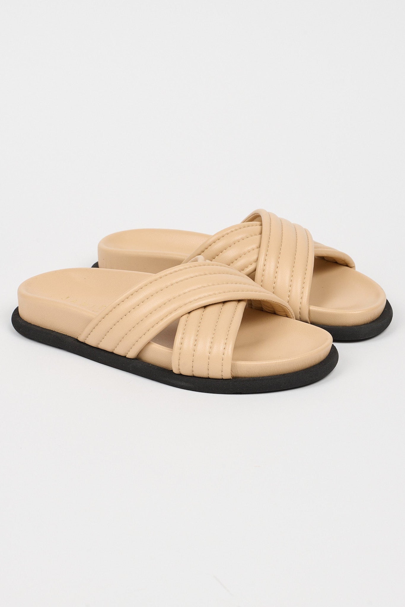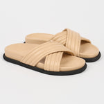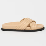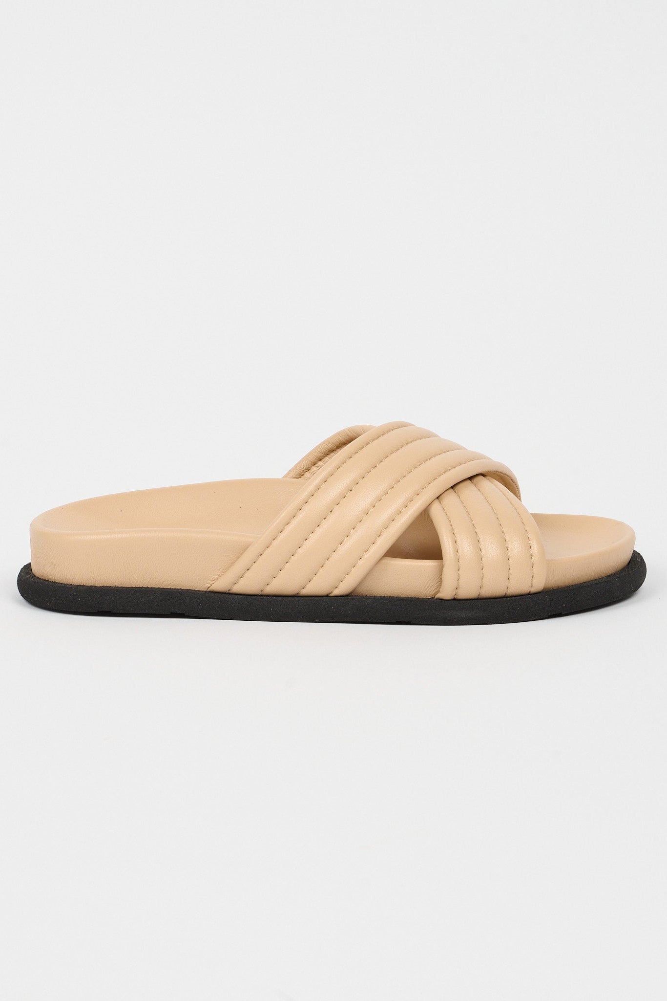 Our rubber bumper sole grounds Italian Nappa Lamb in a classic Pool Slide shape. Weekend luxury. Afternoon delight. The criss cross channel stitch detail is as chill as Sundays at the pool.