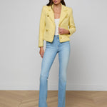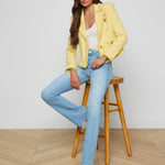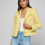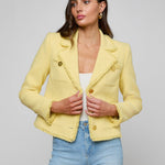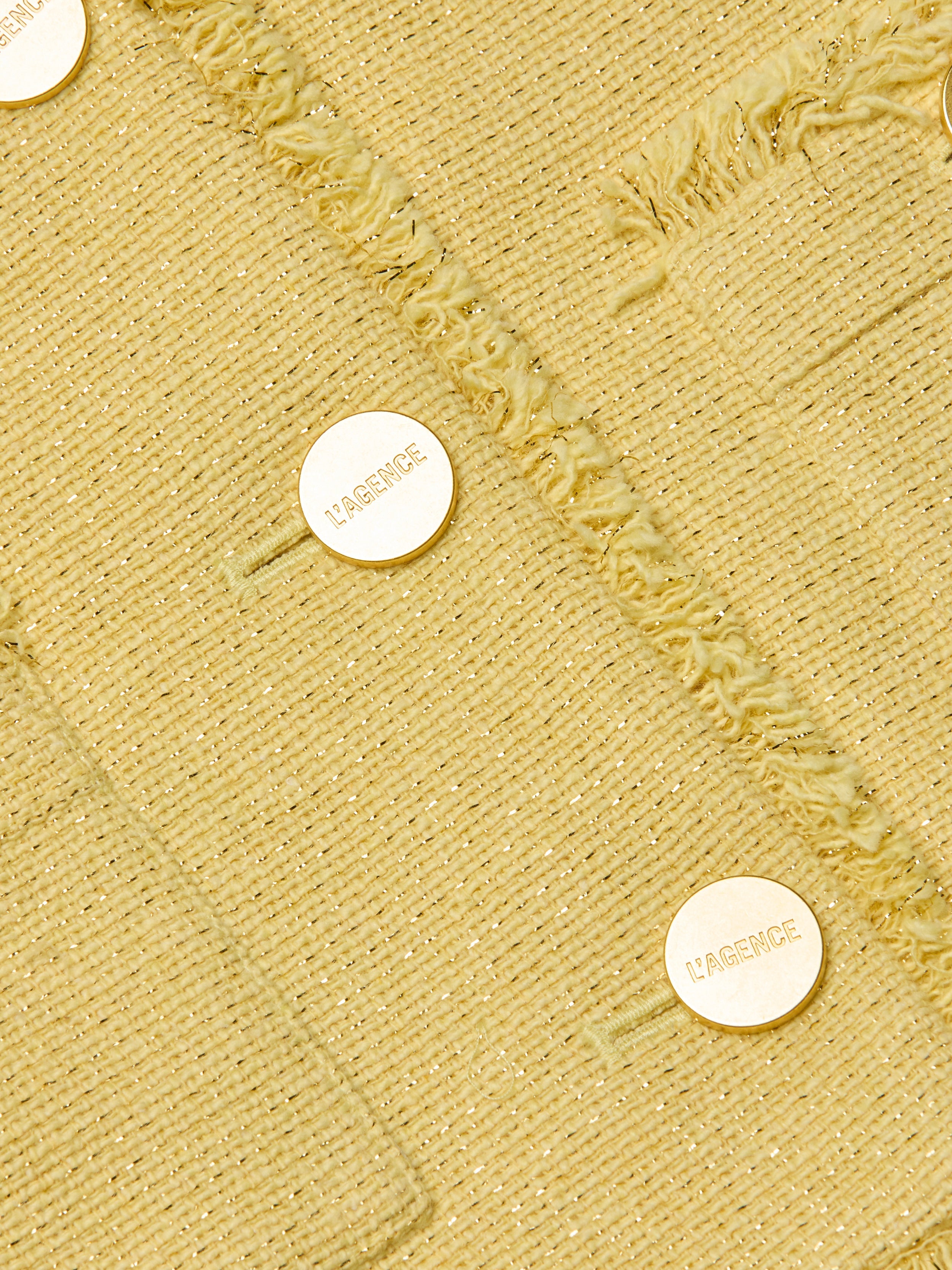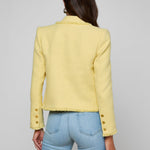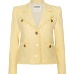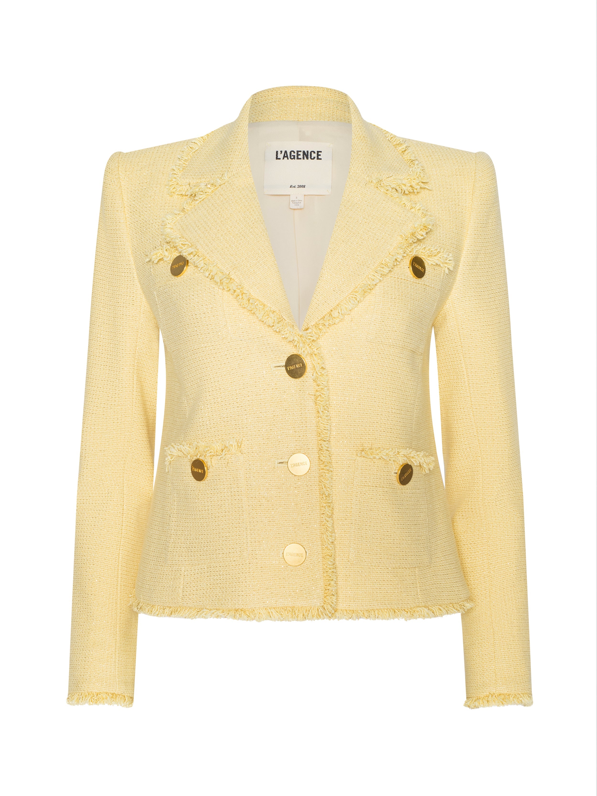 A luxe fabrication meets a classic cut in the collared Sylvia jacket. Fringed trims and embossed gold buttons complete its look. Now back in bright yellow.