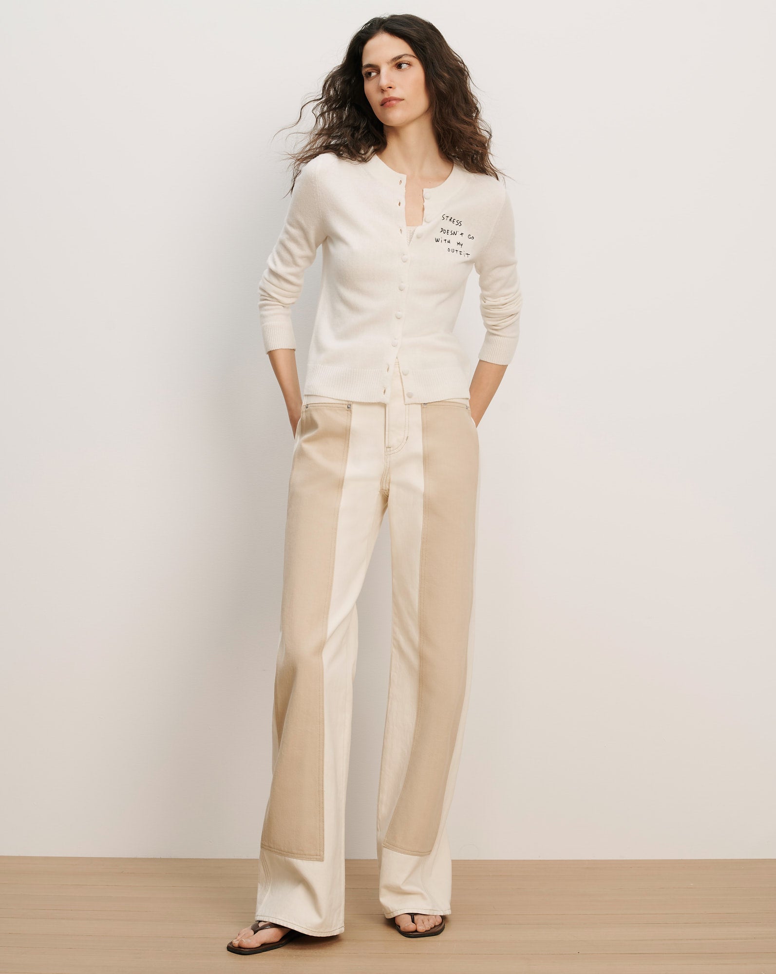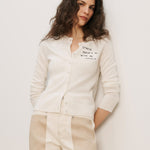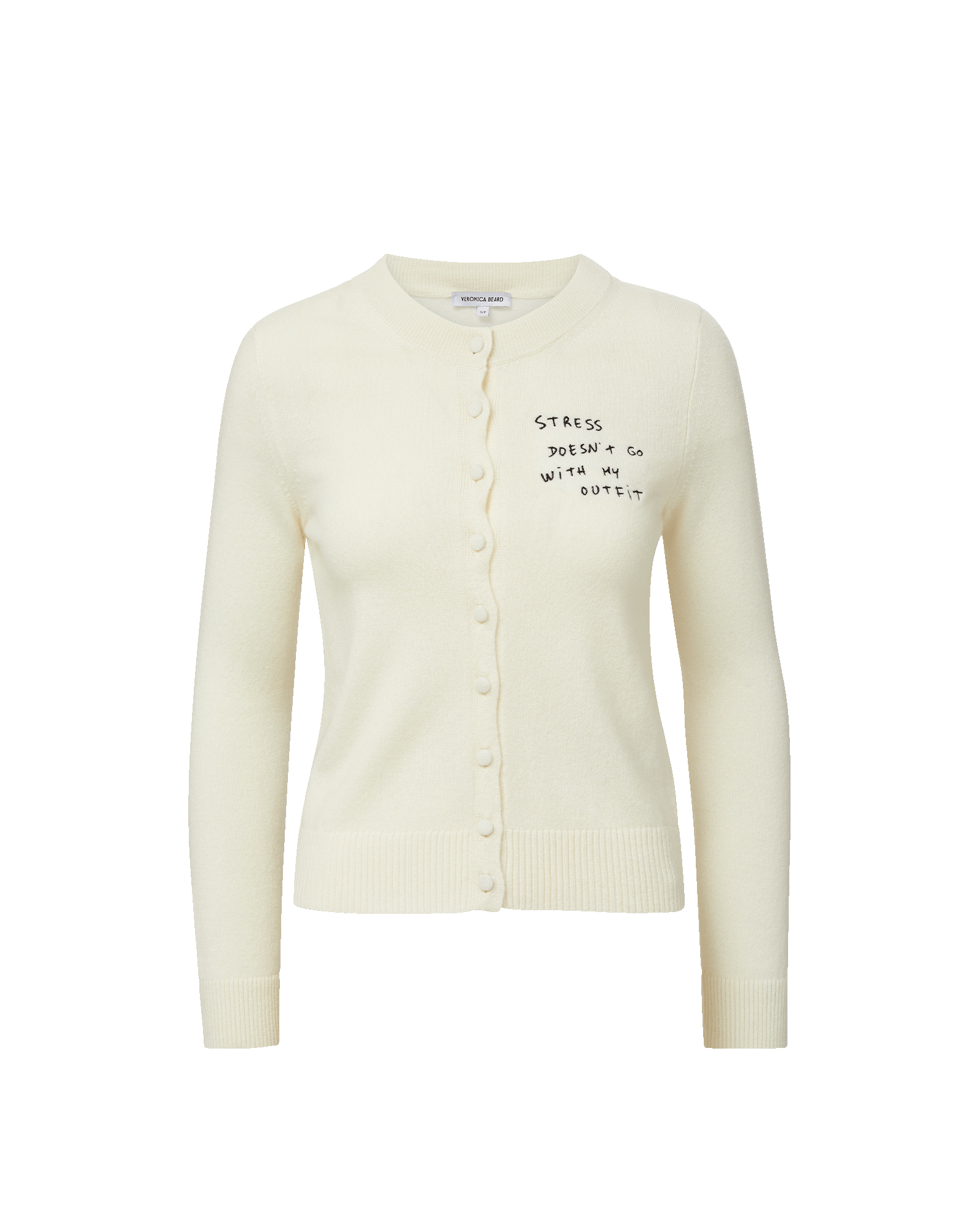 The classic cardigan, now with a playful twist. Part of the Veronica Beard x Thomas Lélu limited-edition capsule, the Daro cardigan is embroidered with the Parisian artist’s signature phrase, STRESS DOESN’T GO WITH MY OUTFIT. Spun from 100% cashmere in soft ivory, it’s lightweight and exceptionally soft. A full button-down placket and ribbed trim along the crew neckline, sleeves, and hem complete the look. Style it with denim and sandals for an understated daytime look.