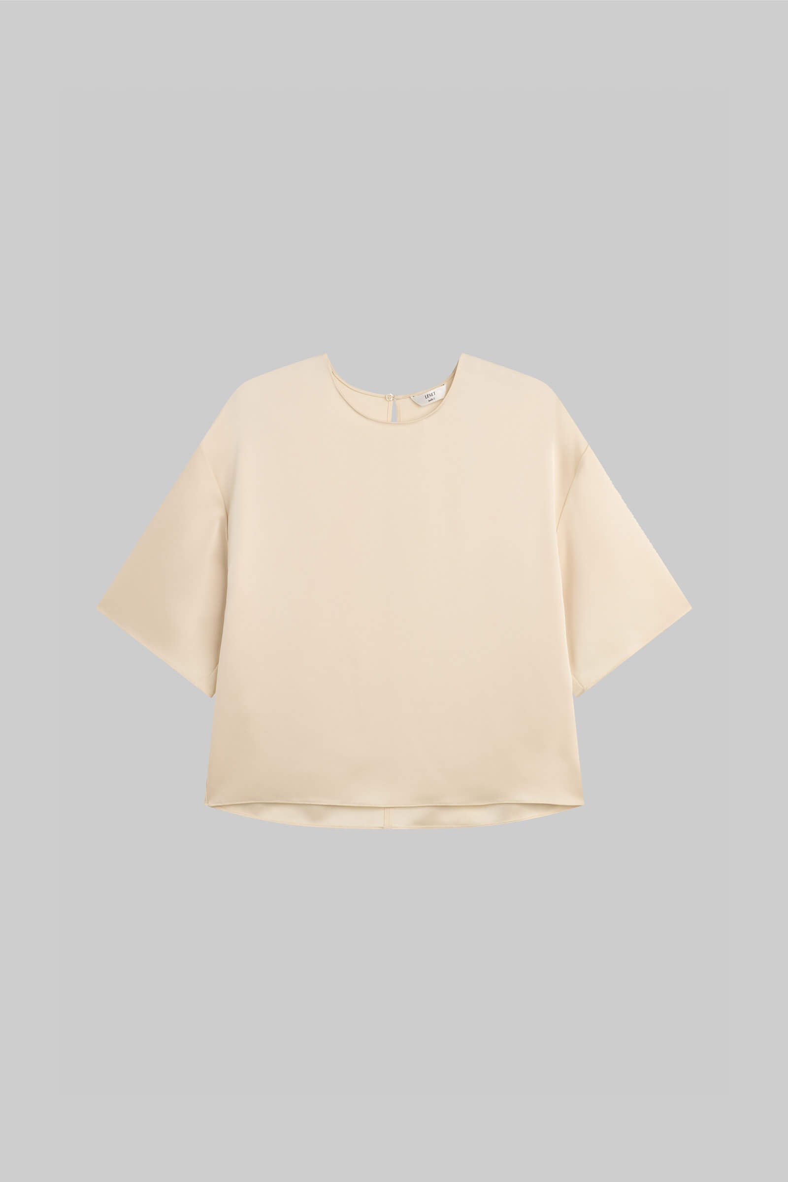 Cut in our Japanese-crafted satin, The Barb Boxy Tee is an oversized tee silhouette featuring a crew neckline, elongated short sleeves, and a beautiful draped length.