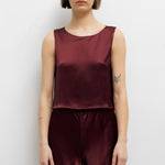 Cut in our best-selling, Japanese-crafted Barb Satin, the Barb Crop Sleeveless Crew is a classic shell silhouette. With a slightly cropped length and wide rounded neckline, make it a twin set with the Barb Crew Cardigan in Bordeaux.