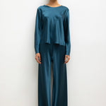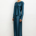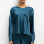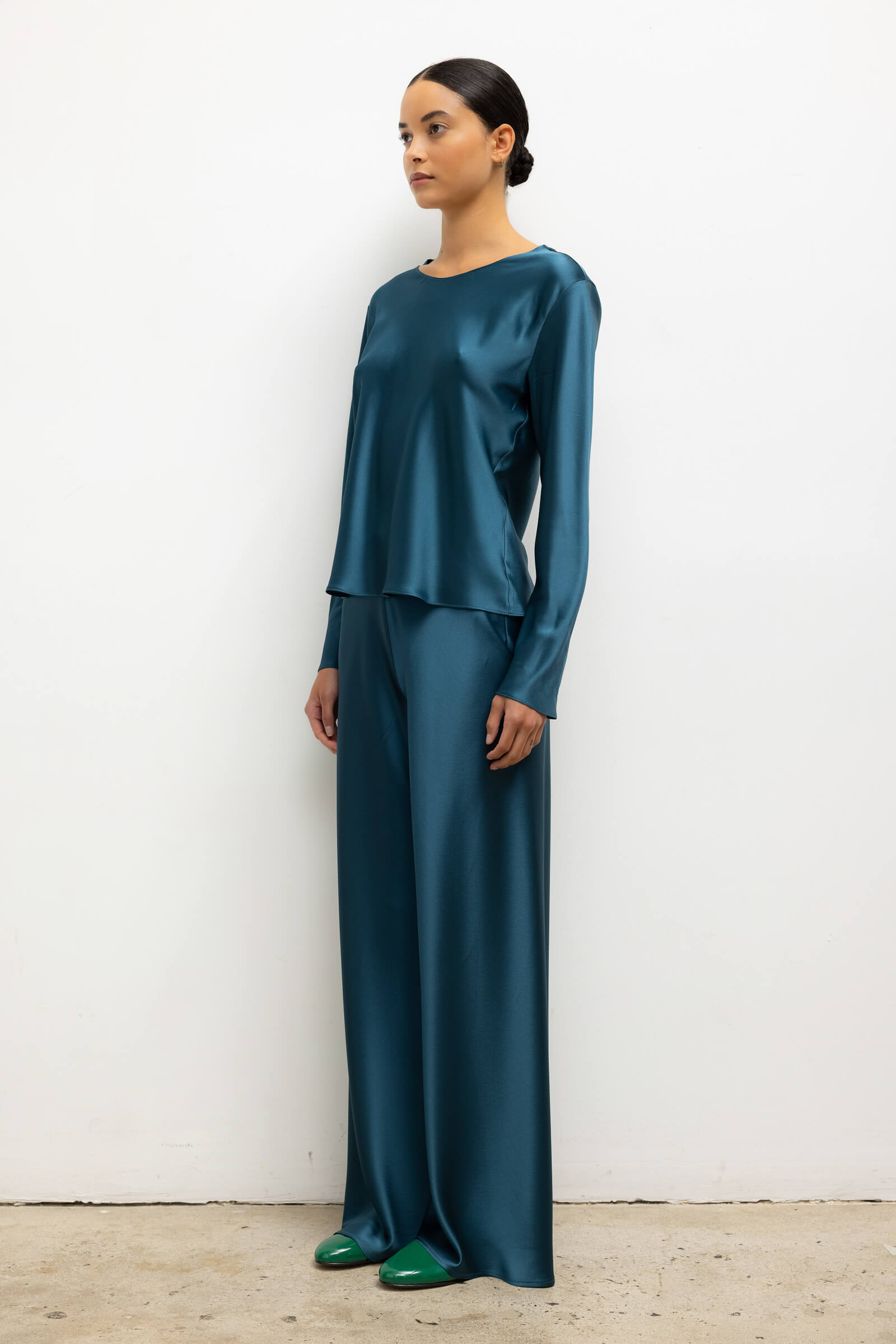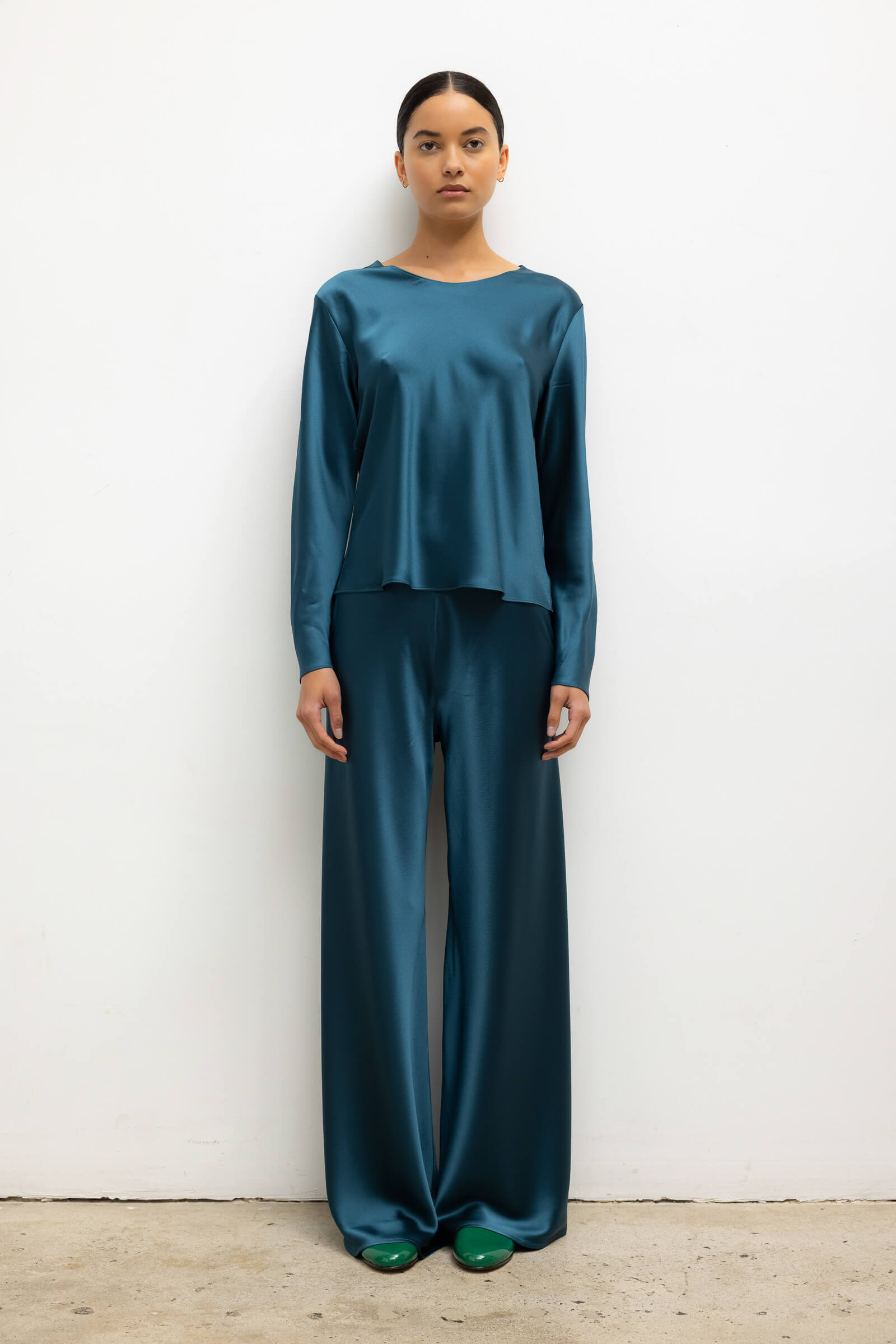 Cut in our Japanese-crafted Barb Satin, The Barb Long Sleeve Crew is a perfectly draped top finished with a clean crew neckline, full length sleeves, and a tuckable length. Make it a matching set with any Barb bottom.