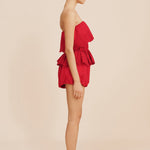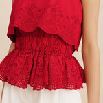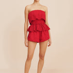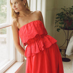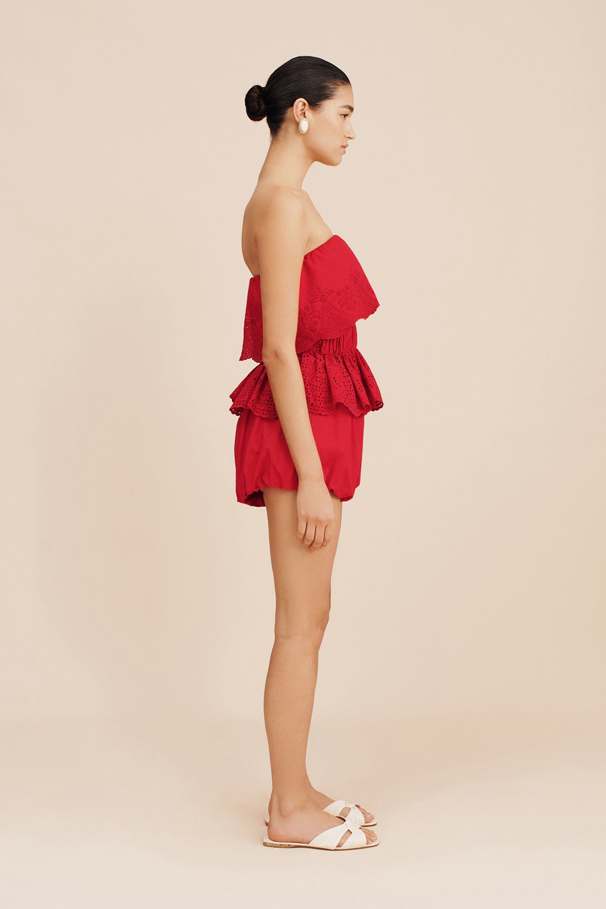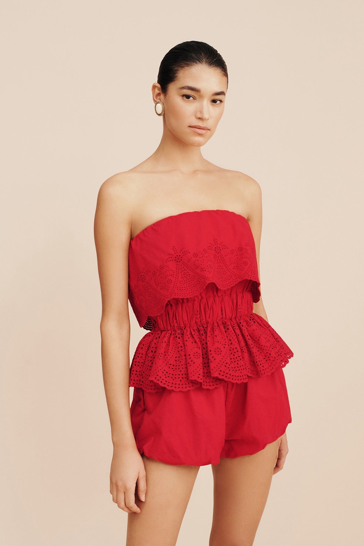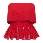 Crafted from crisp cotton in a festive red hue, the Beryl Top has a strapless silhouette framed with ruffles around the waist and peplum hem. It features antique-inspired intricate embroidery throughout. Coordinate yours with the Beryl Skirt or Aurelia Short.