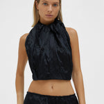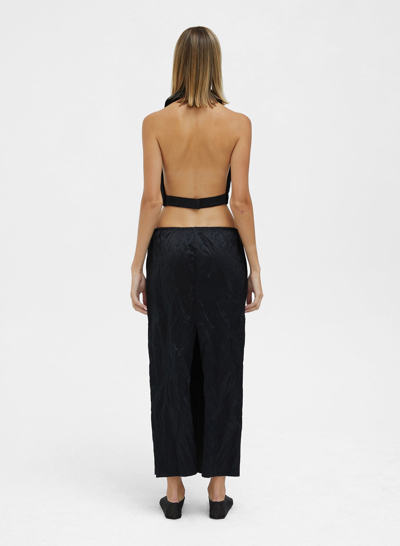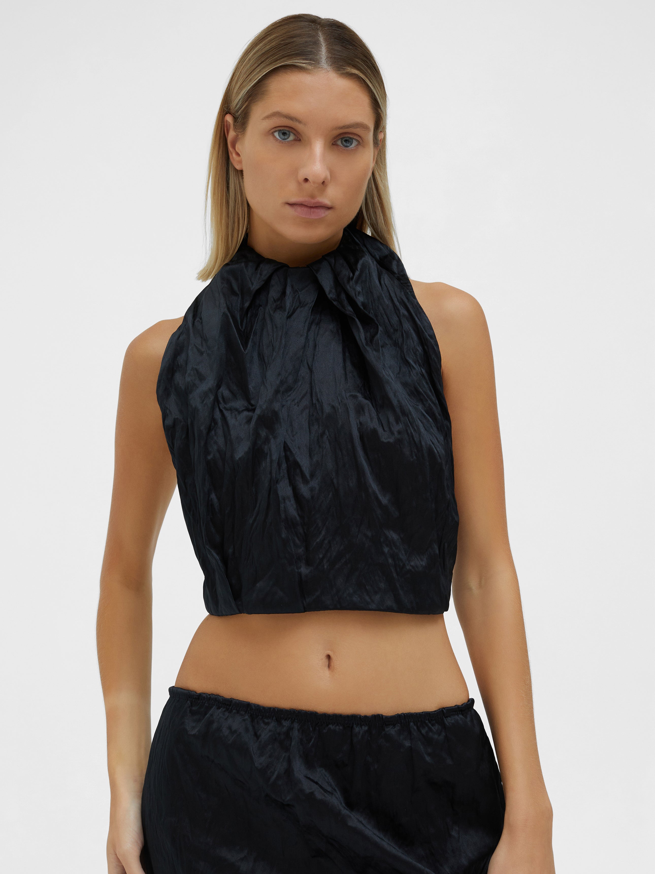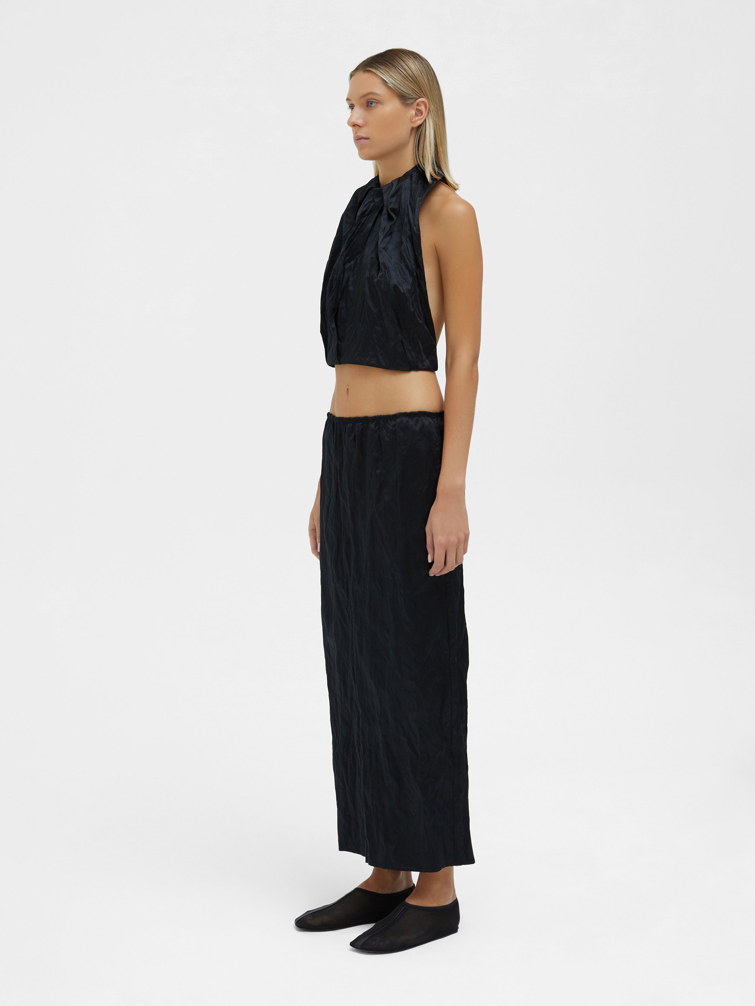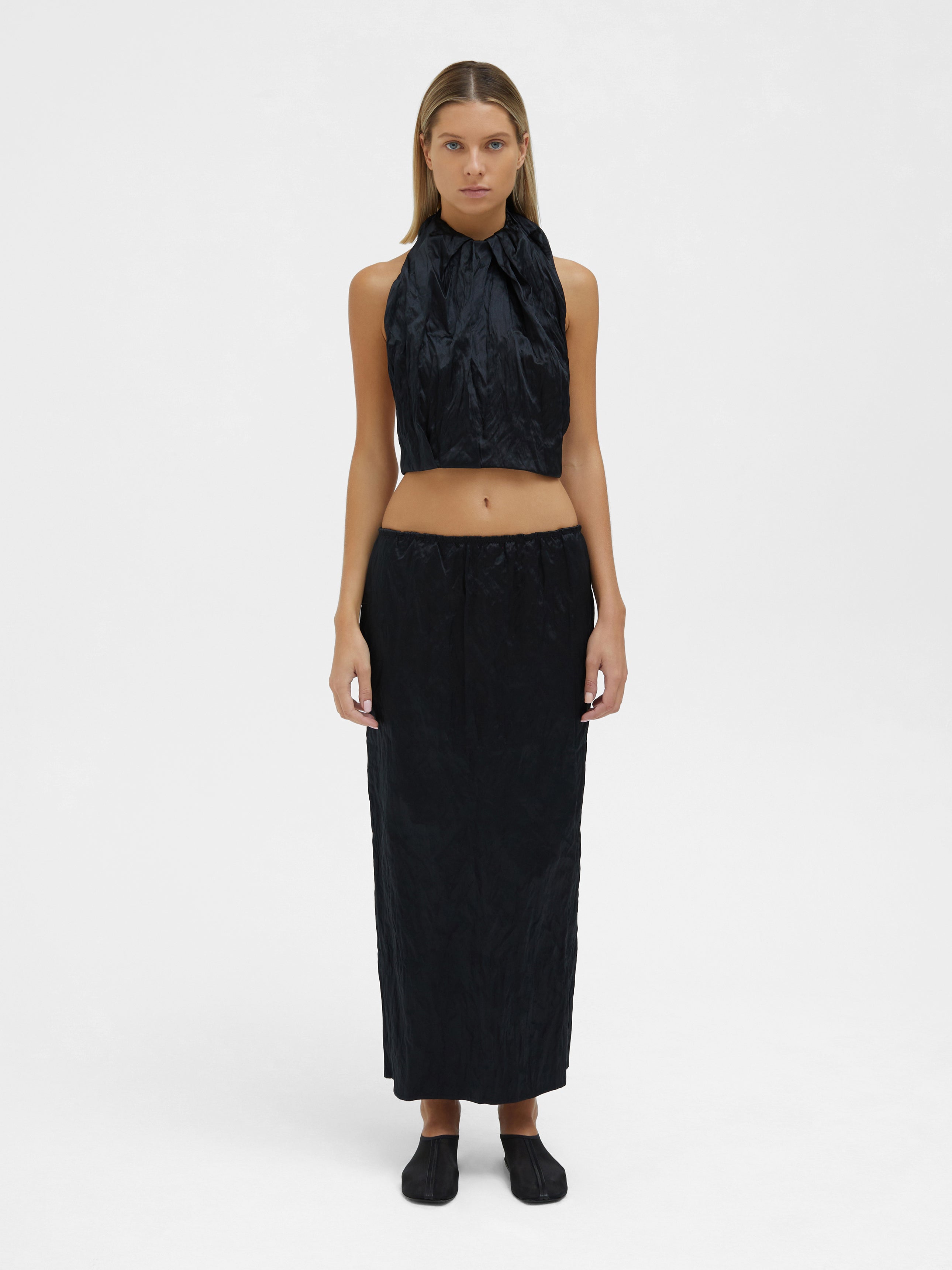 Signature crushed cotton silhouettes evolve this season into elevated separates in high sheen black. The Capture Silk Crush Top features a cropped, open back silhouette, designed to be paired with the coordinating Silk Crush Trouser or Skirt. Silk is fused with Italian cotton and metallic yarn to allow the top to be crushed and moulded to a preferred shape.