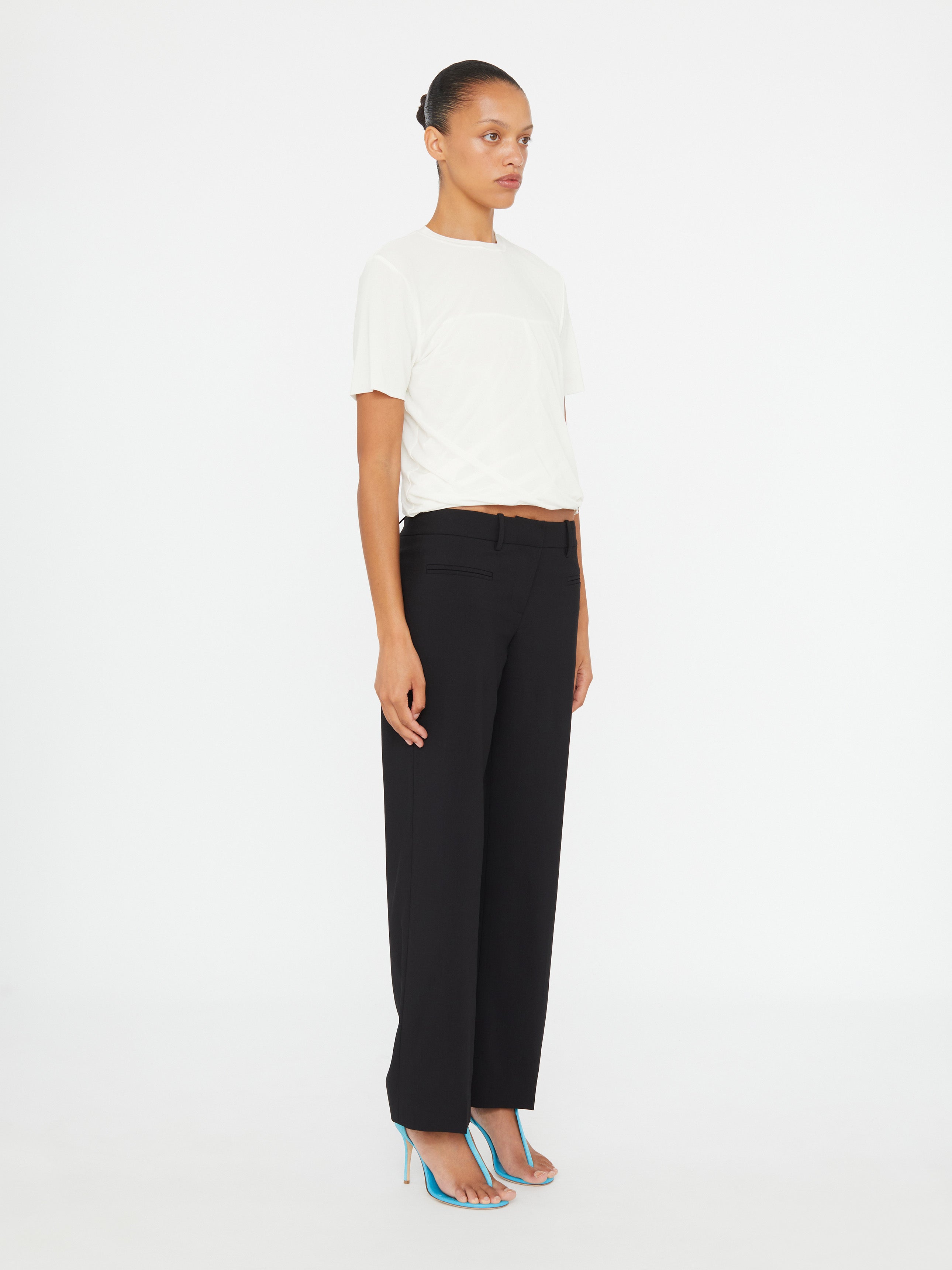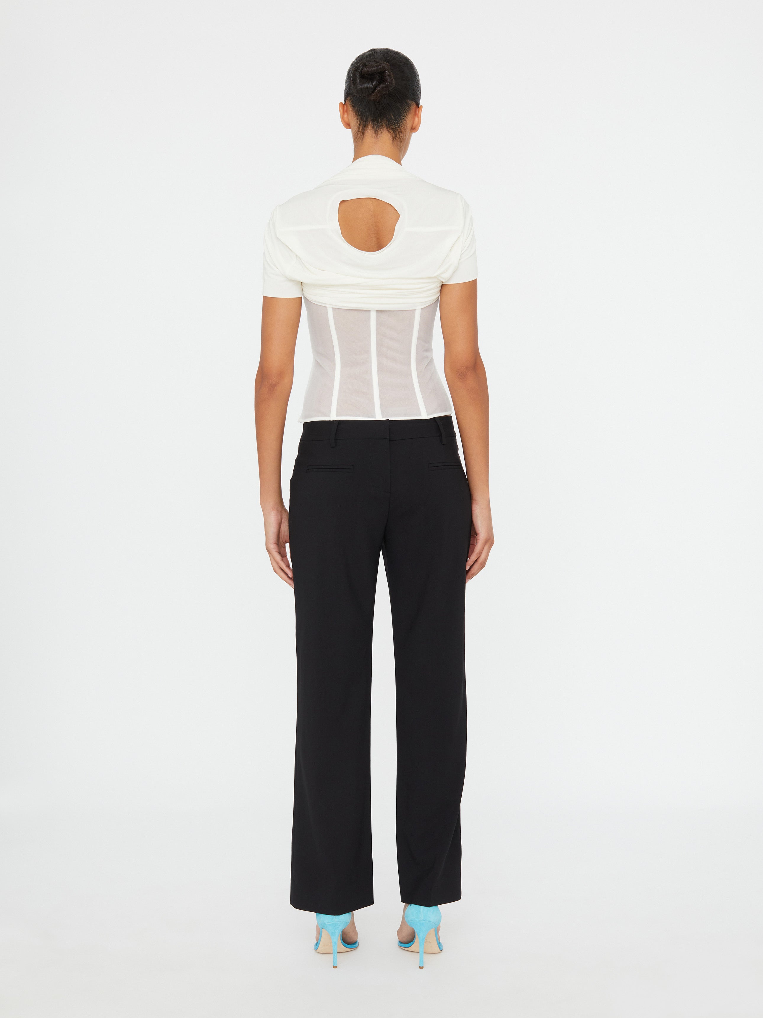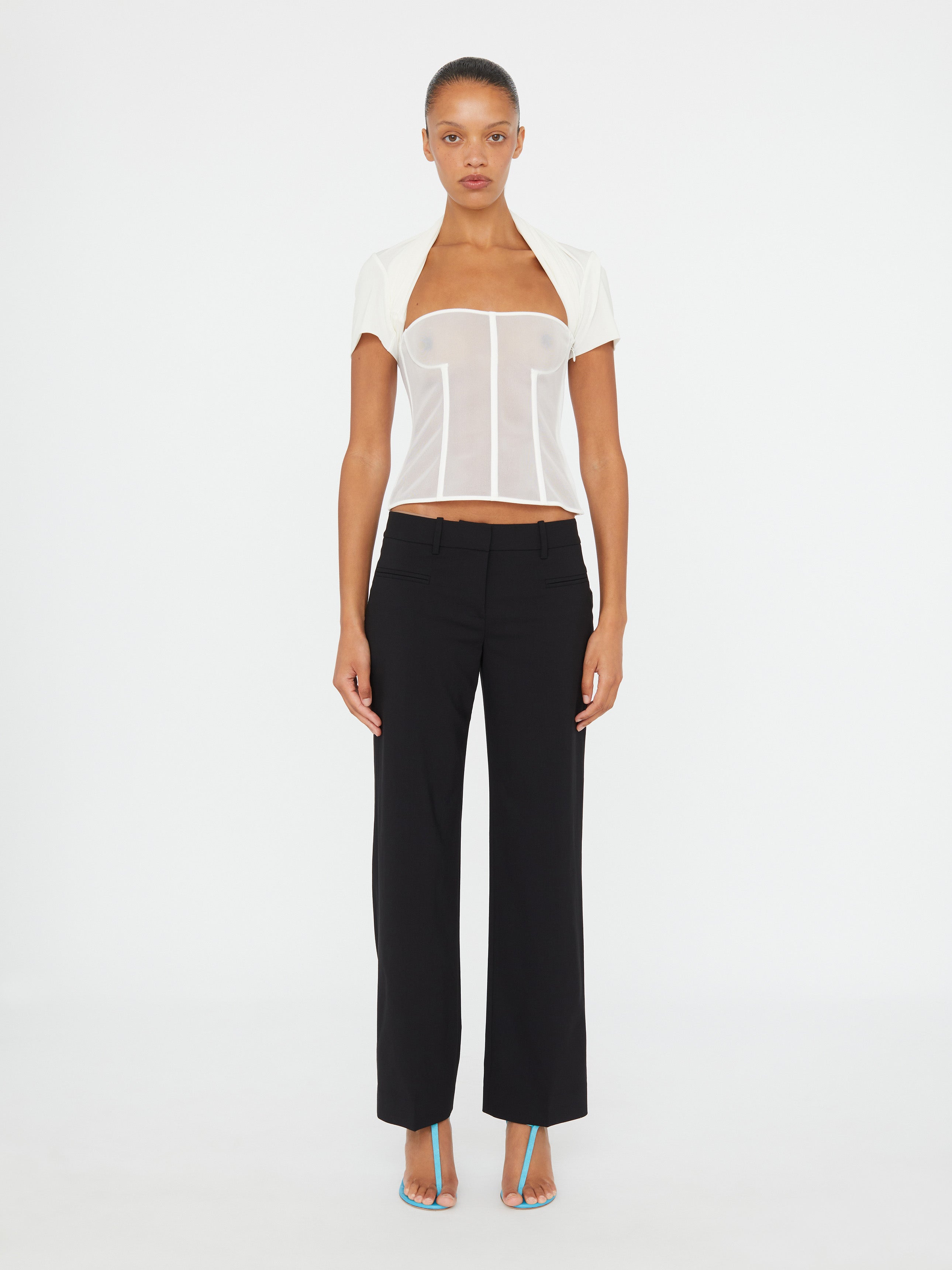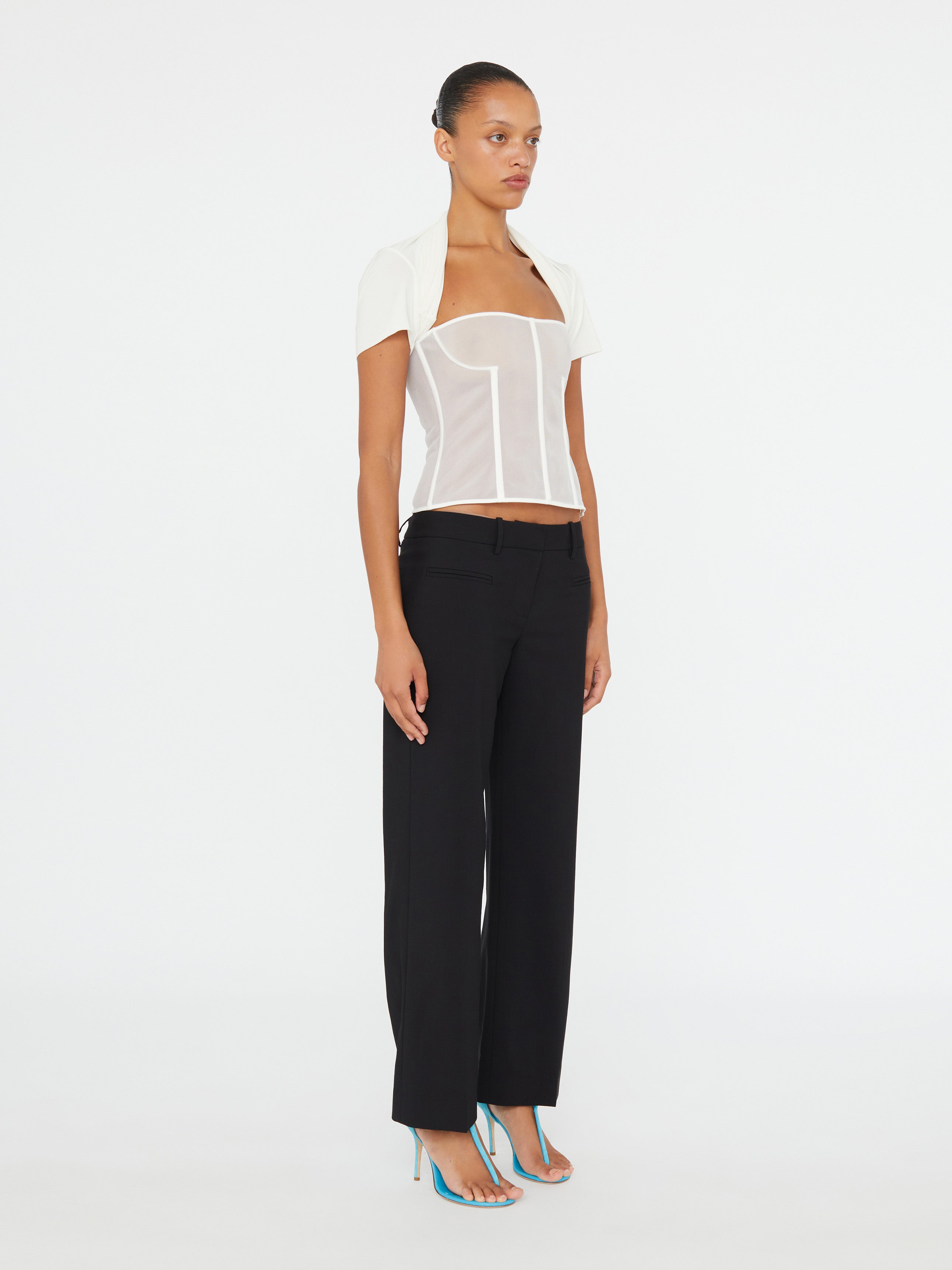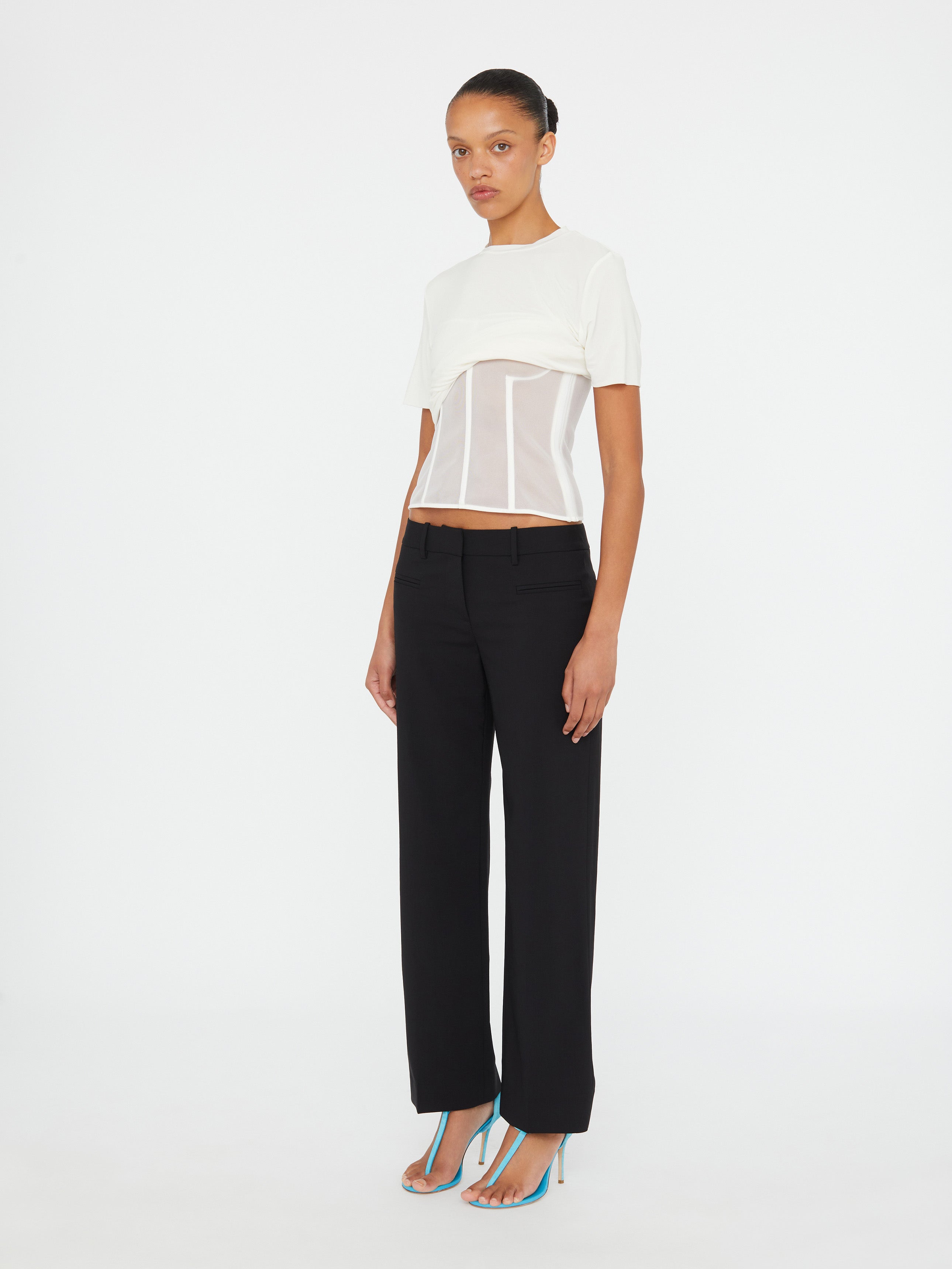 A jersey tee is explored, draped and anchored into sheer corsets, echoing the effortless gesture of skaters pulling tees behind their necks. Inbuilt boning creates structured rigidity.