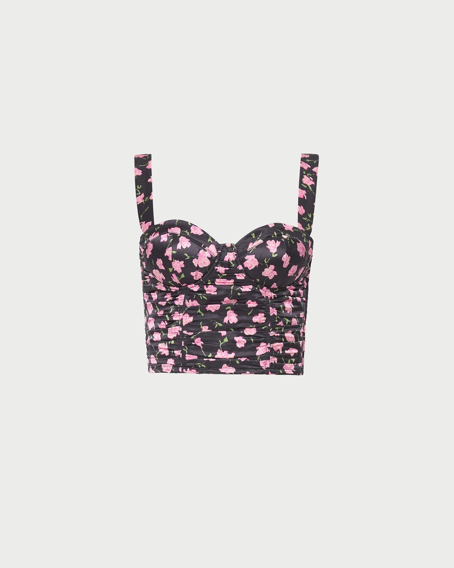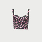 Sleeveless top in black rosette textured fabric. Features a sweetheart neckline, smocking at the back, built-in cups for extra support, ruched detailing at the hem, and a side-zip closure. Pairs beautifully with our matching Mandy Skirt.