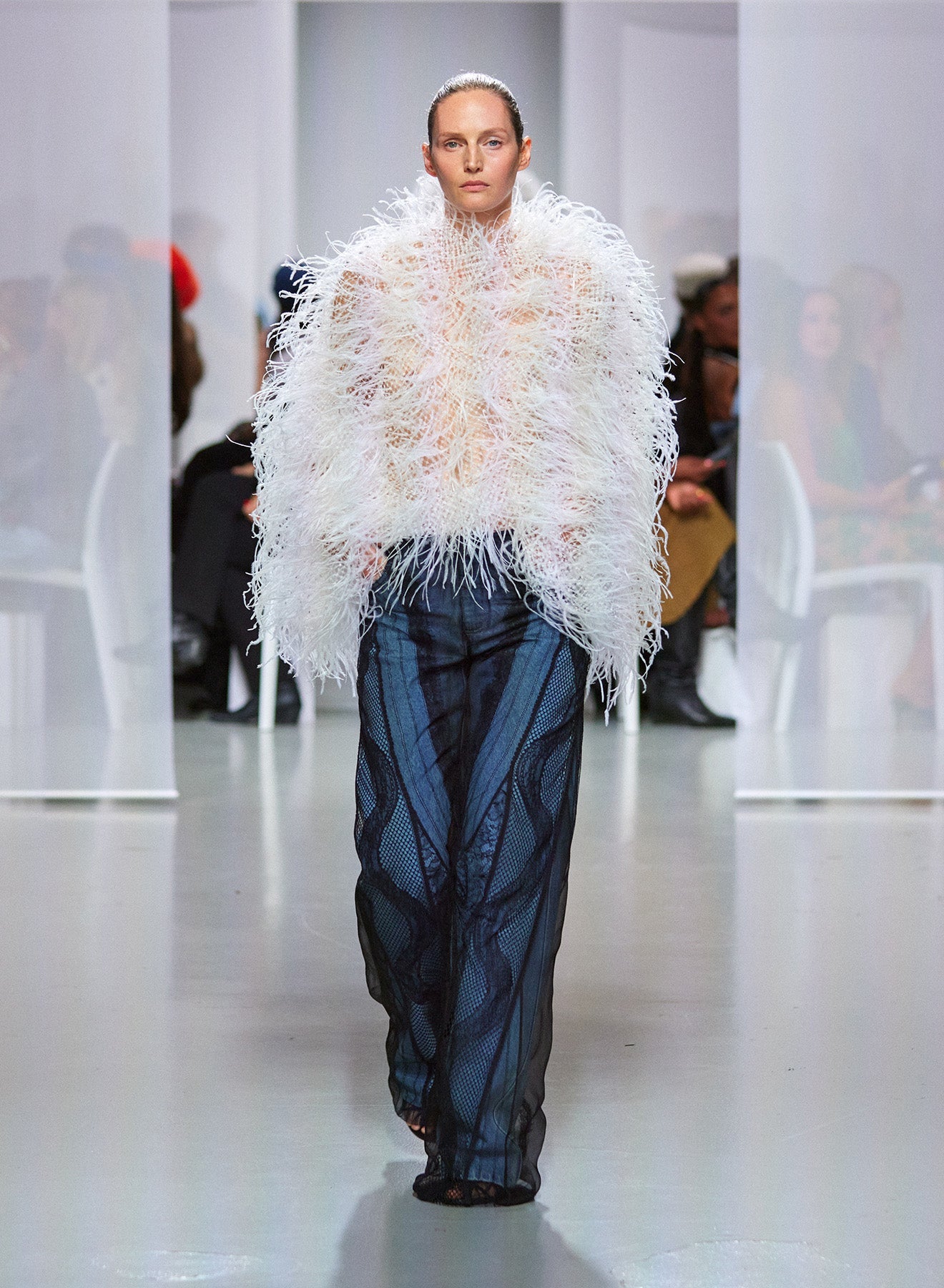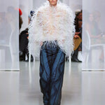 Lace netting is hand embroidered with single strands of Osterich feathers, anchored by seed beads. 28 artisans spent 9 days to complete the embroidery that makes up these spectacular pieces - evoking lightness and nostalgia.