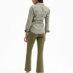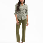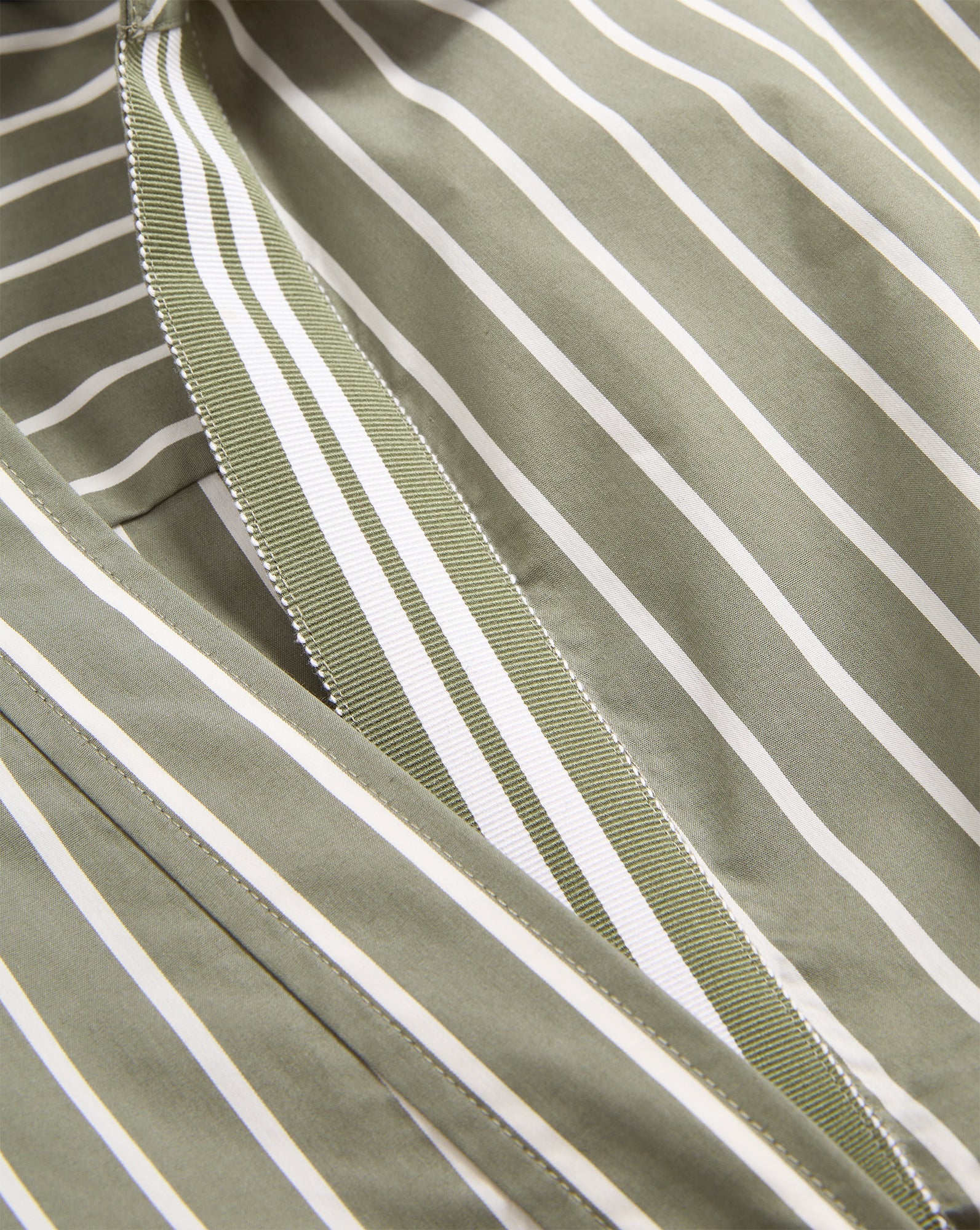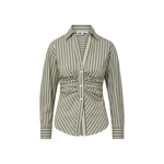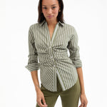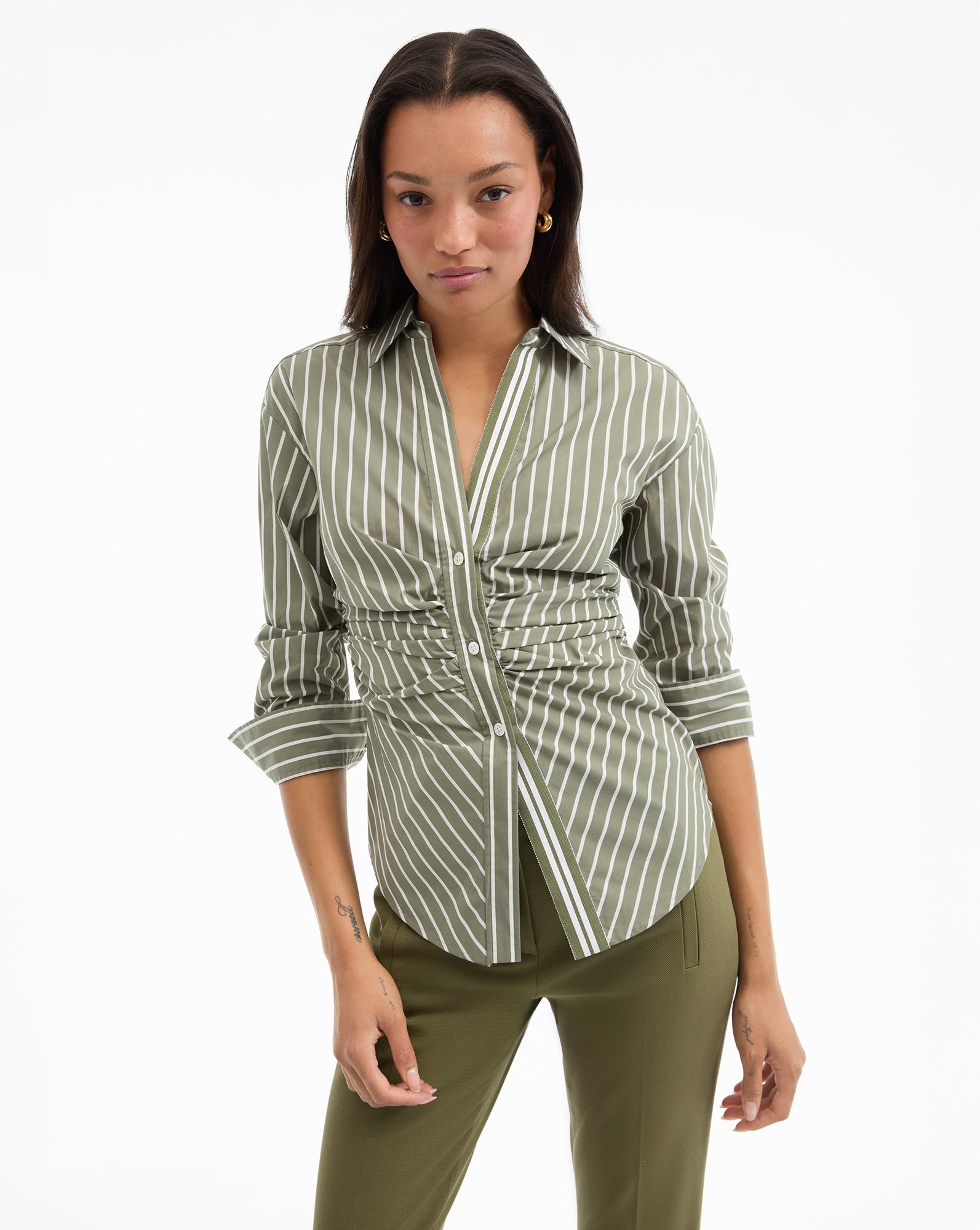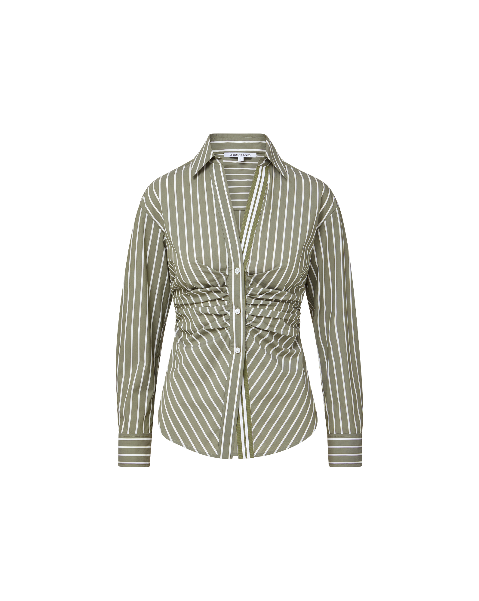 The classic button-down—with a VB twist. Crafted from lightweight stretch cotton in green and white stripes, the Devra shirt features a deep V-neckline and ruched detailing at the waist for a flattering, feminine silhouette. Pre-cuffed sleeves finish the look, adding laid-back polish. Designed to be styled tucked or untucked, it pairs effortlessly with everything from jeans to trousers.