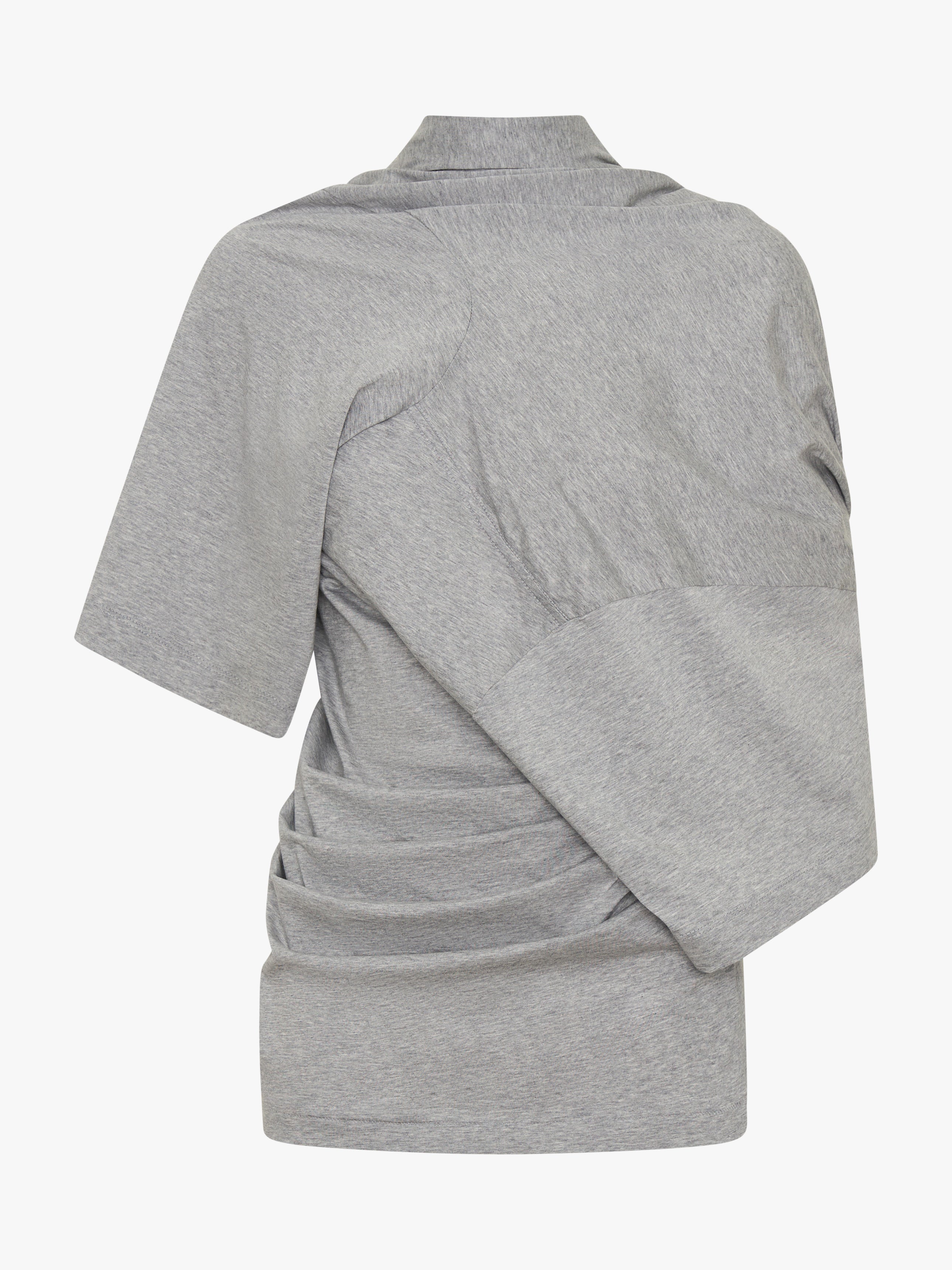 This short sleeve tee intentionally drapes across the body with fluidity. Featuring an asymmetric silhouette that appears to twist away from the body. Style with pinstripe trousers or deconstructed denim for a directional take on off-duty dressing.