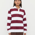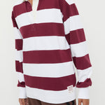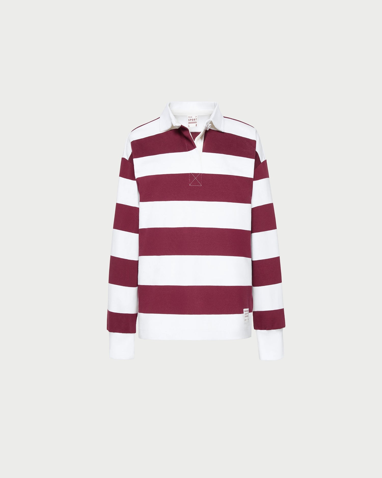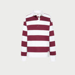 Rugby shirt in maroon and white striped heavyweight cotton. Features a contrast collar, a front placket with hidden buttons, ribbed cuffs, and an exterior cotton patch with our exclusive LR Sport logo. Designed for a relaxed, roomy fit.