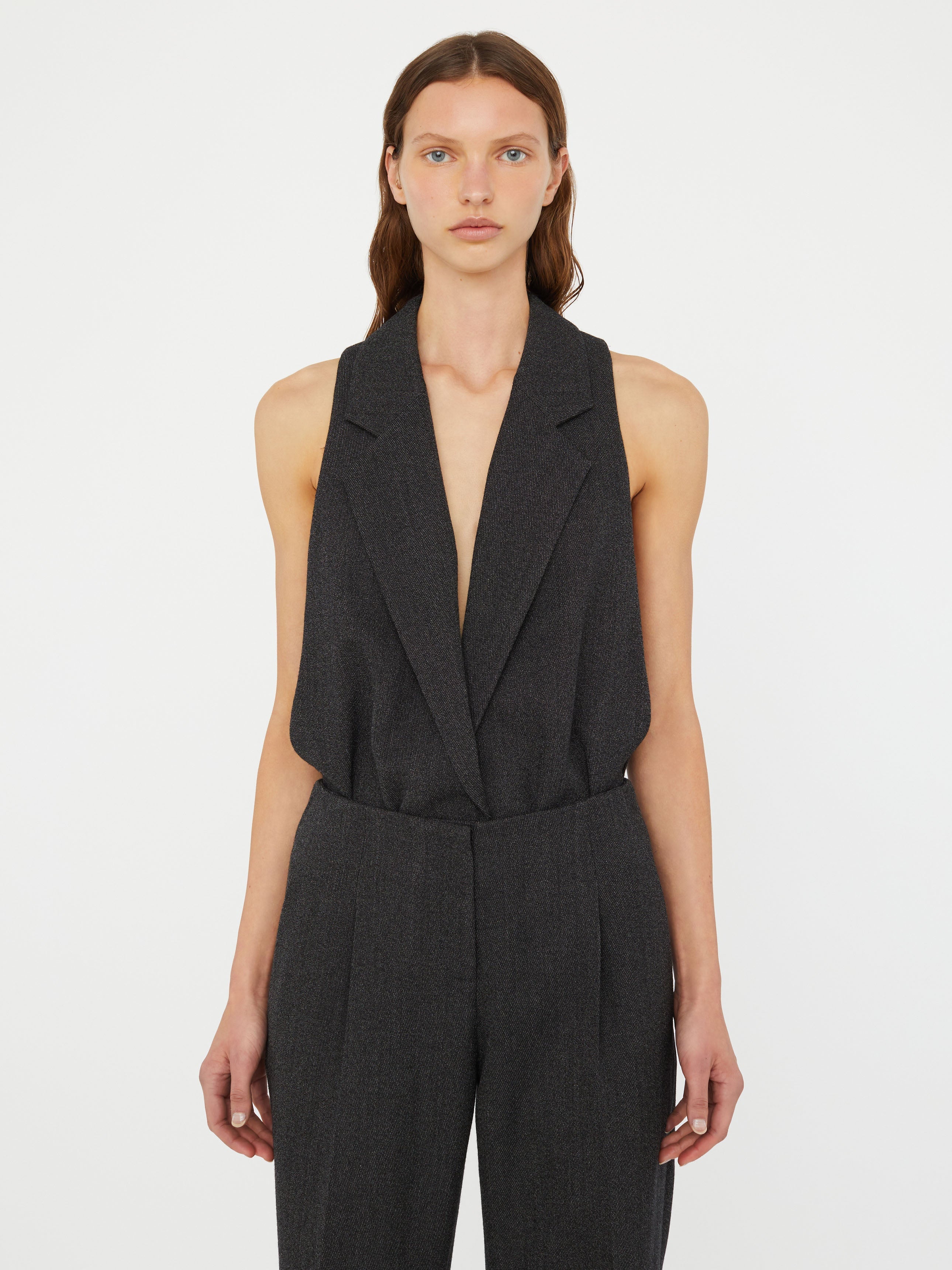 Speckled black twill viscose is tailored into forms brutal and severe. Pieces seemingly demure reveal the body when seen from a different side.