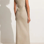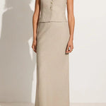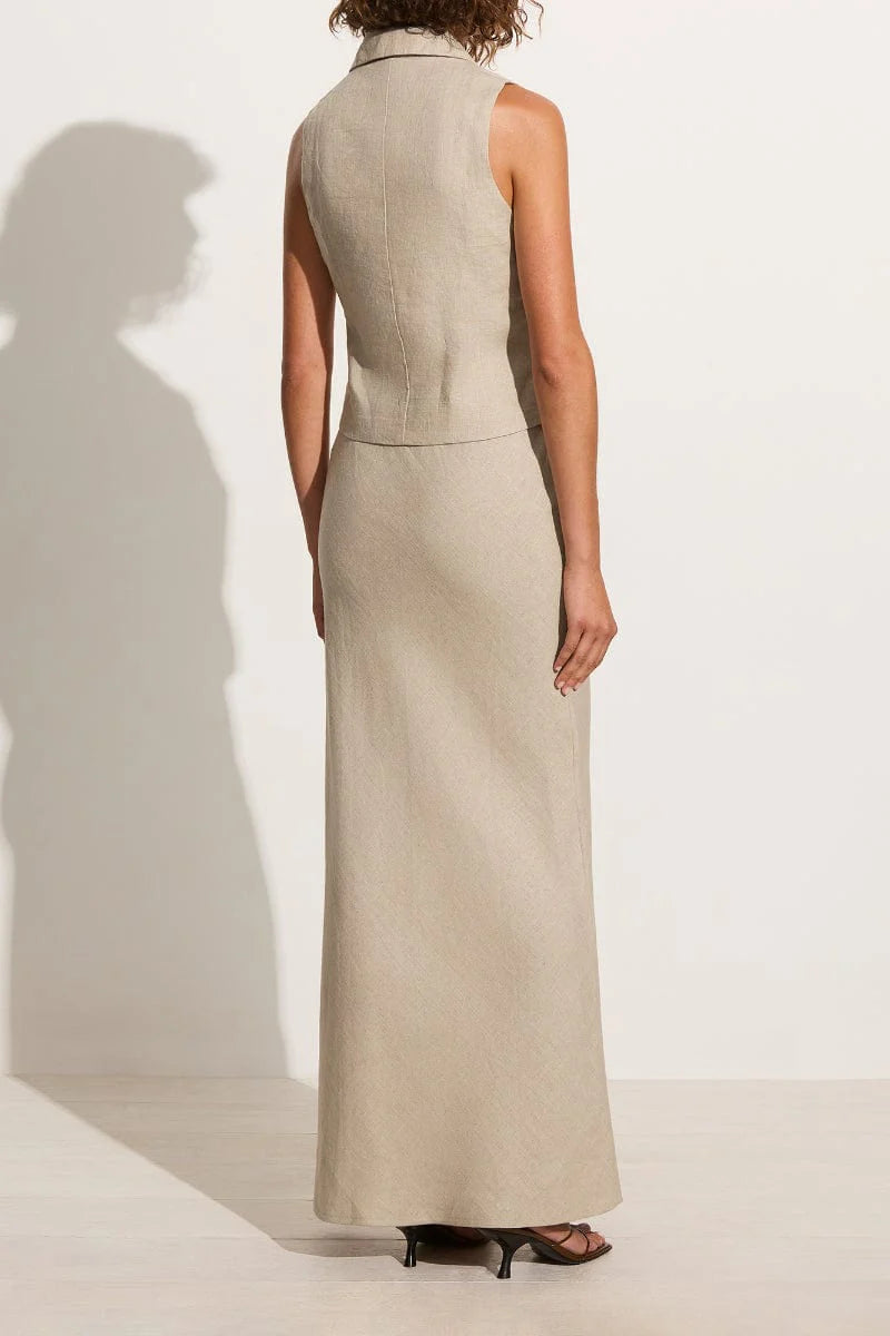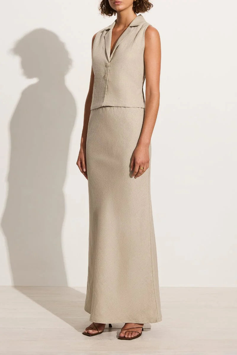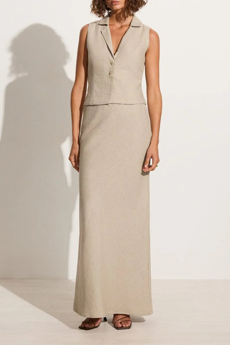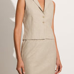 Discover effortless tailoring in the Gabriel Top in Natural. A linen vest top with an open collar, deep v neckline, two-button front and slightly cropped hem to create a flattering silhouette. Crafted from breathable and responsibly sourced linen, the Gabriel is designed to be a summer staple that effortlessly pairs with white linen pants or skirt.