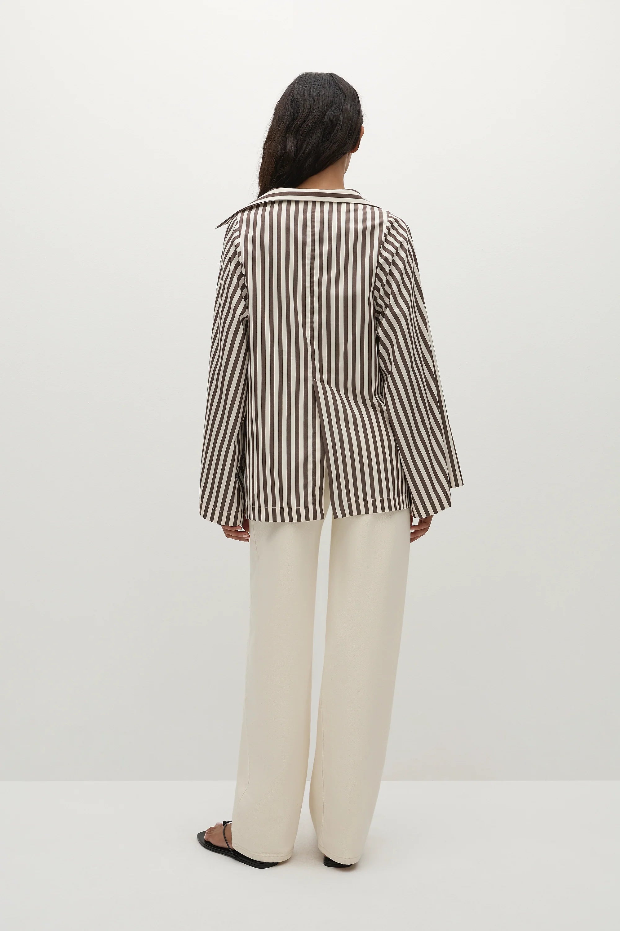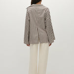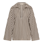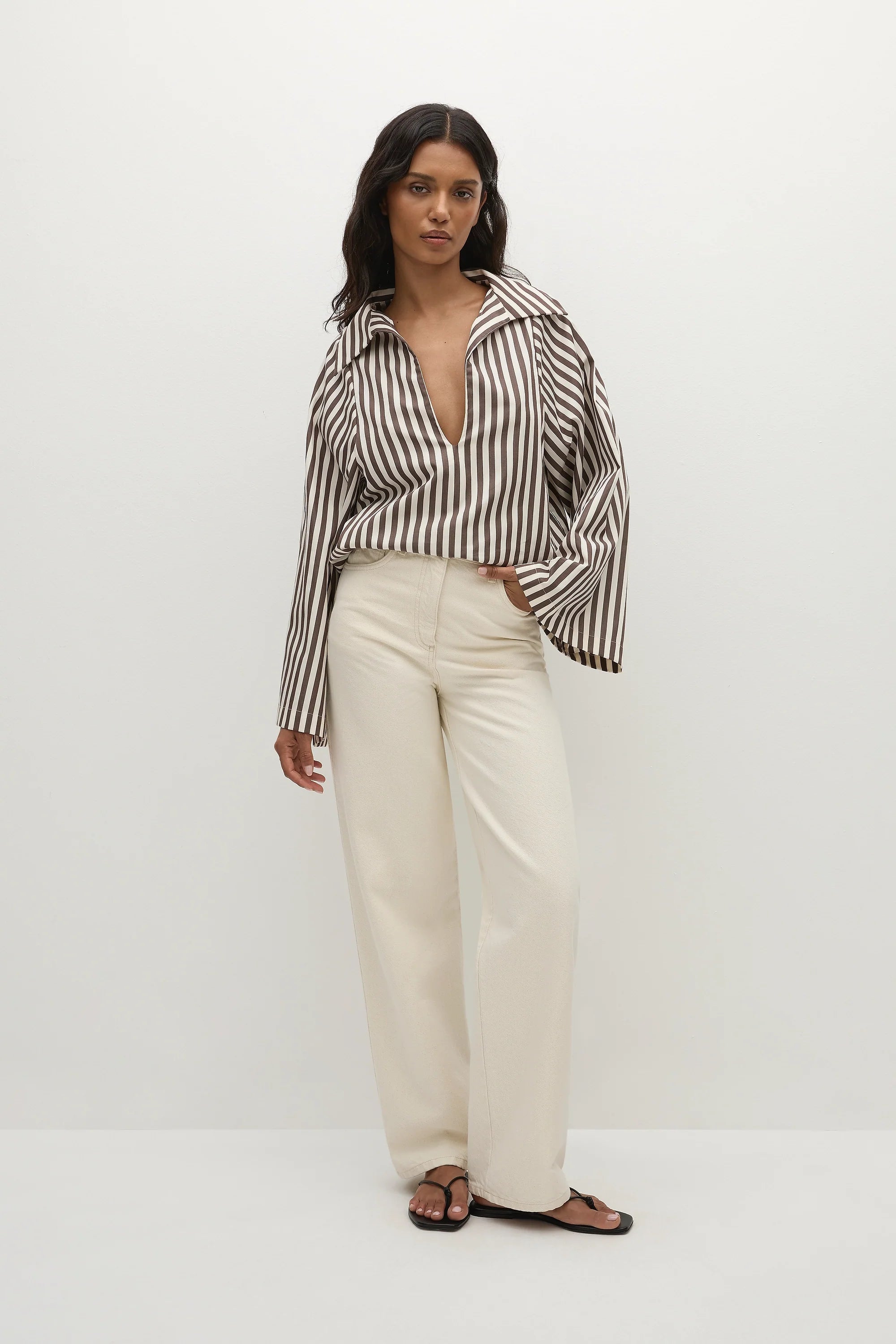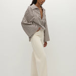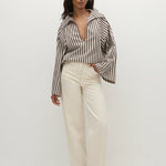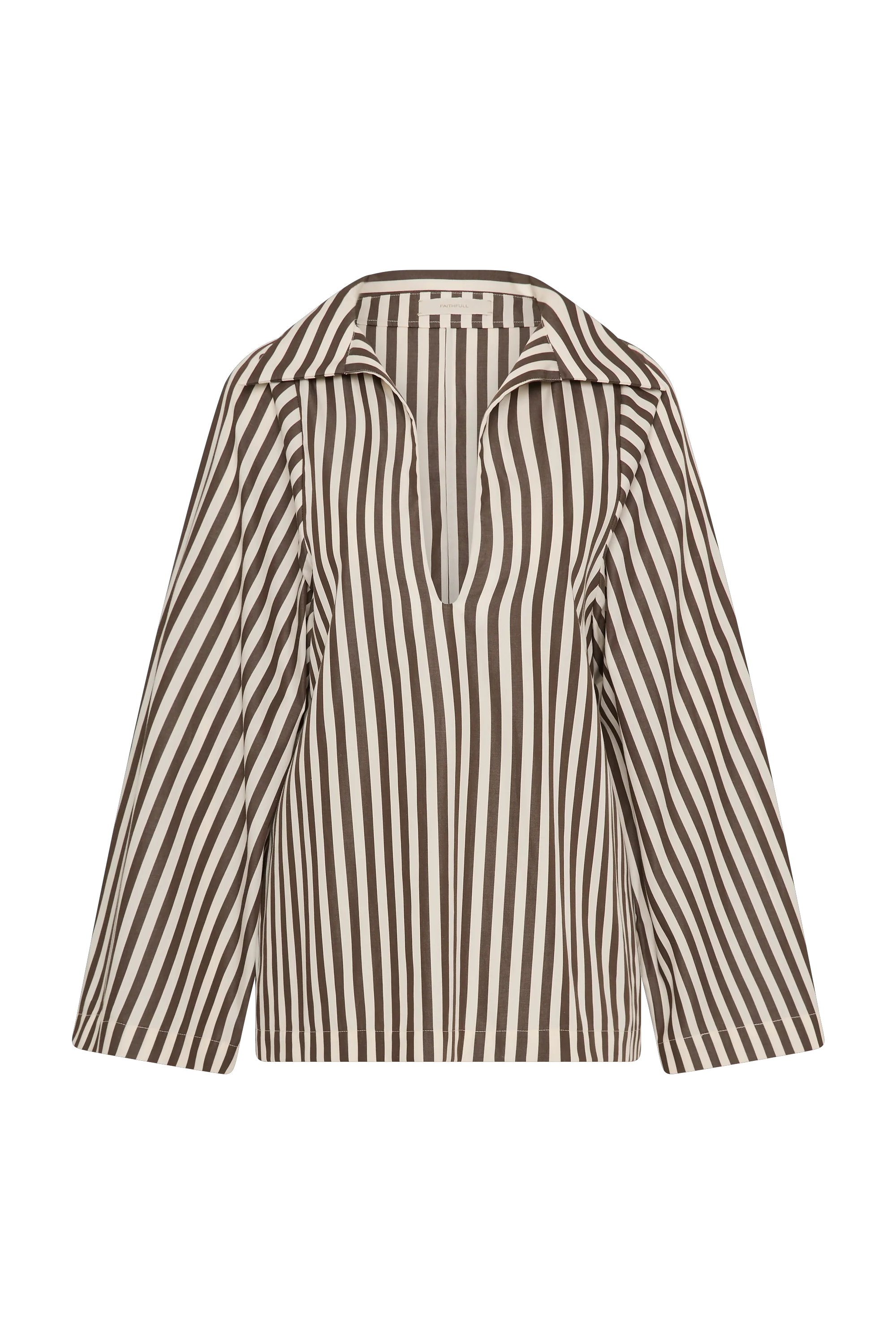 A blouse-style top with a deep V neckline and classic collar. It has long wide sleeves that flared outwards and a relaxed shape for you to tuck effortlessly into your FAITHFULL denim. There is a simple slit at the centre back for a slight feminine touch. It has been designed from from 100% BCI Certified cotton in a chocolate brown and white stripe, inspired by the clean lines of Scandinavian style.