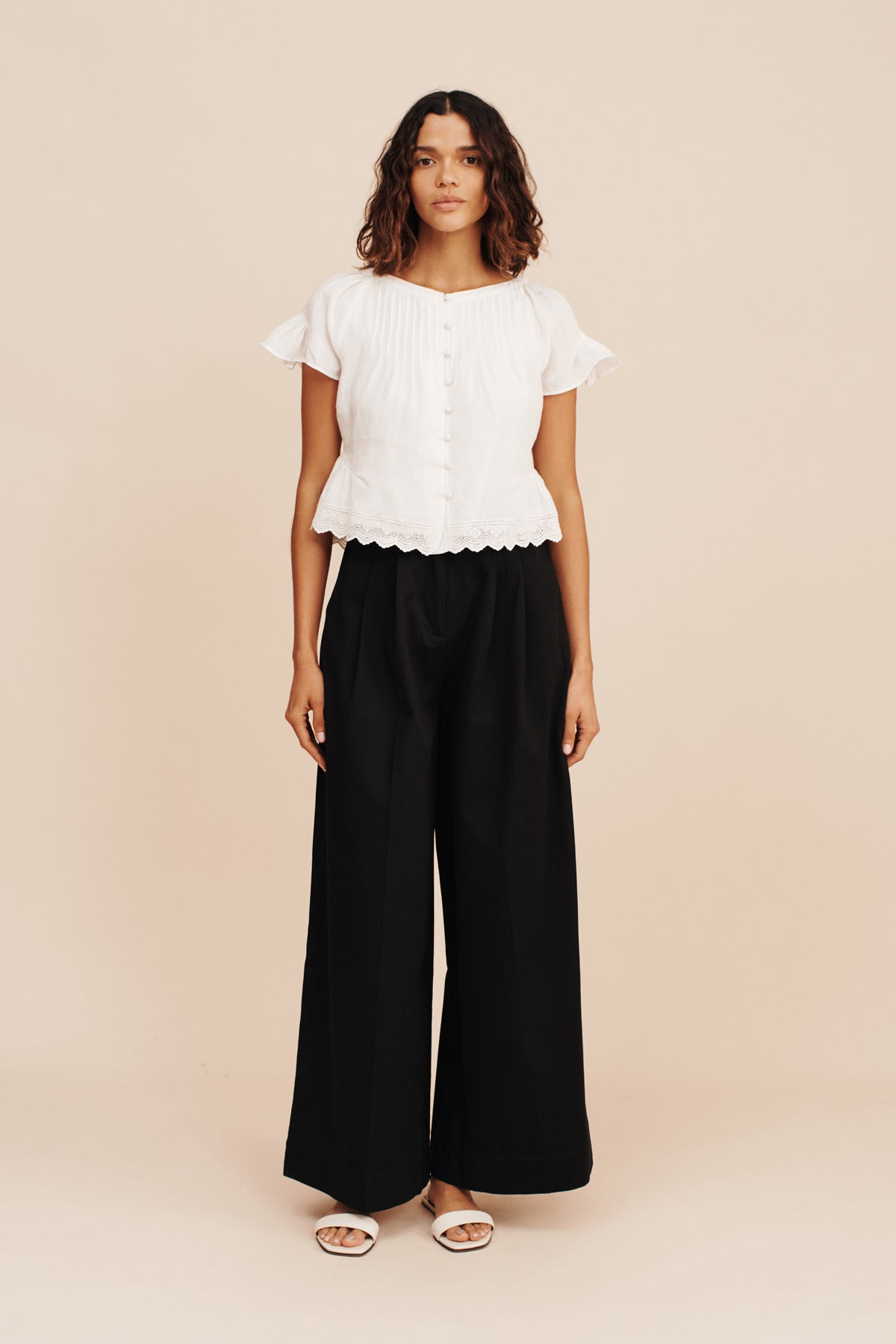 Crafted from lightweight ramie, the antique-inspired Grace Blouse features an elegant high neckline framed by clustered pintucks and short flutter sleeves. It fastens with a row of petite buttons before falling to a floaty hem adorned with a scalloped lace trim.