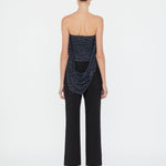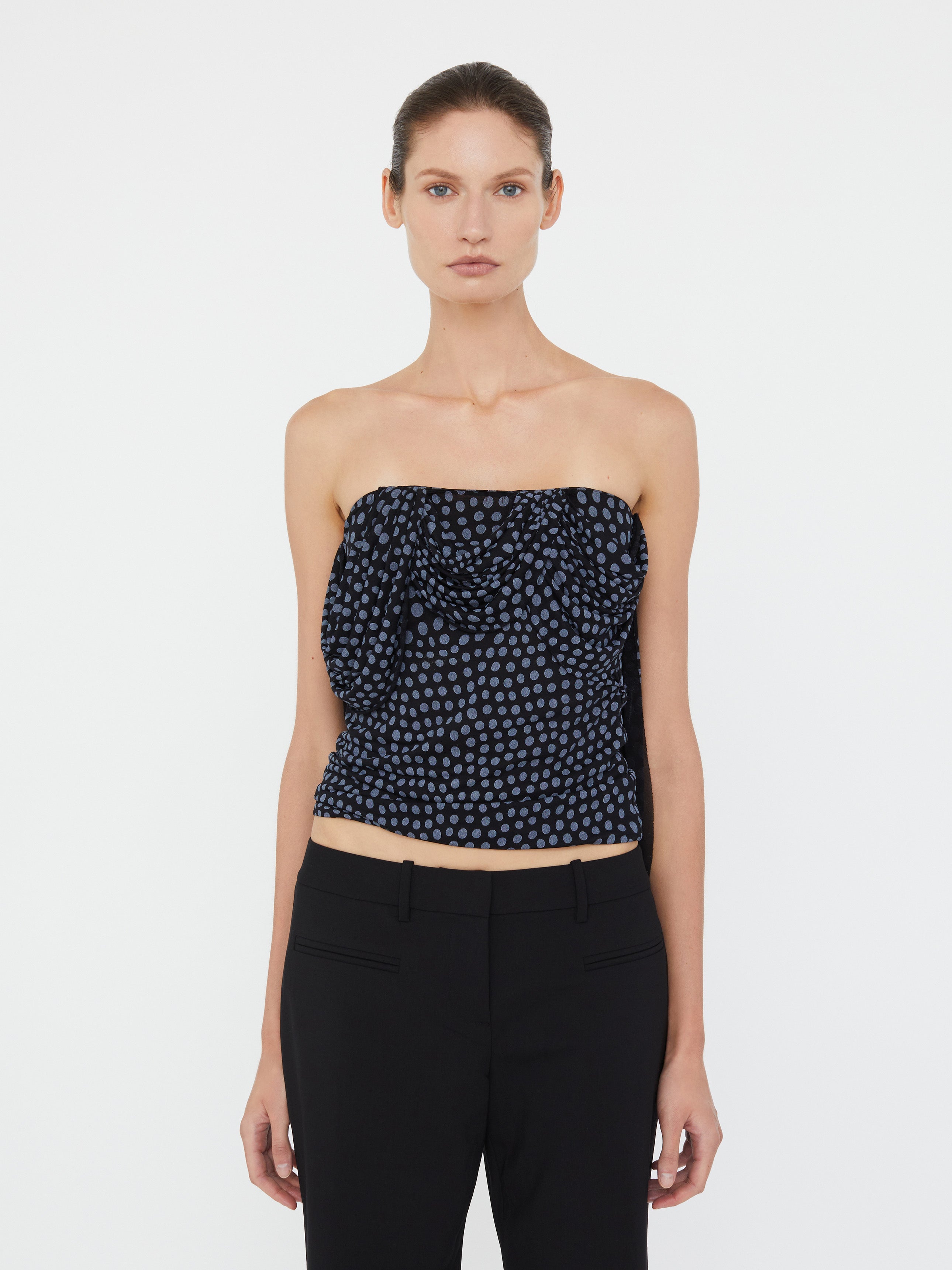 Blue on black warped polka dot print channels low-tech 90s and the subtle chaos of a summer rain shower. Warped dot is gathered, tucked and cinched to distortion with panels that appear to float away from the body, layered over a bodice silhouette.