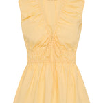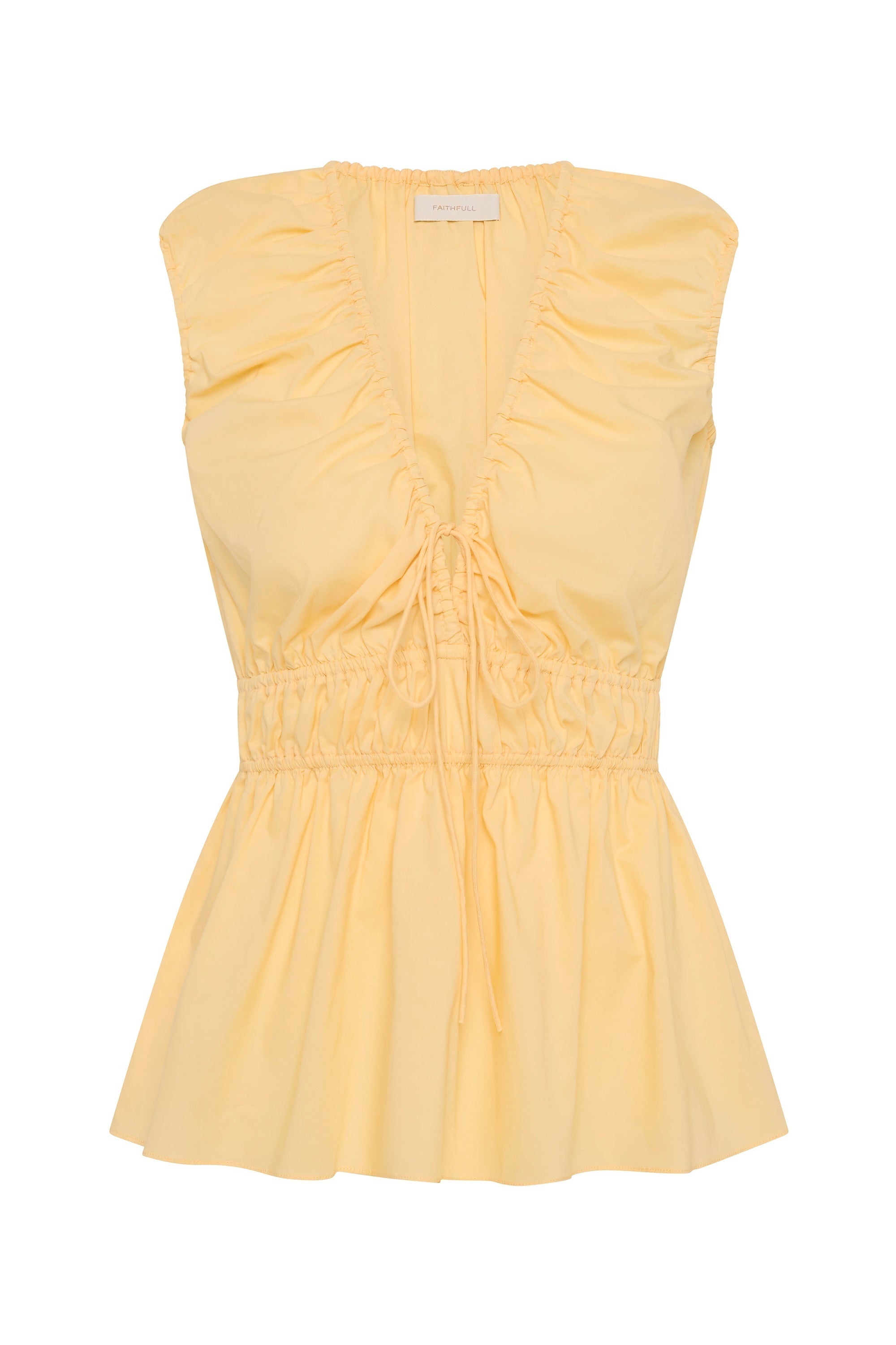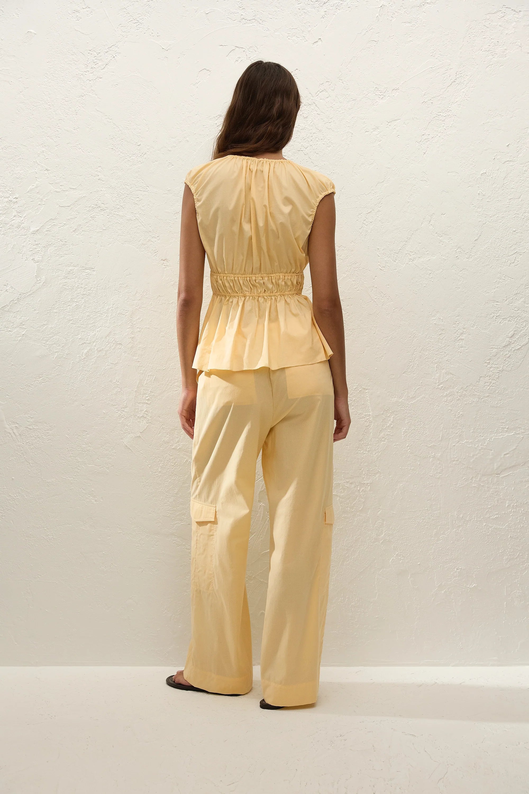 An elevated everyday top, designed from a signature 100% BCI Certified organic cotton yarn-dyed in a warm yellow. Featuring an elasticated V-neckline with a front tie detail, it cinches in at the waist with a channelled elastic waistband. From there it flares into a peplum hem that crops around the hips. Versatile in styling, wear with the Straight Jean.