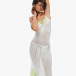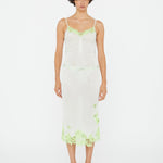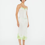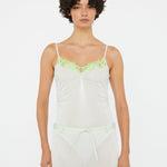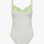 A sheer knit bodysuit trimmed with contrast floral embroidery along the neckline. Designed with fine straps and soft ruching at the bust, the silhouette is fitted and fluid - balancing delicacy and structure through subtle detailing.