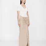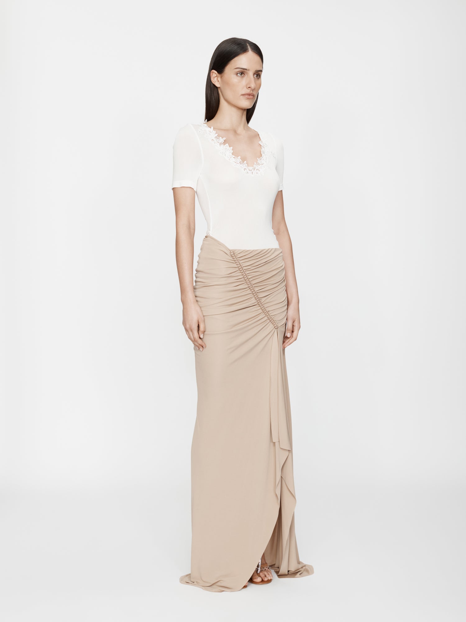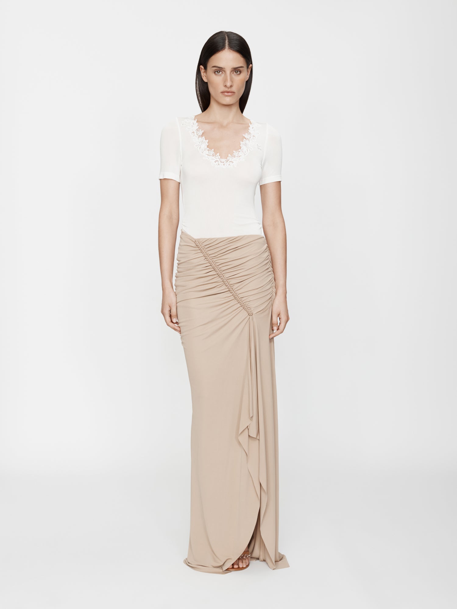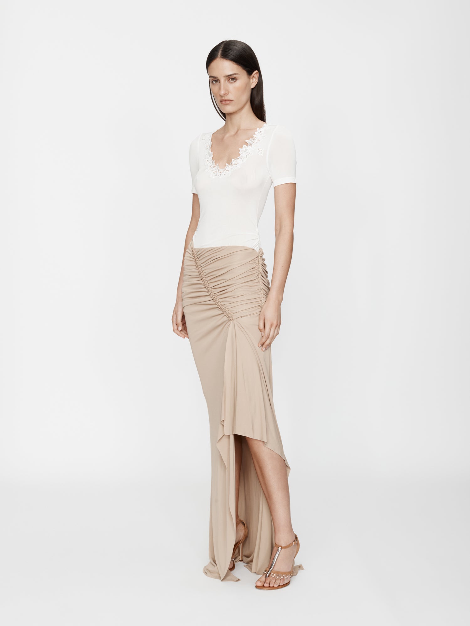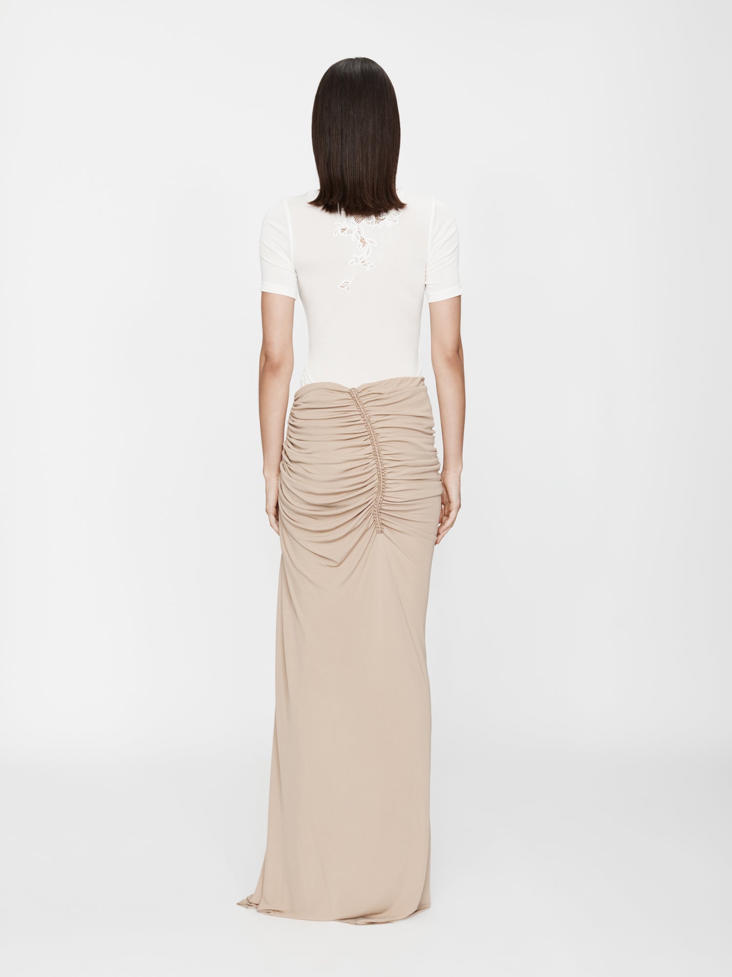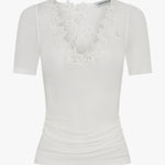 A sheer ribbed knit tee refined with tonal floral embroidery along a deep scoop neckline. Fitted through the body with short sleeves and soft stretch, the silhouette offers everyday ease with a delicate finish.