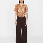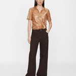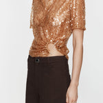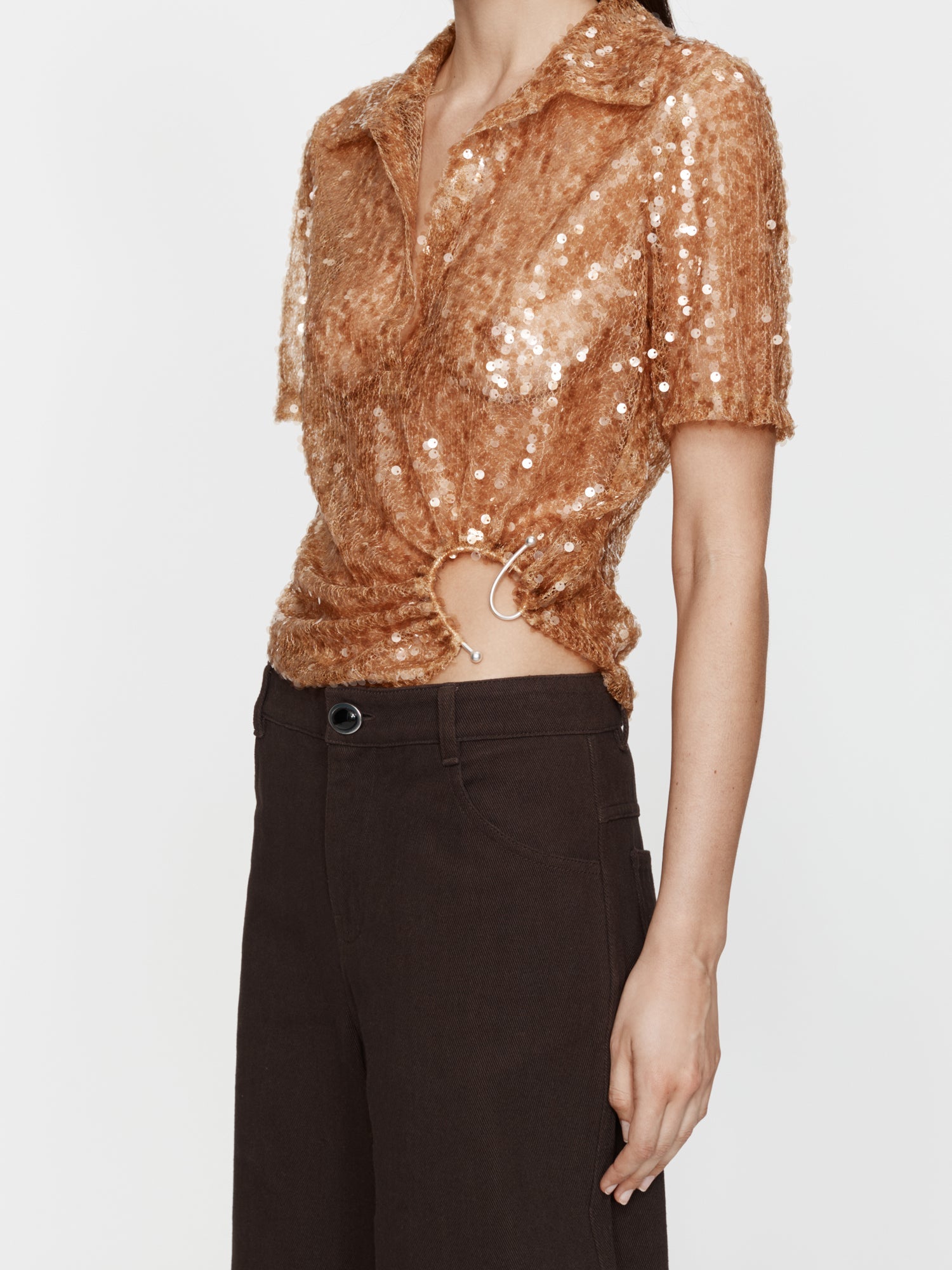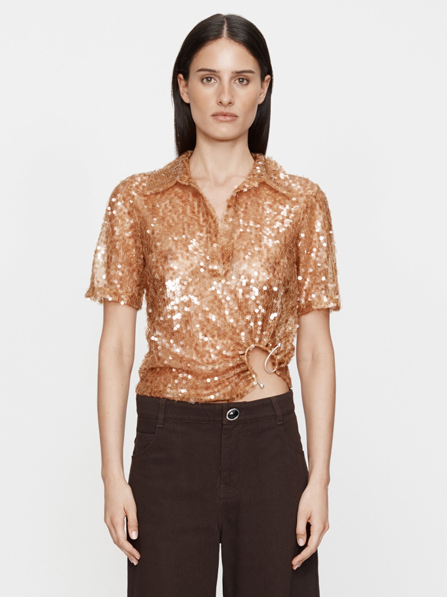 A reimagined classic polo silhouette, this short-sleeve top is crafted from sheer embroidered silk with bronze sequins. Designed with a soft collar, button-down front and draped wrap detail at the waist, it is anchored by a polished ring fastening for subtle hardware contrast.
