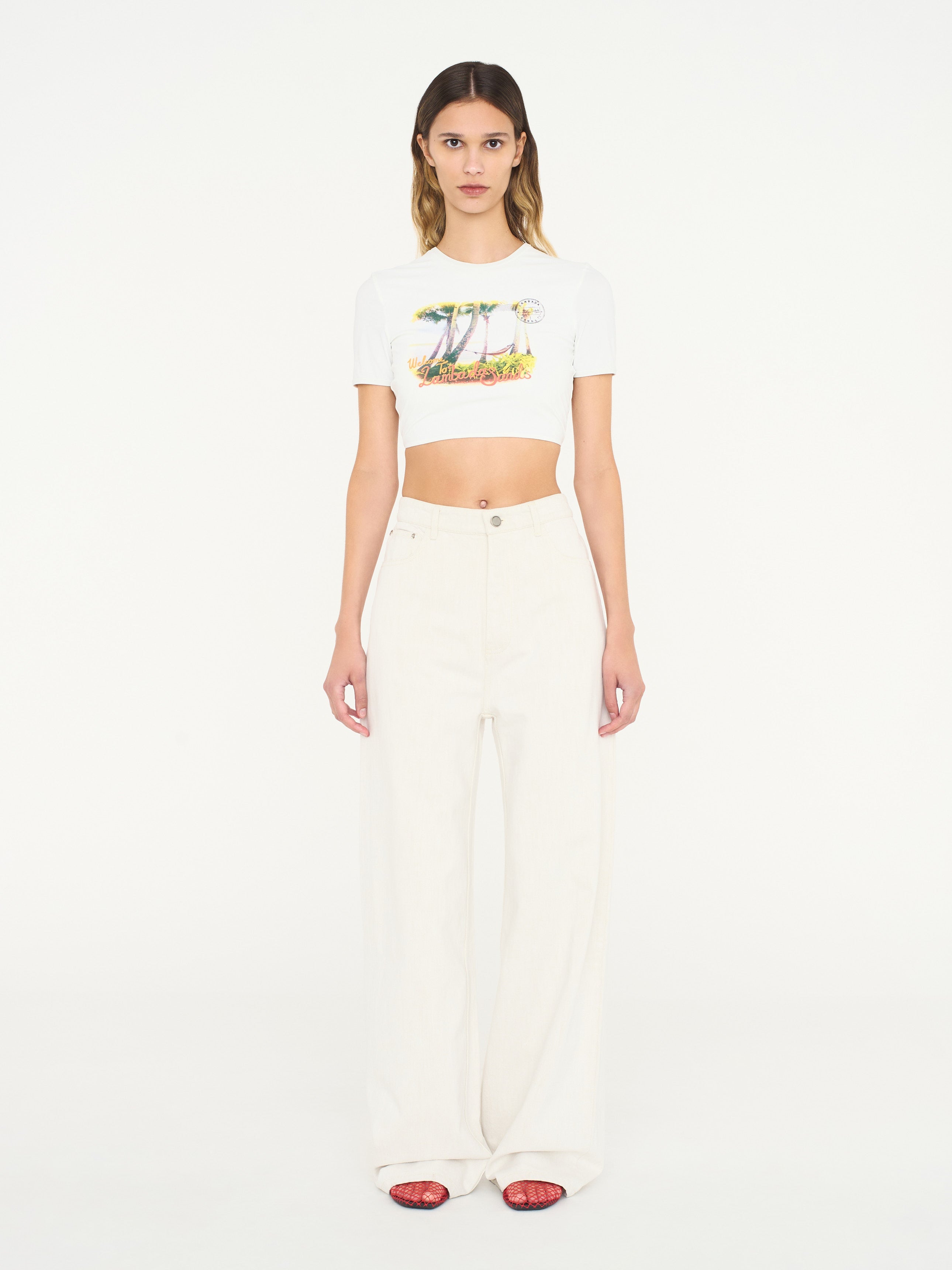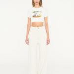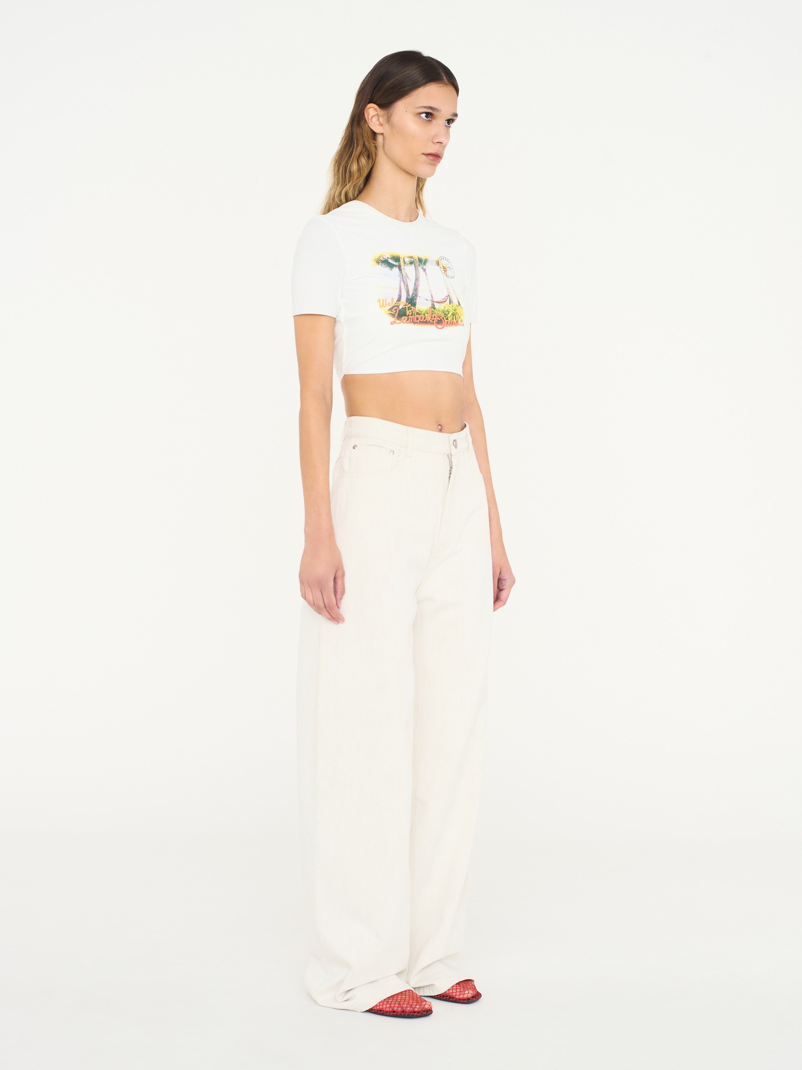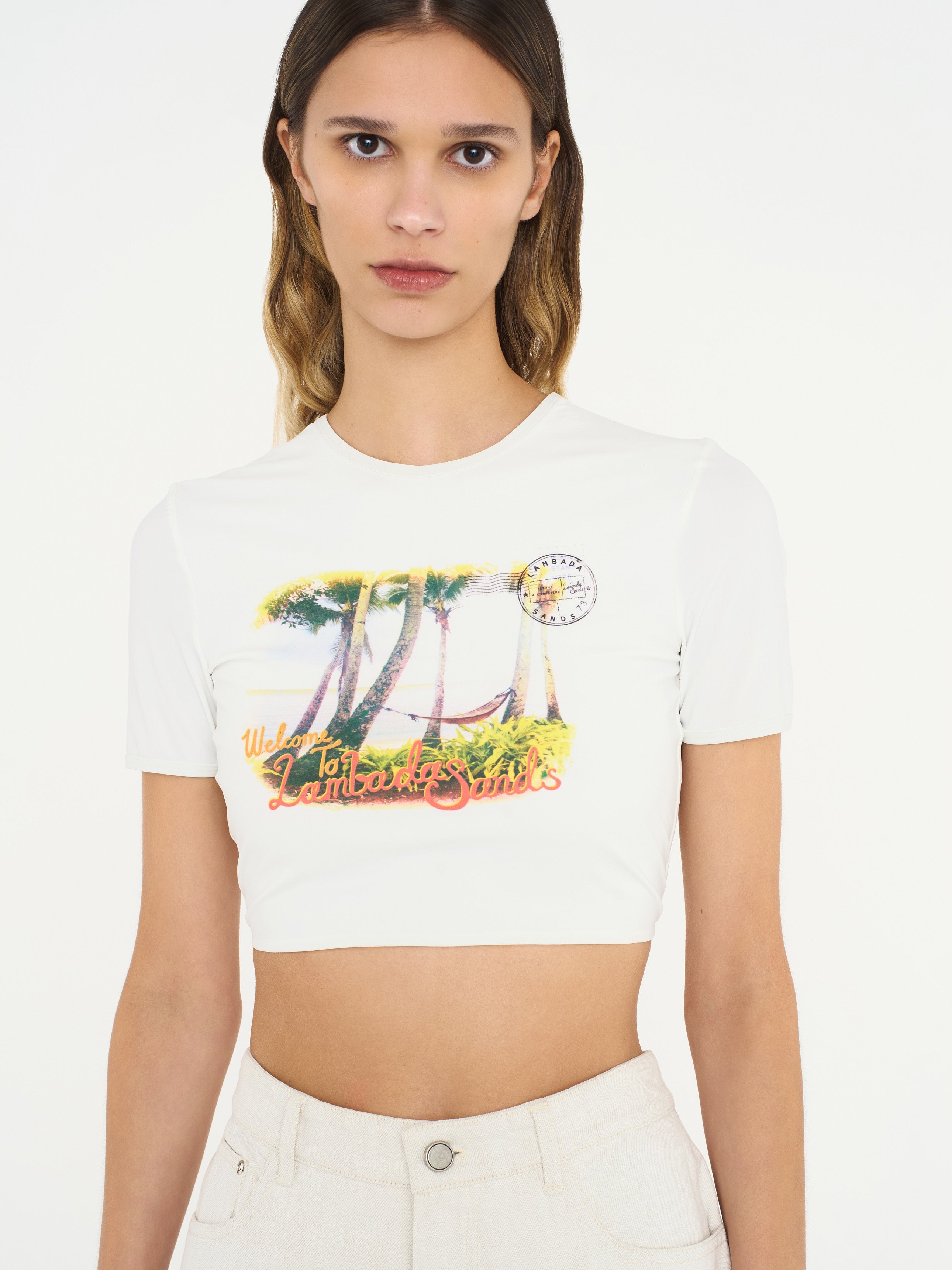 Lambada Sands - an idealistic escape embodying nostalgia for balmy days. This white crop tee is crafted in a matte printed lycra, finished with an open back cut out that self ties.