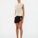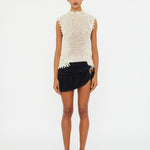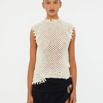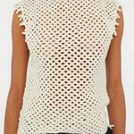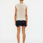 Crafted in an open crochet stitch, the sleeveless construction is exaggerated with texture and soft structure. The sculpted neckline forms a sharp raw finish, while the hem and edges are trimmed with exaggerated fringe loops.