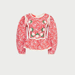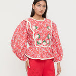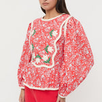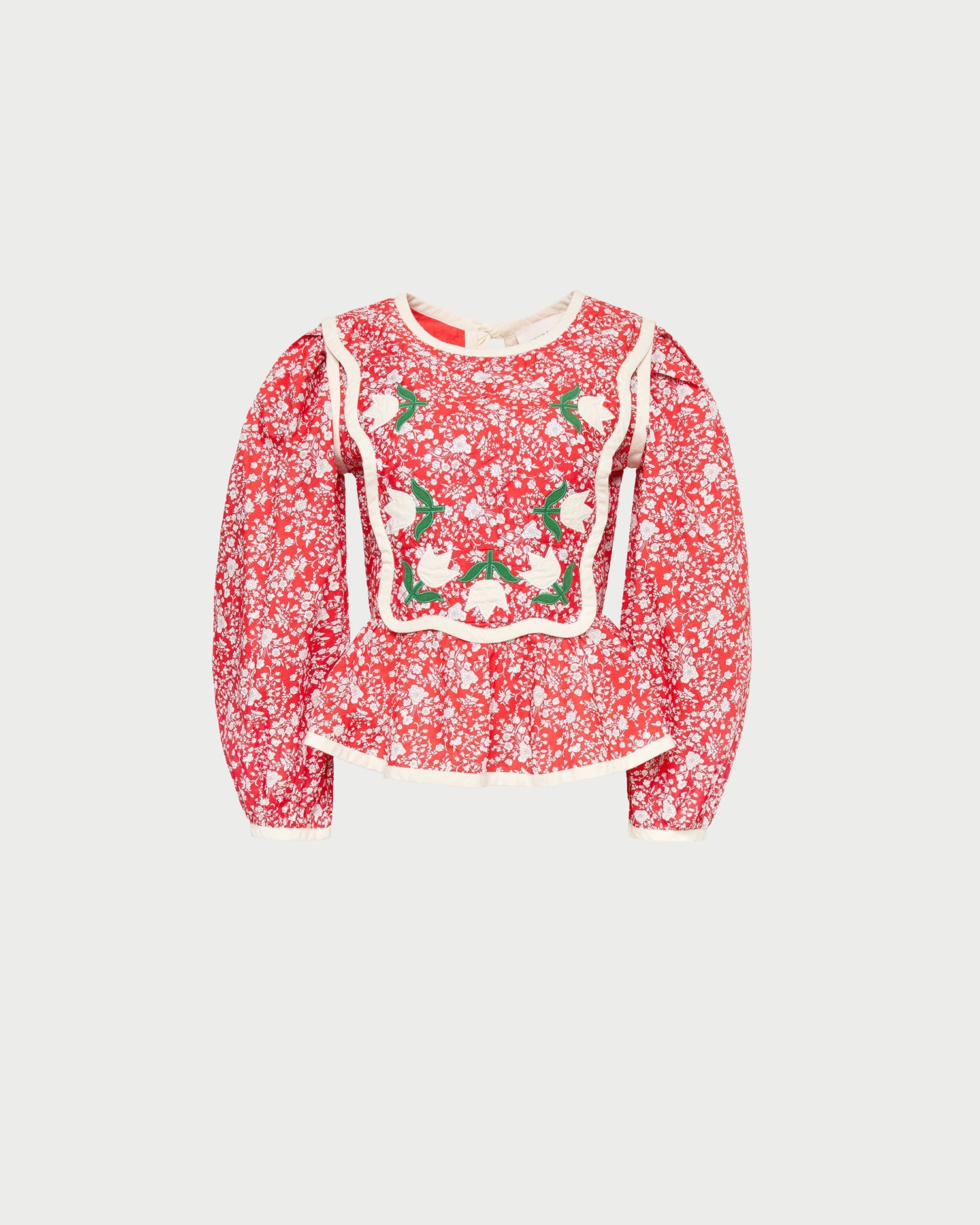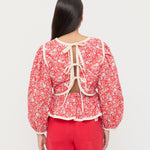 Blouse in red rosette floral cotton. Features a quilted texture, back ties, and elastic along the back of the waist for a secure fit, a wavy yoke detail with delicate contrast trim, and delicate appliqué floral details. Inspired by our best-selling Laney Dress.