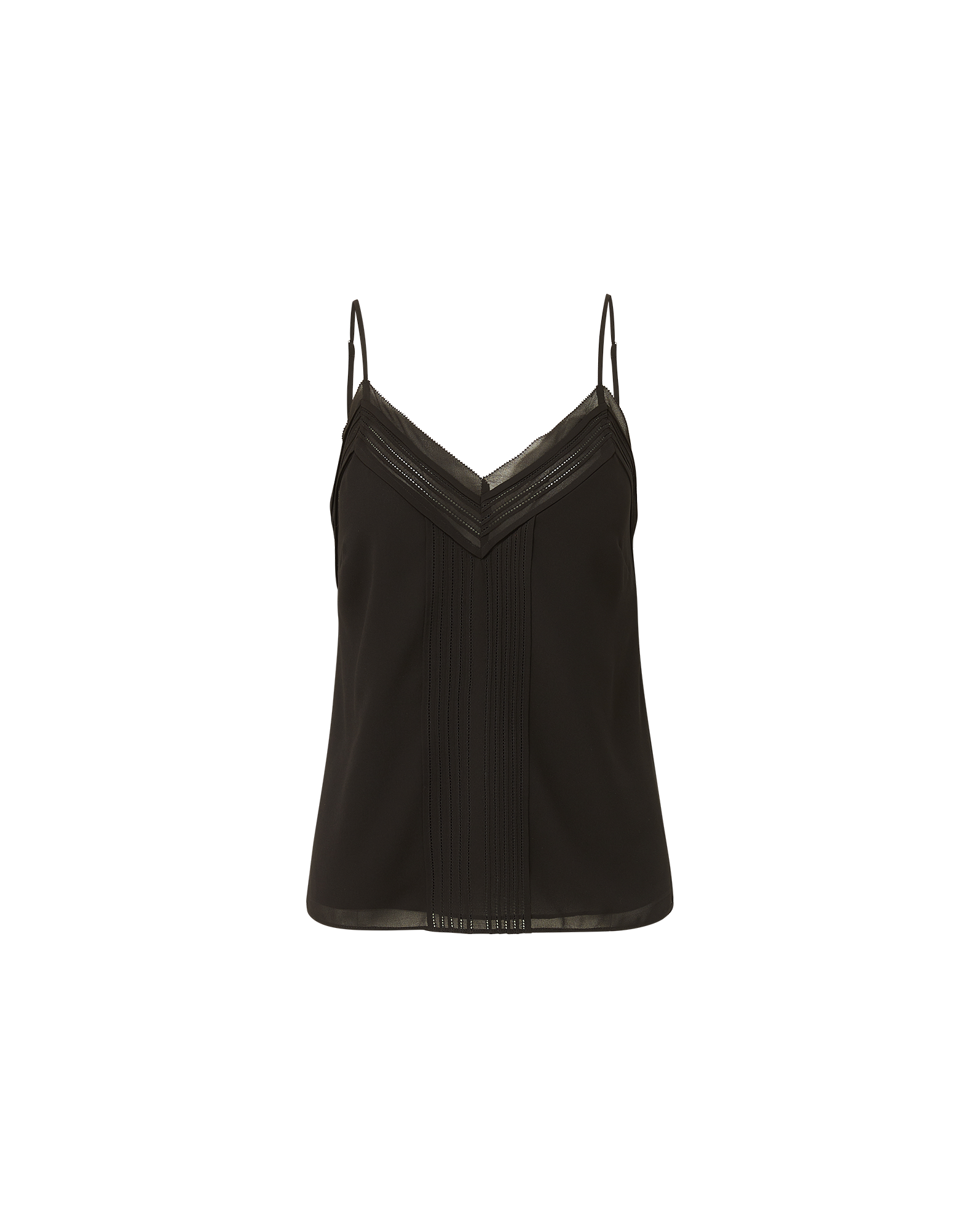 Simple, sleek, and effortlessly elegant. Available in black and white, the Maray cami will be a versatile addition to your wardrobe. Crafted from a paper-thin, silk-like fabrication, this airy tank top features a relaxed silhouette, spaghetti straps, and pin-tucked details. Sheer panels by the neckline add to the allure. Layer under blazers for work or wear on its own with skinny jeans for a chic night out.
