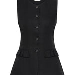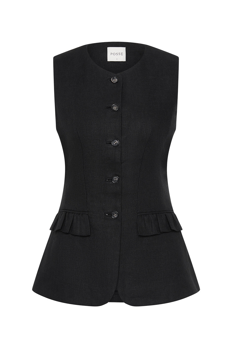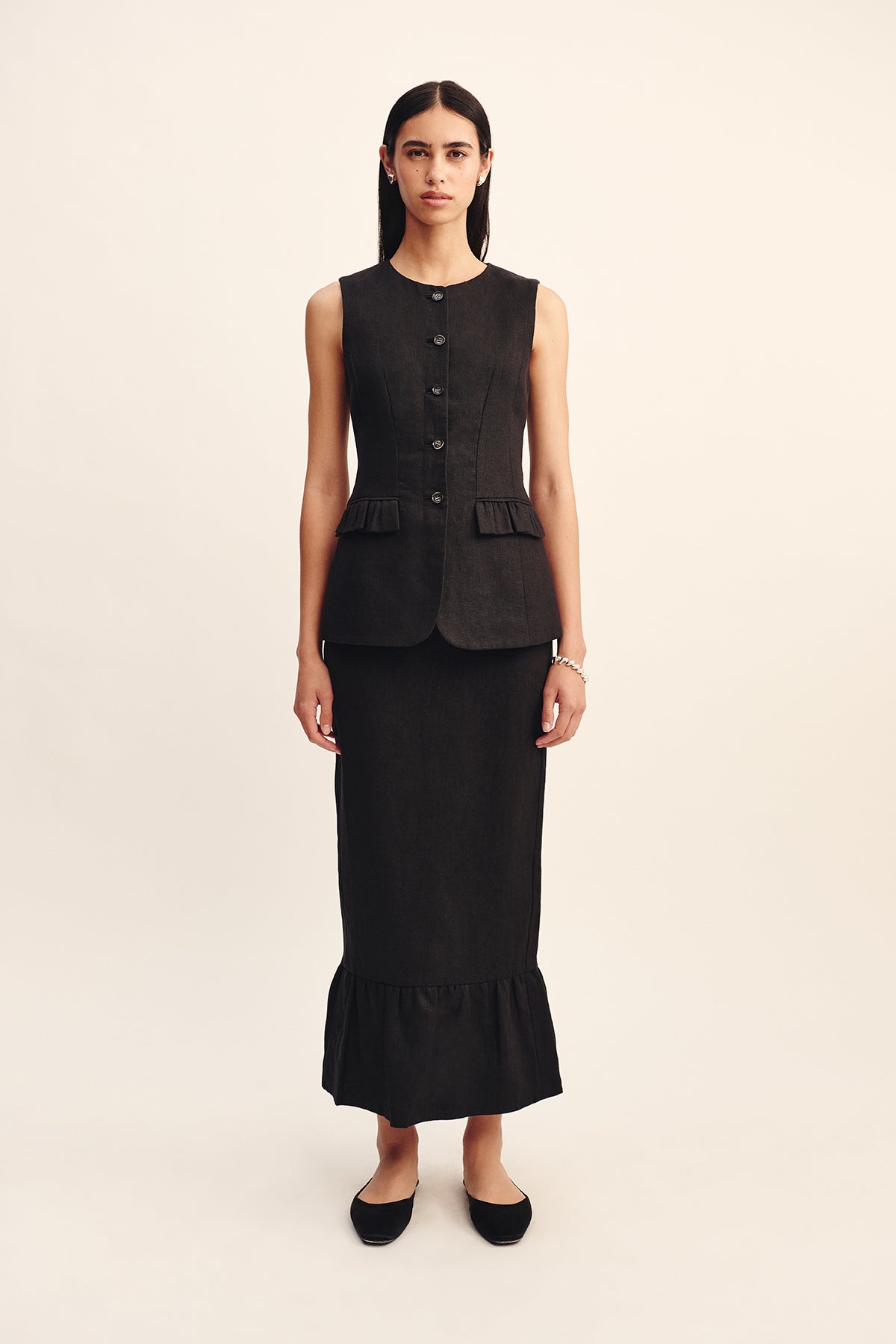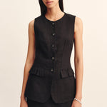 Tailored from premium linen, the Matilda Gilet is designed for a close, flattering fit. It fastens with a row of mottled buttons before falling to a curved hem. The welt pockets are trimmed with delicate frills which can be worn out or tucked in if desired.