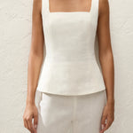 An elevated everyday top, designed from a signature 100% European Flax® linen in a warm white. With a square neckline and wide shoulder straps, it is fitted through the bodice before cinching in slightly at the waist and flaring into a peplum hem that crops around the hips. Softly tailored but with an ease of wear, styling with the matching Valeria Capri for timeless set dressing.