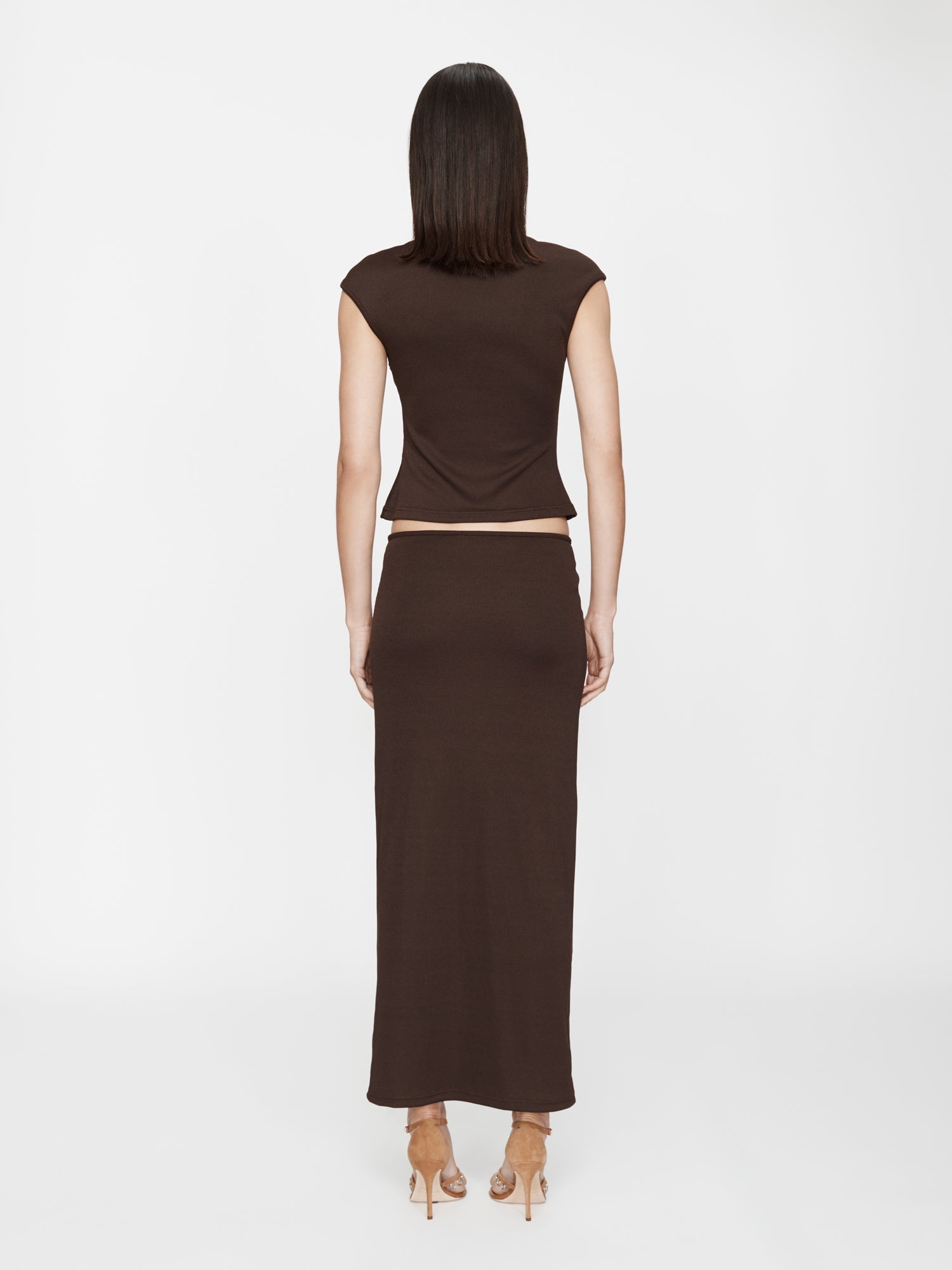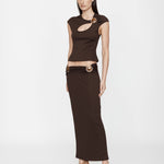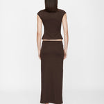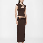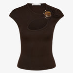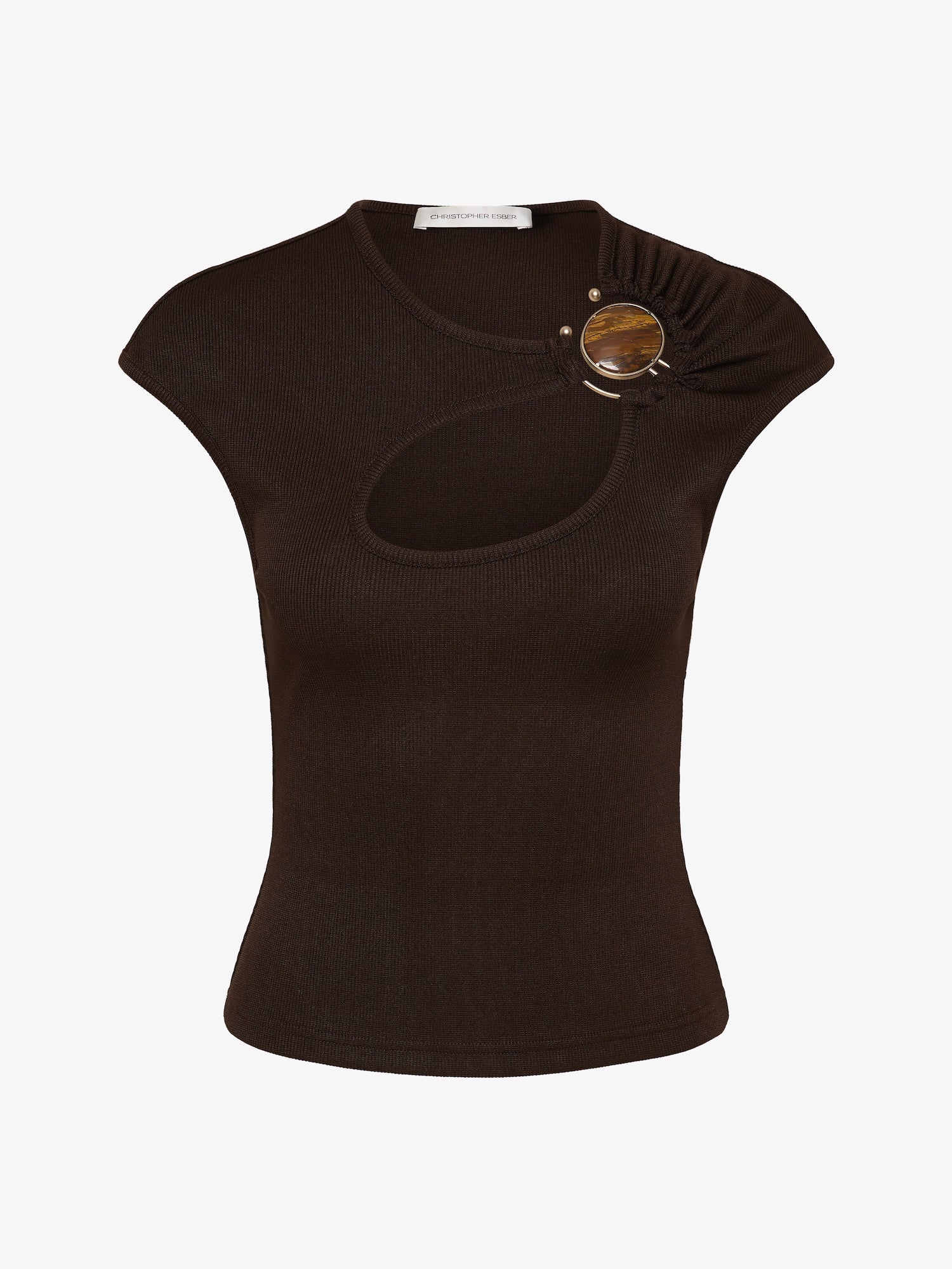 Cut in stretch rib with a close, flattering fit, the silhouette is punctuated by an off-centre cutout, anchored by a custom tiger’s eye resin ring. Cap sleeves and a high neckline maintain balance and ease.