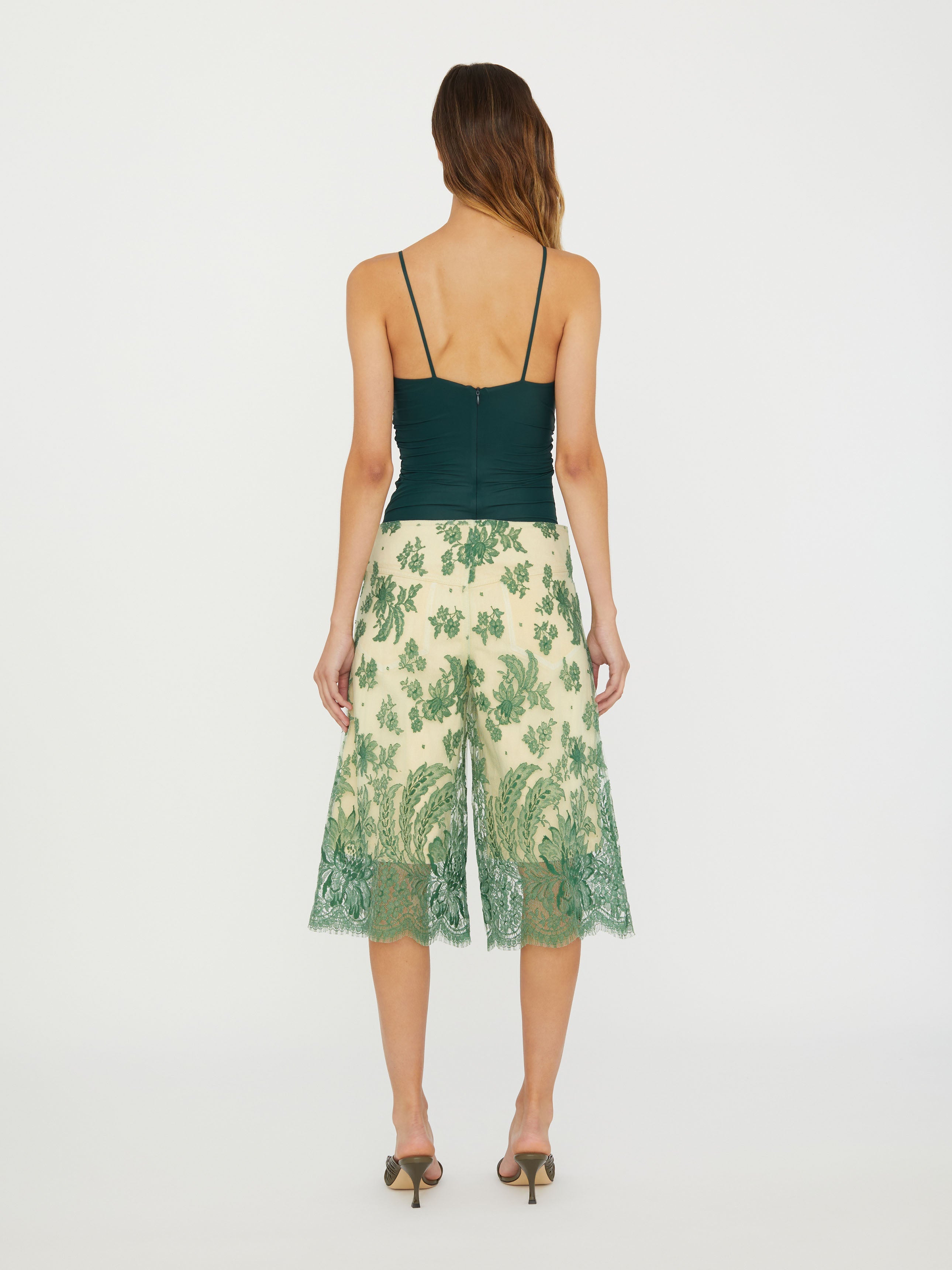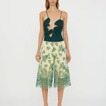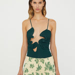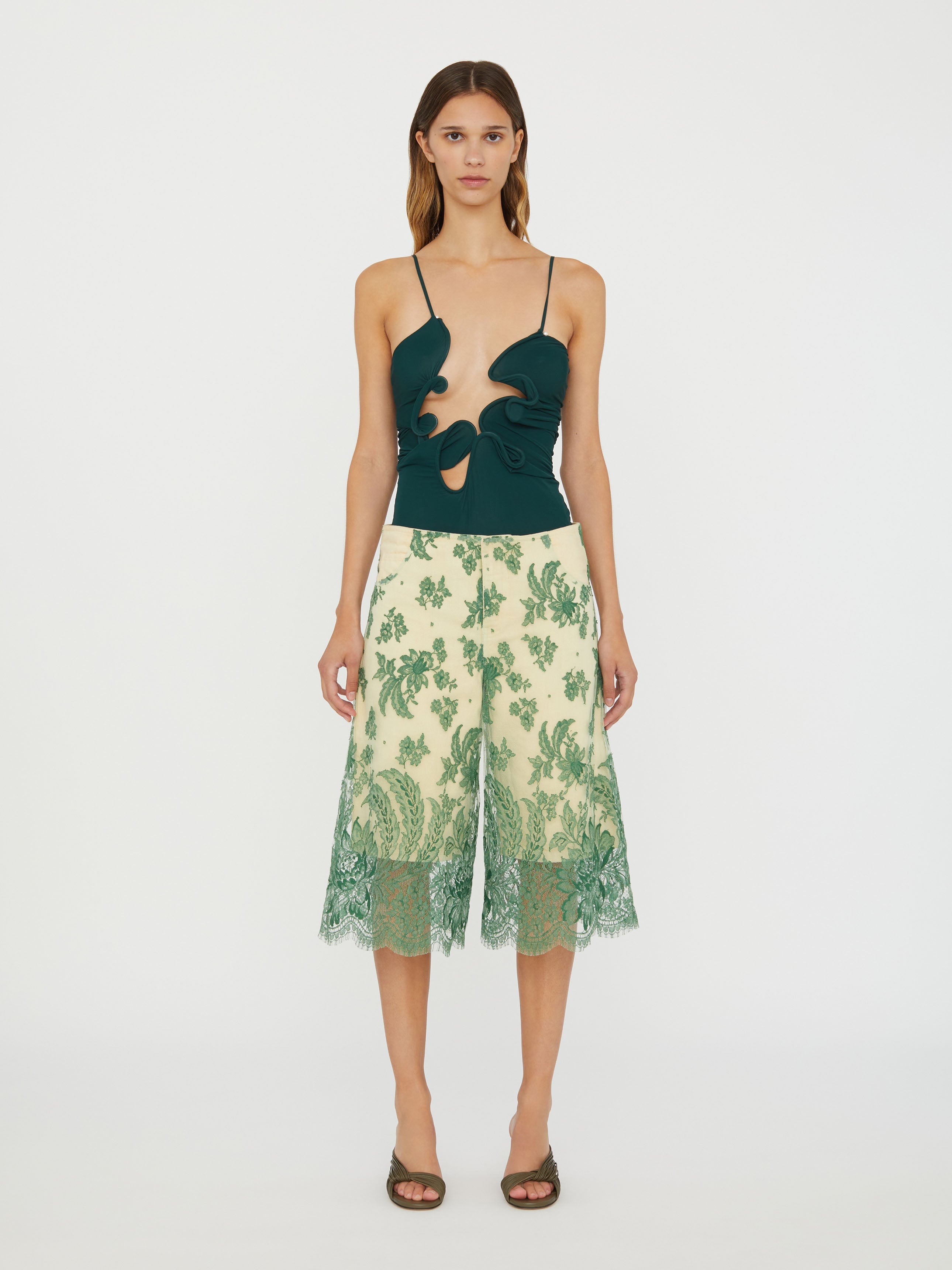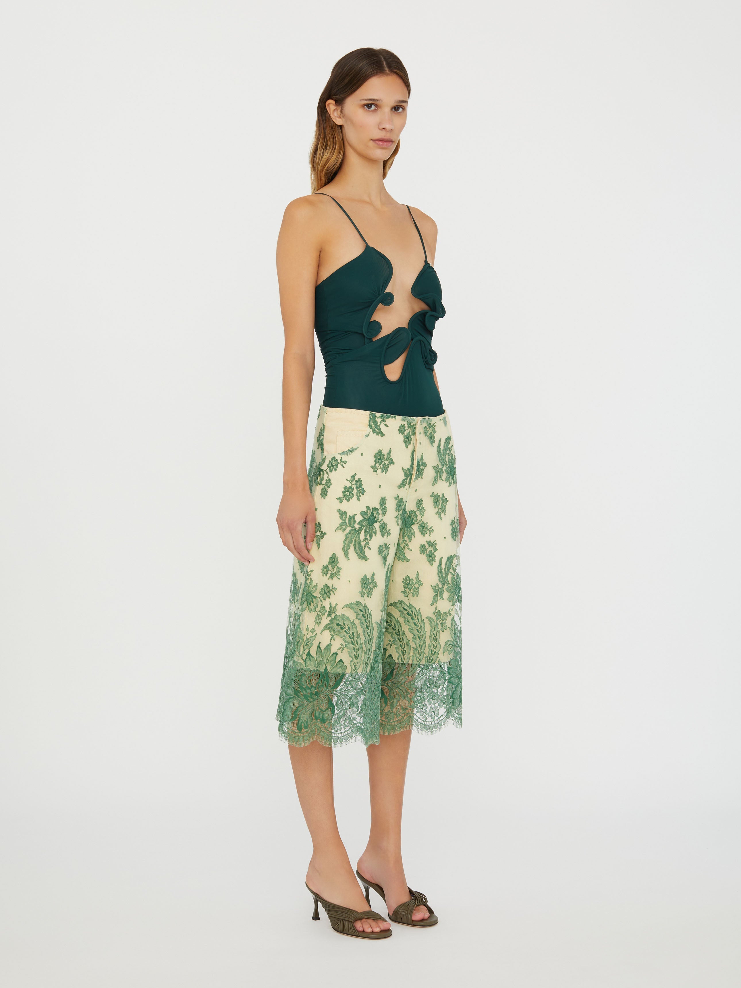Sculptural hardware anchors fine Italian jersey to form around the body. A refined sleeveless body suit exposes the decolletage, finished with pearlescent hardware.