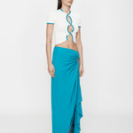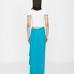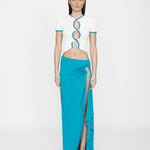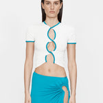 Codes of everyday wear spark curiosity with this contrast bind tee. Fine rib stretches with ease over the body while considered twist cut out detail draws the eye in.