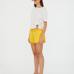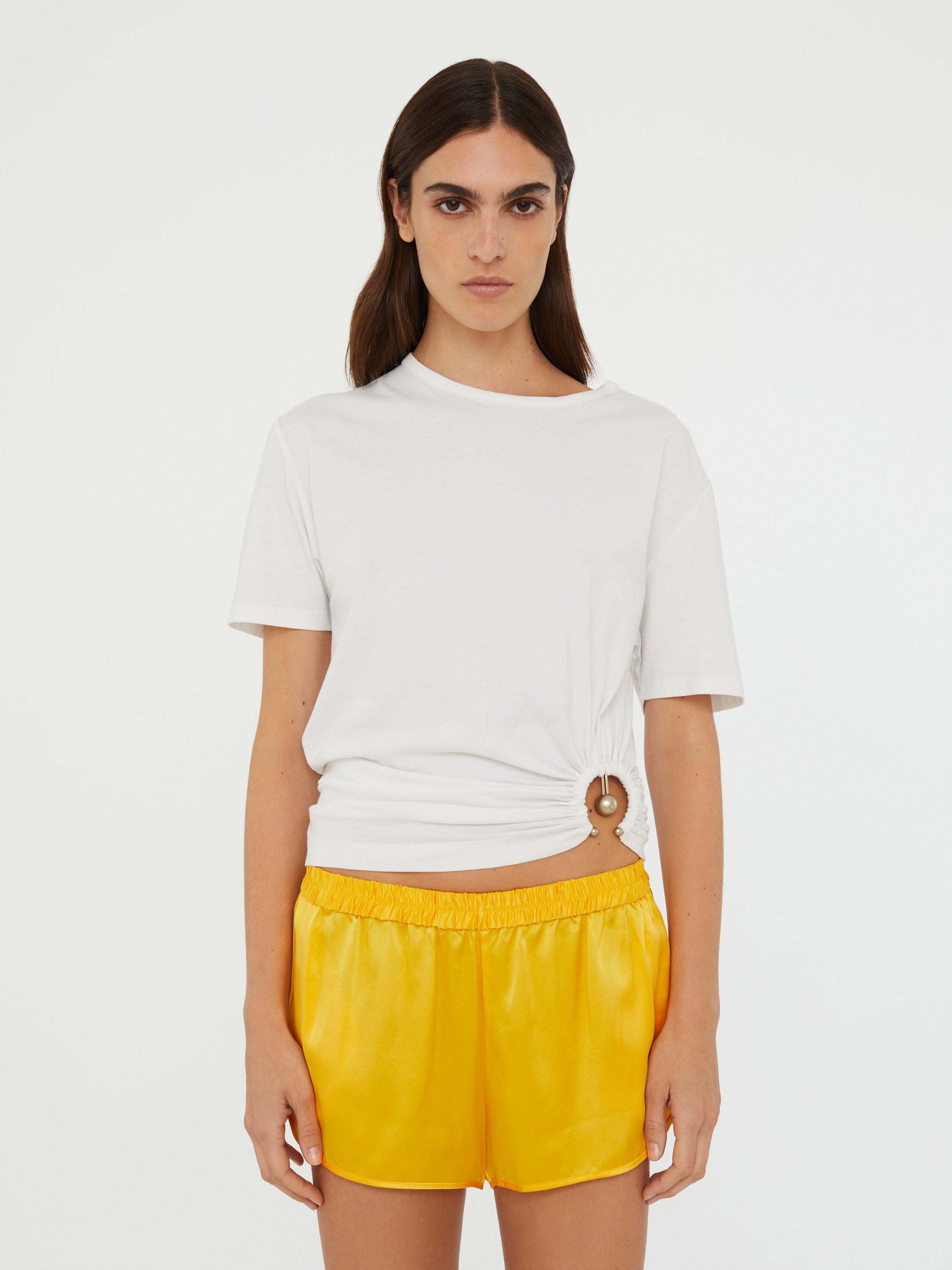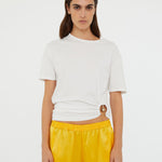Hooked with a sculpted metal adornment, this scooped tee is ruched and anchored by signature orb hardware.