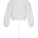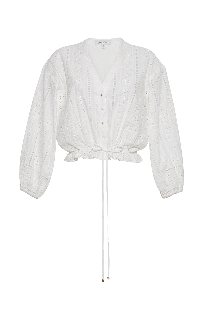 Cut from airy cotton eyelet, the Perrin Top has an easy, oversized silhouette that gathers with drawstring ties at the cropped hem. Wear it as a set with the matching Melanie Skirt.