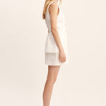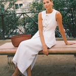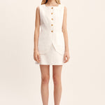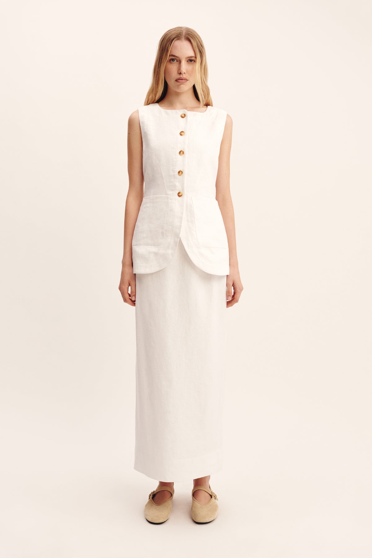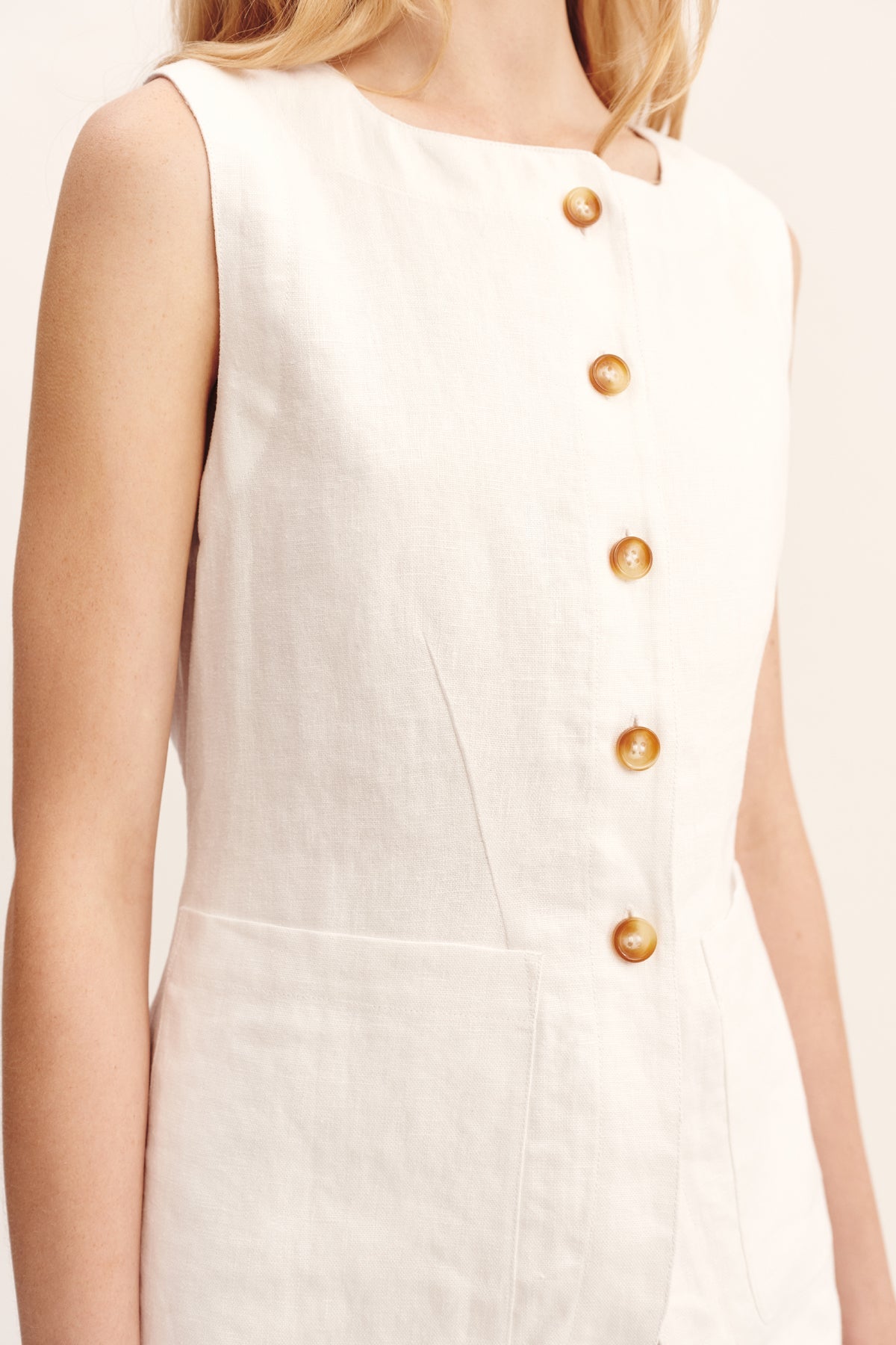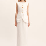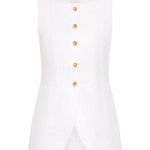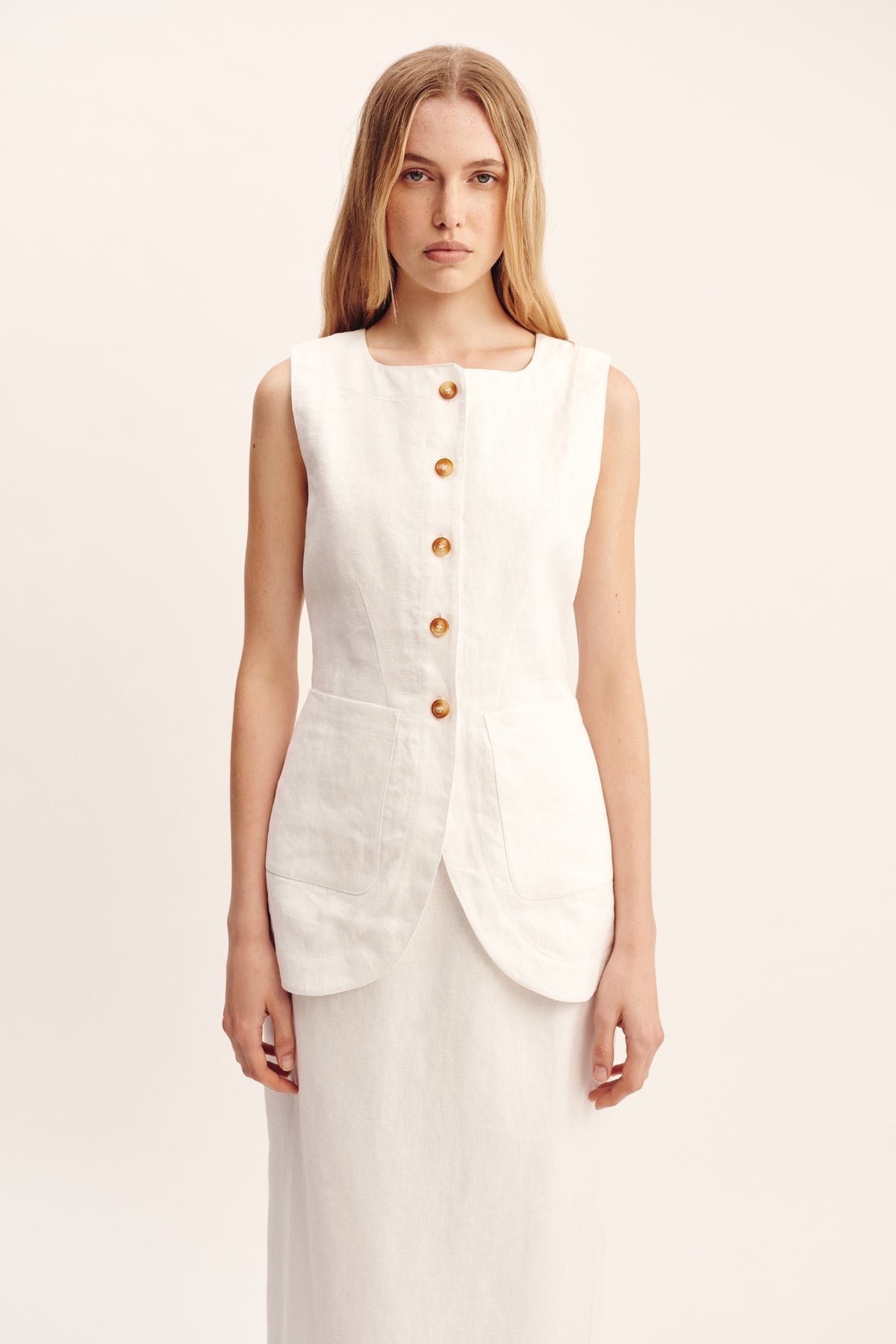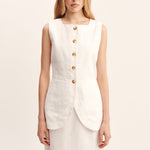 A POSSE signature, the Emma Vest is tailored from premium linen in a structured, classic silhouette. It features a refined high neckline, scooped hem and mottled buttons through the centre front, with an adjustable back buckle to perfect the fit.