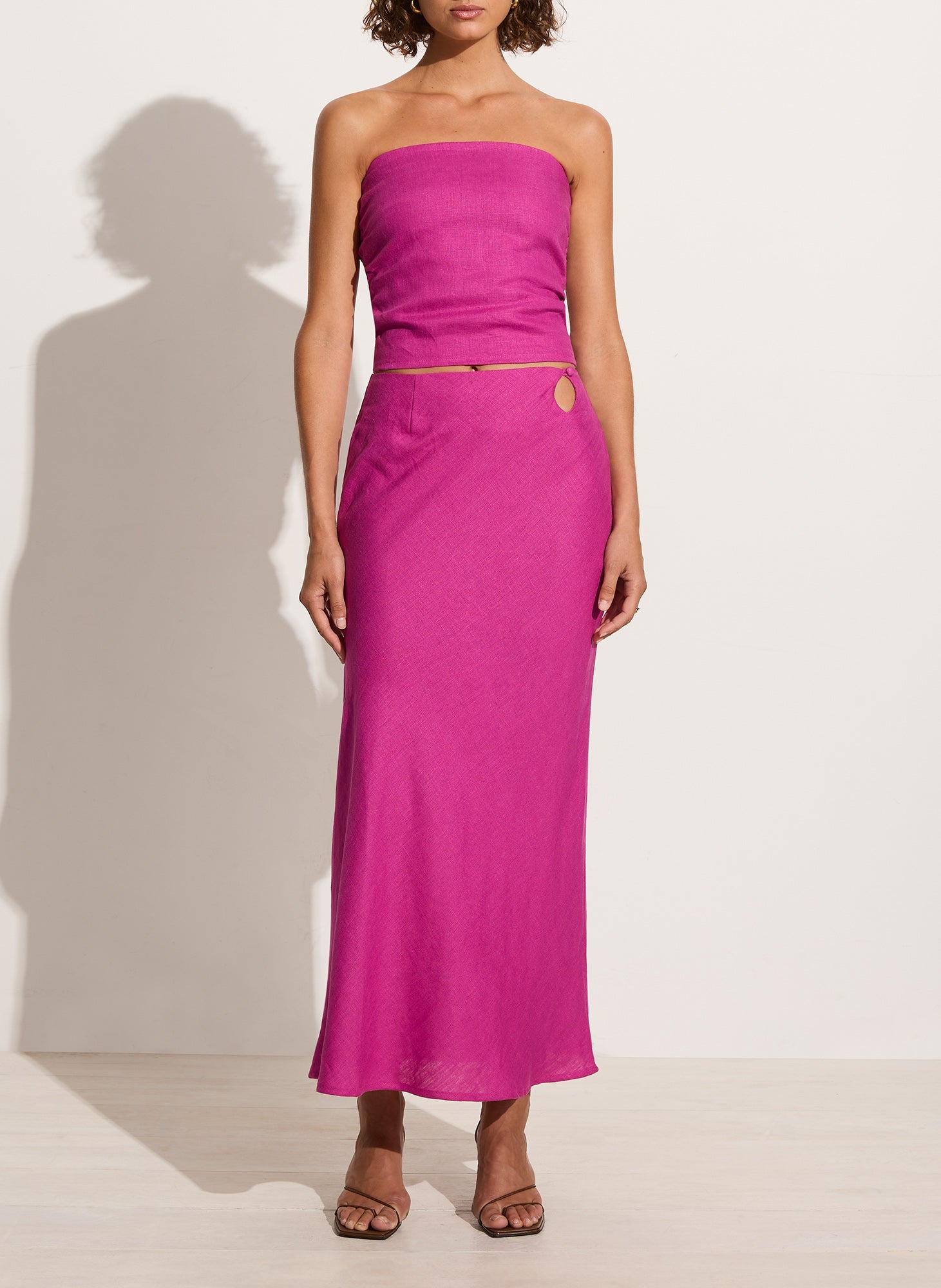 Discover a wardrobe essential in the Praiyah Bodice in Magenta. Designed for easy-wear, the Praiyah boasts a strapless neckline, gathered sides and a shirred back for extra comfort. Considerately cut from responsibly sourced linen and hand-dyed in staple black, the Praiyah is an elevated staple that easily styles with black linen trousers and strap heels.