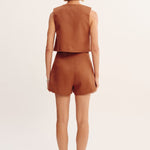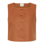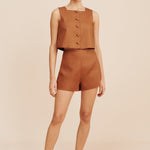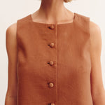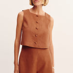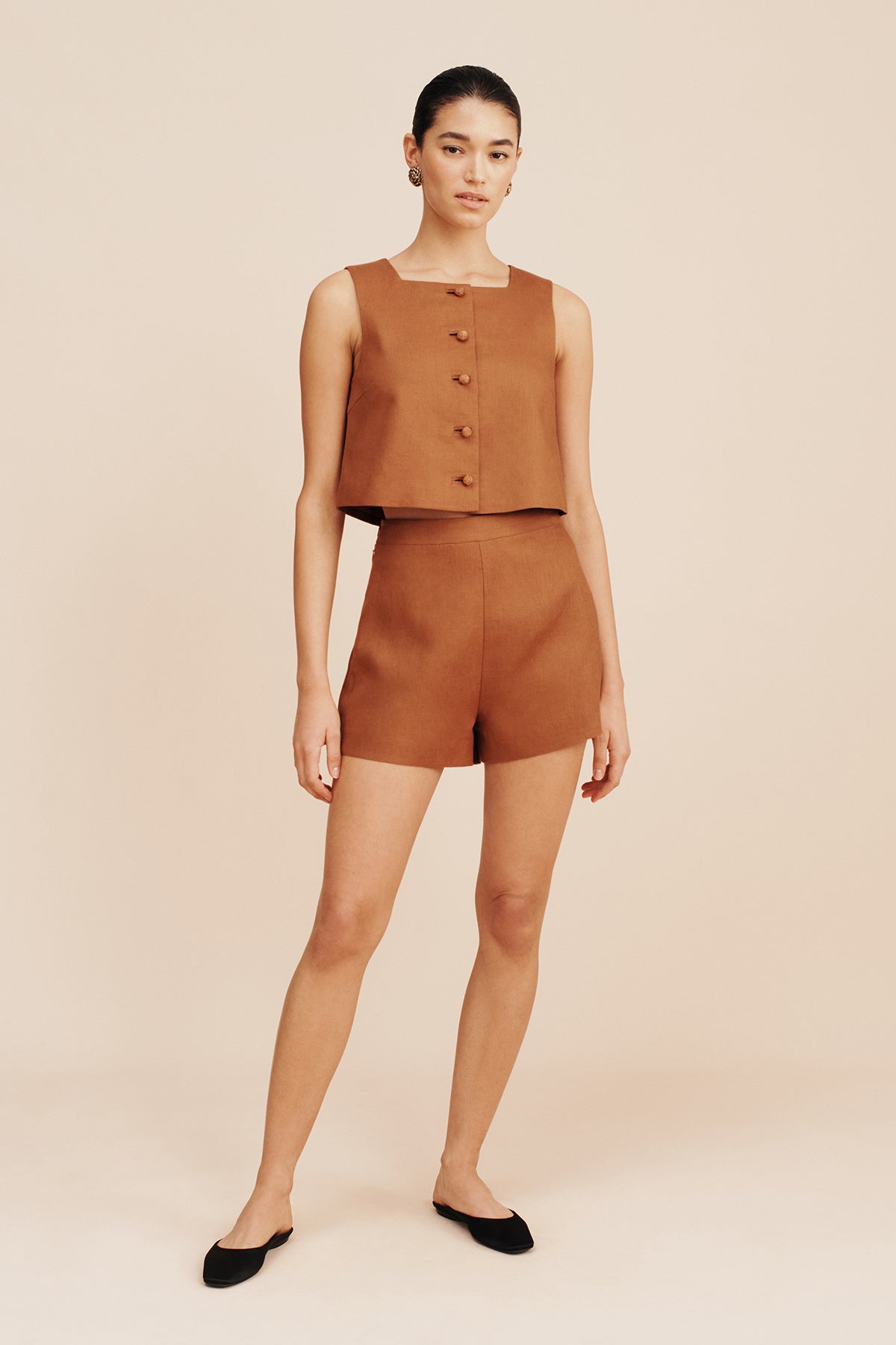 Tailored in mid-weight linen, the Rio Top is cut for a relaxed fit. It features an elegant high neckline and fastens with chic covered buttons throughout the centre front. Style yours as a set with the Perri Short.