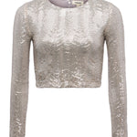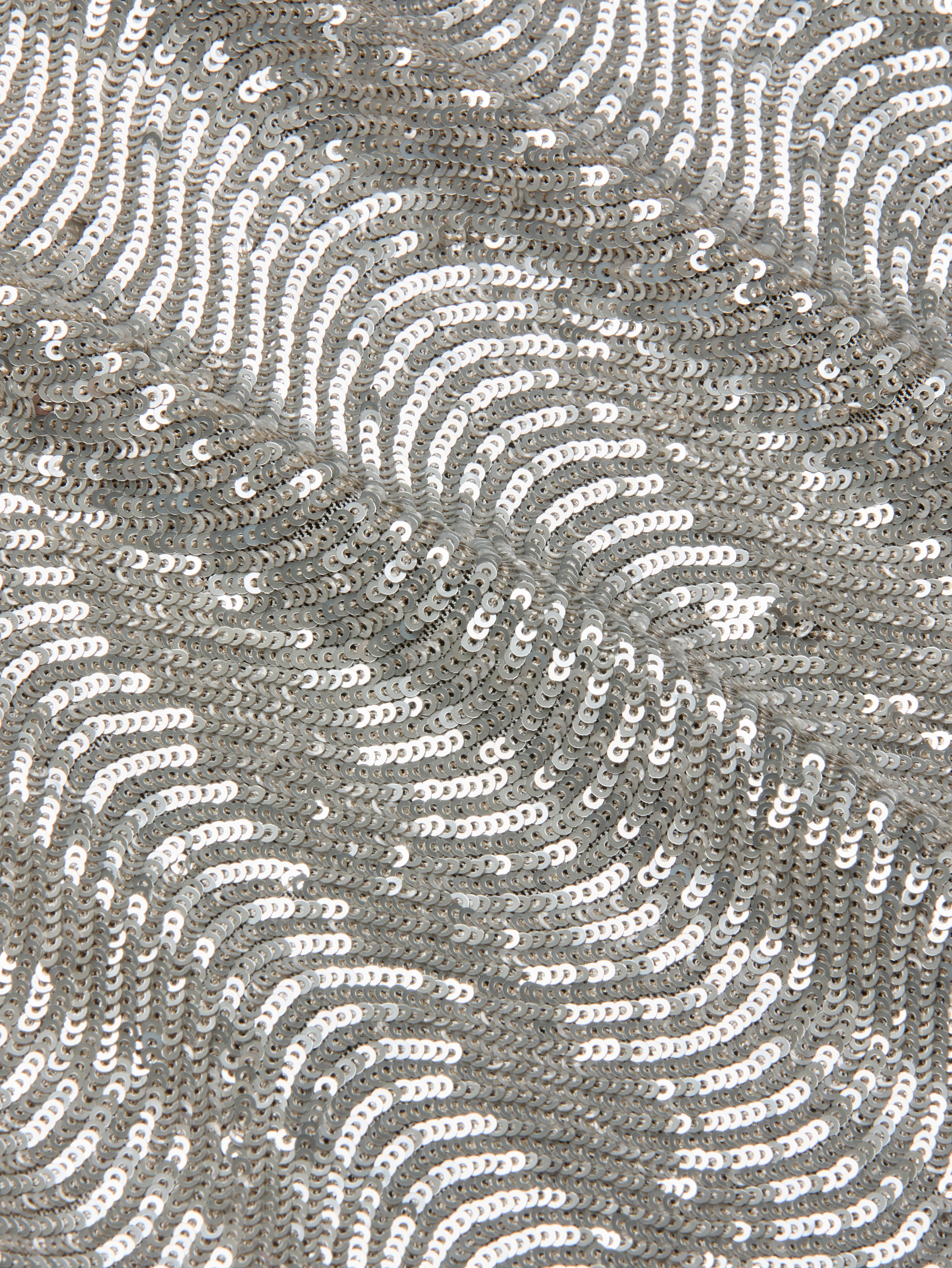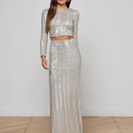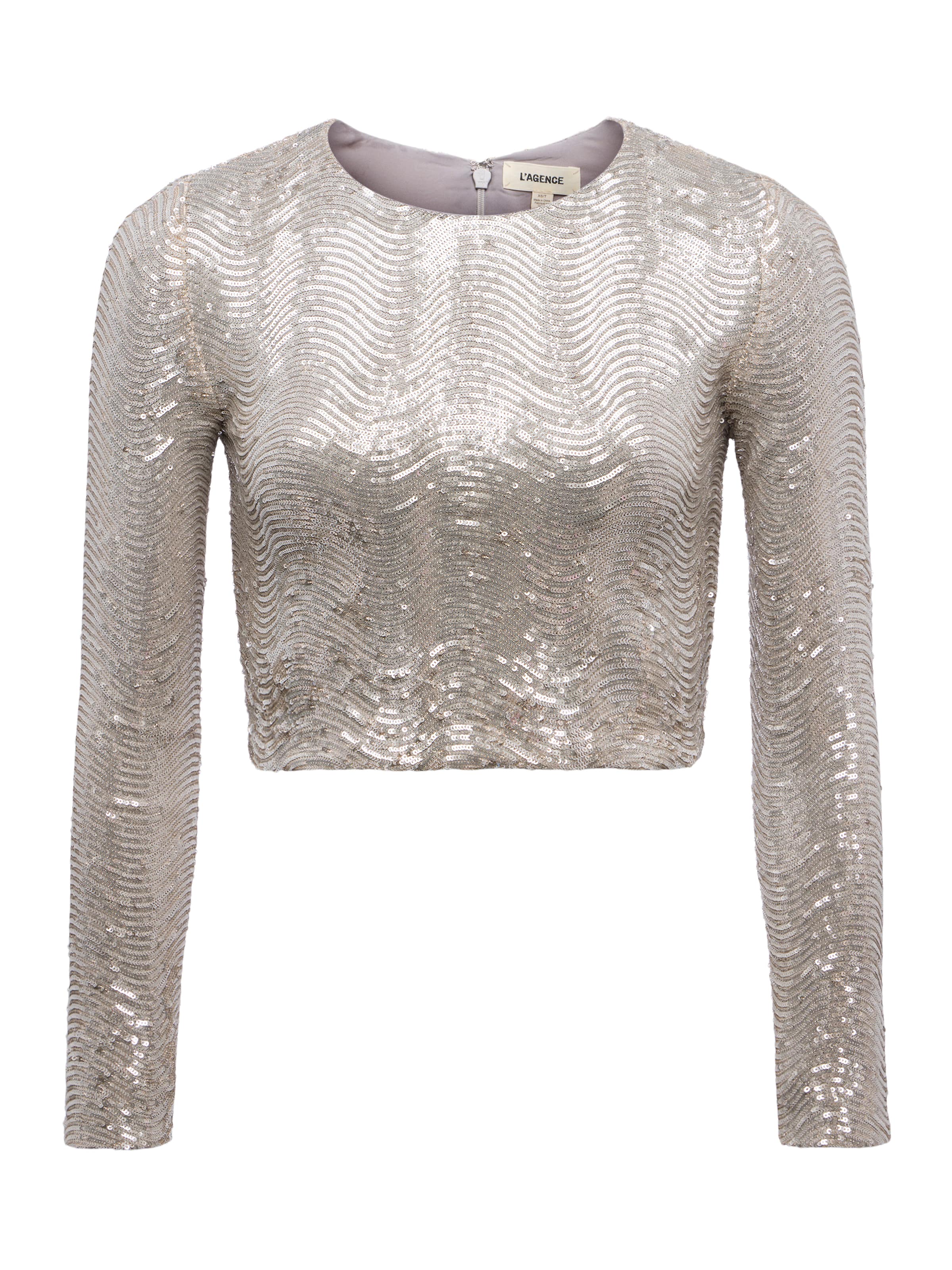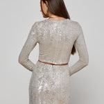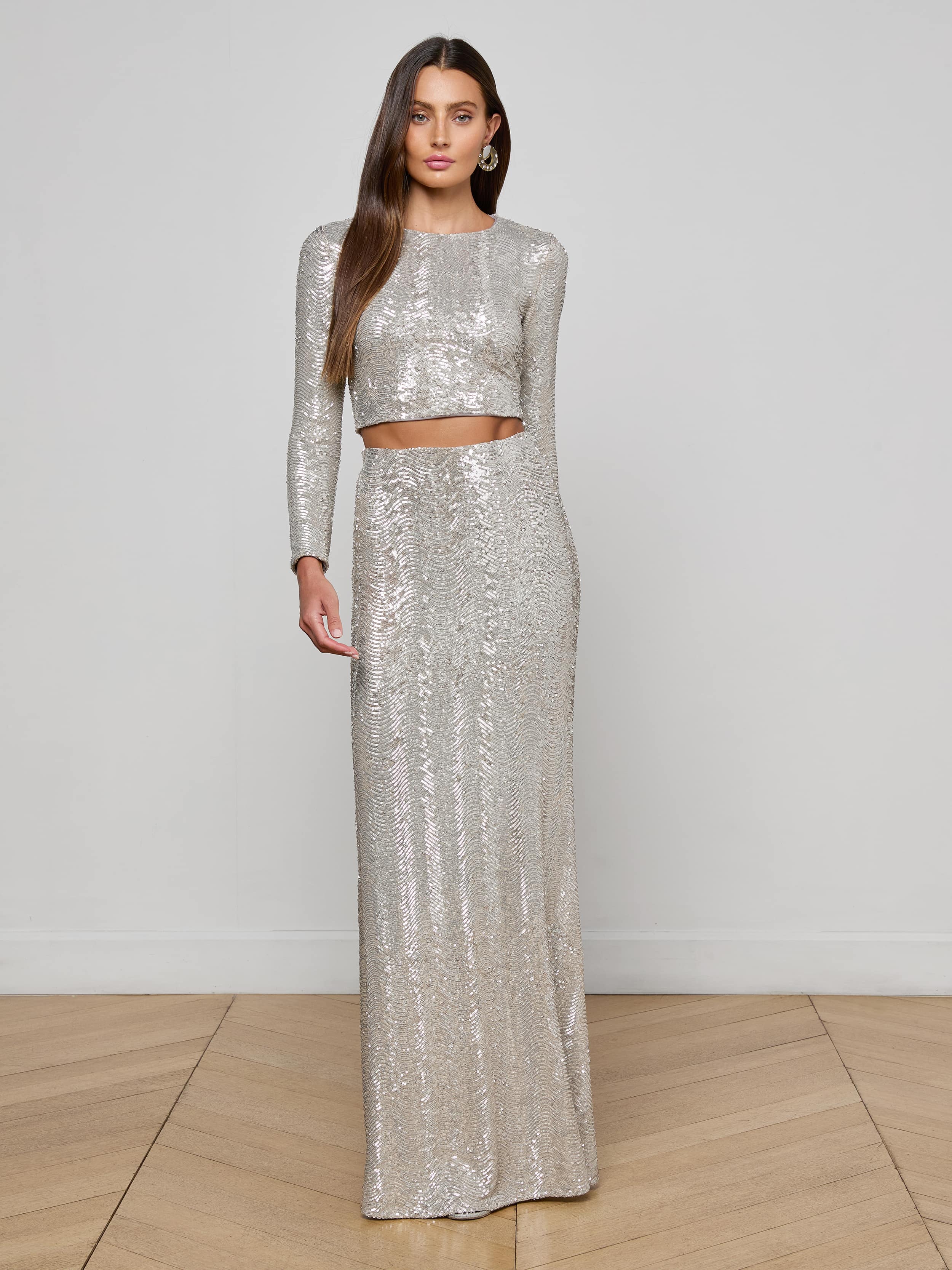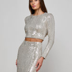 The Rogan crop top brings high shine with a sleek, modern silhouette. Covered in allover silver sequins arranged in a swirl pattern, it features long sleeves, a high neckline, and a cropped cut that feels both polished and party-ready. Wear it with the coordinating skirt for a head-turning set.