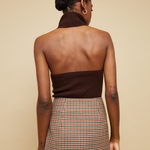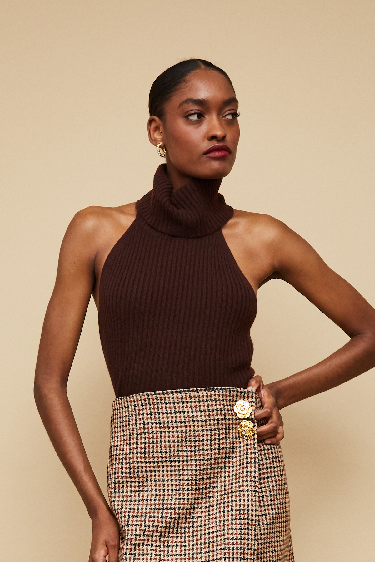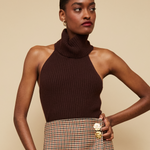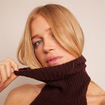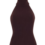 The form-fitting Samson Top is a ribbed knit open back halter with a luxurious, oversized turtleneck. The vertical rib knit stitch creates a figure-flattering silhouette.