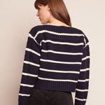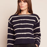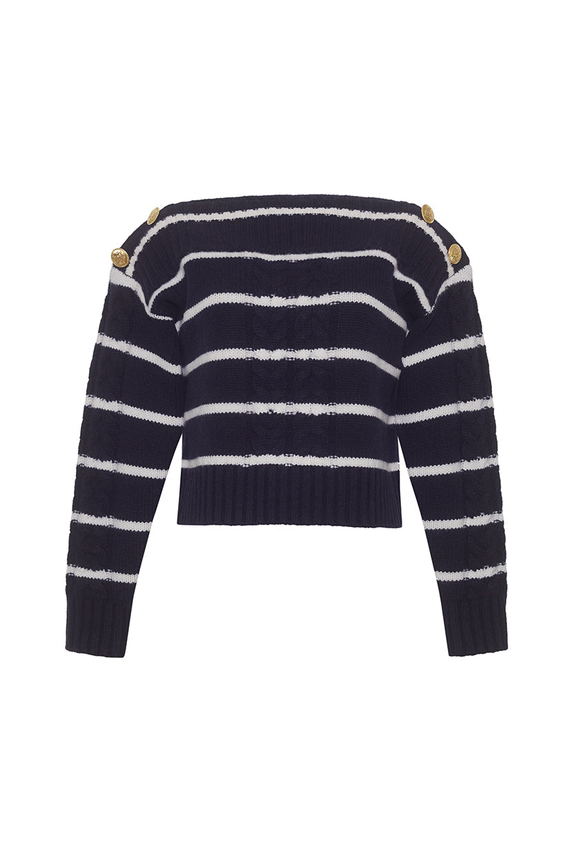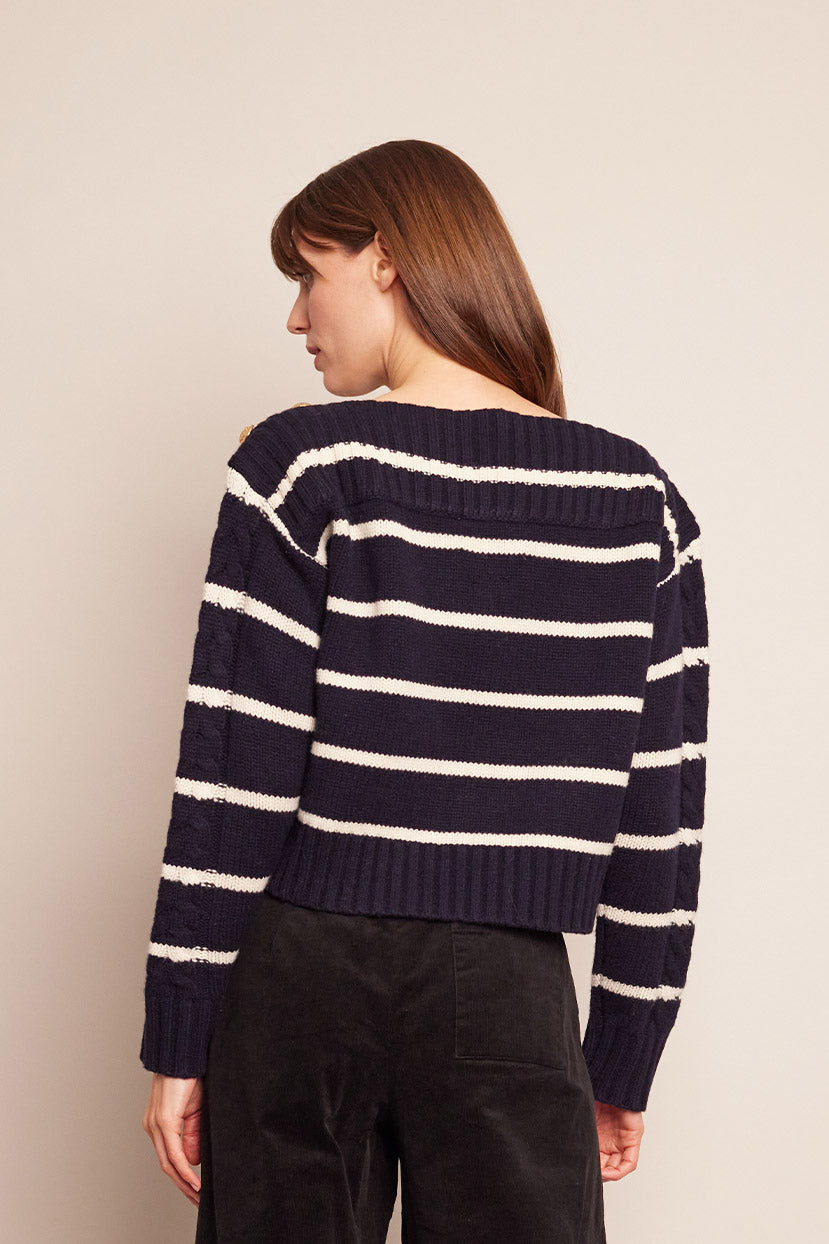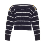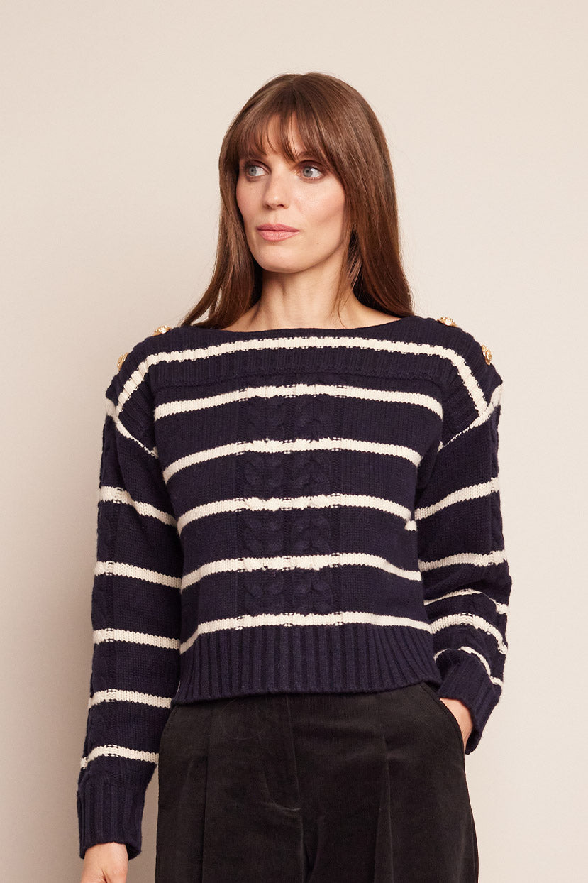 • Chunky striped, dropped shoulder pullover with novelty filigree buttons