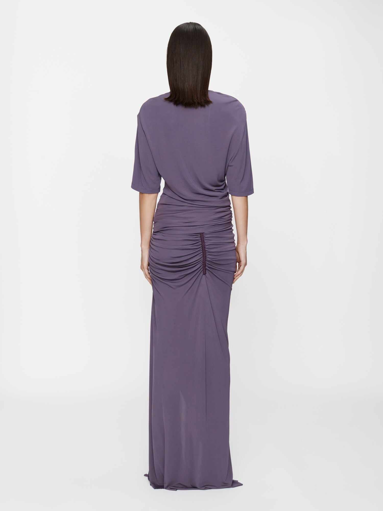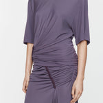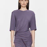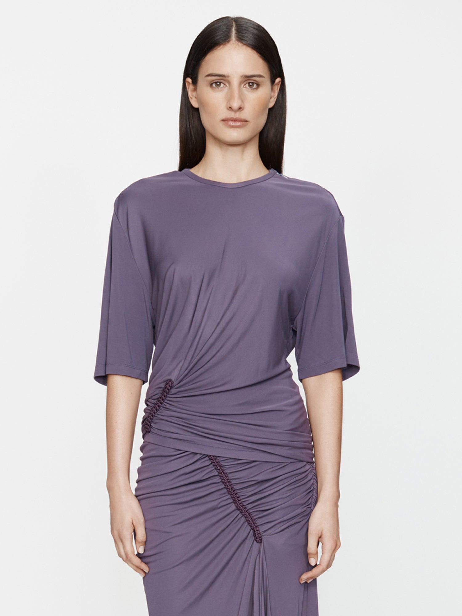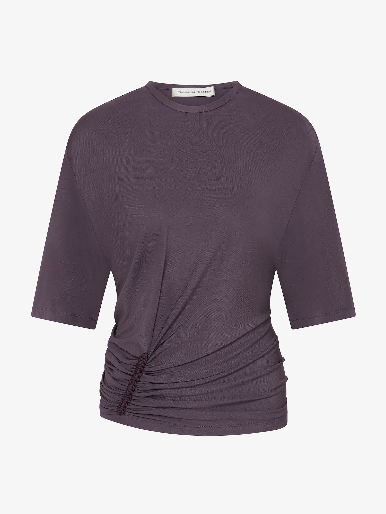 Cut in a draped technical jersey, the silhouette is cinched at the side with tonal shibari, forming soft ruching through the waist. The Shibari Side Ruched Tee reinterprets the classic T-shirt with considered detail.
