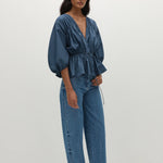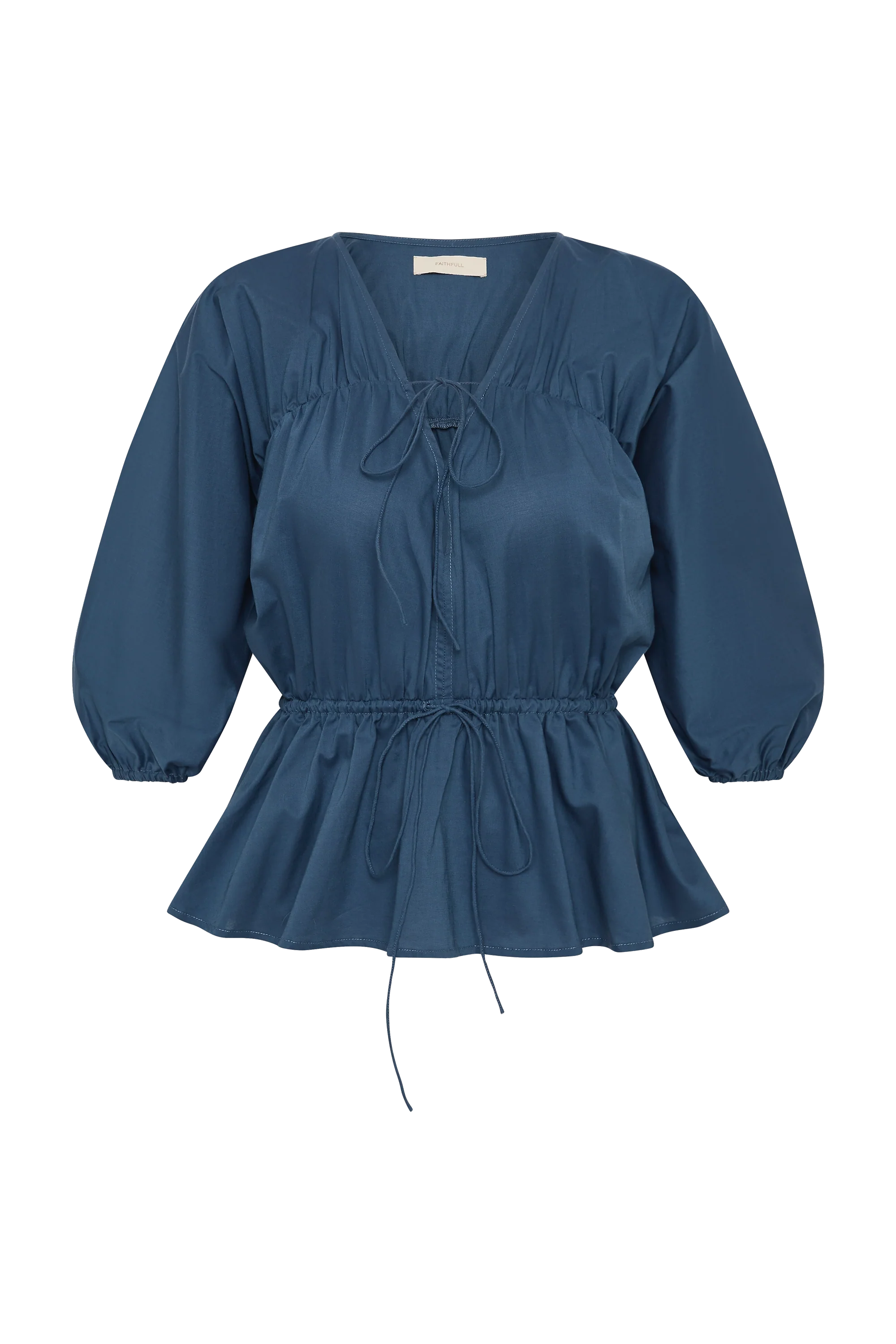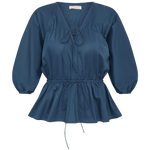 A blouse-style top with a deep V-neckline and long balloon sleeves that reach down below the elbow and are elasticated at the cuff. There is a tie detail at the neckline as well as one at the waist, where it is also elasticated for a more cinched fit. From there it flares into a peplum hem that crops around the hips. Designed from 100% BCI Certified cotton in a vintage navy, style with a classic denim jean or pant for everyday transeasonal dressing.