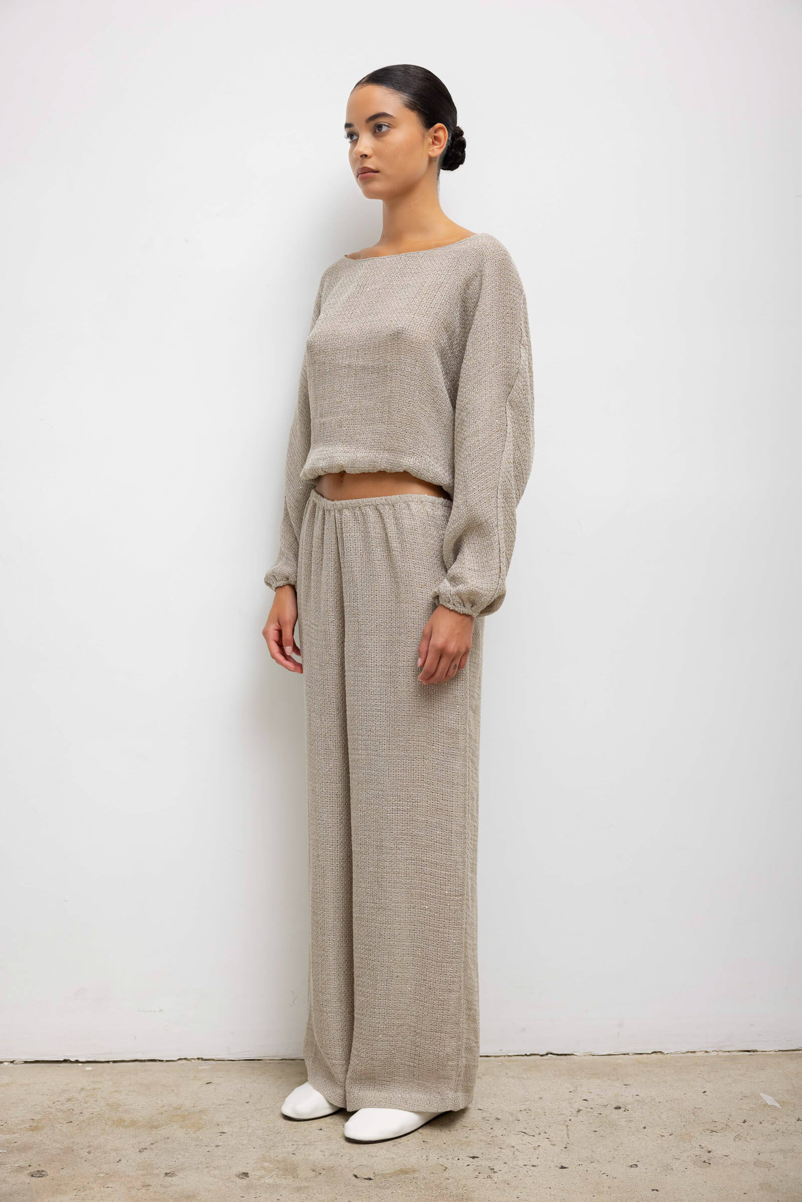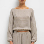 Cut in our subtly sequined Stella Linen, the Stella Long Sleeve Blouson features a soft boat neckline, cropped length, elasticated cuffs and hemline. Make it a matching set with The Stella Wide Leg Pant.