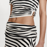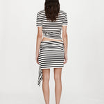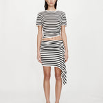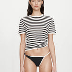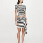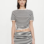 The Stripe Knit Ruched Orbit Tee is crafted from a soft ribbed knit featuring black and white stripe. Designed with a relaxed fit through the body, it gathers at the hip through ruched detailing and signature brass orbit hardware - creating a subtle twist on a classic silhouette.