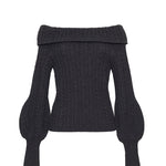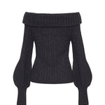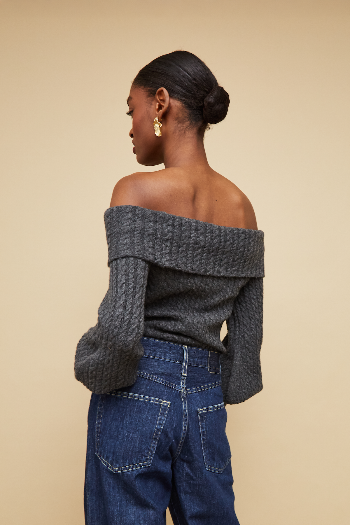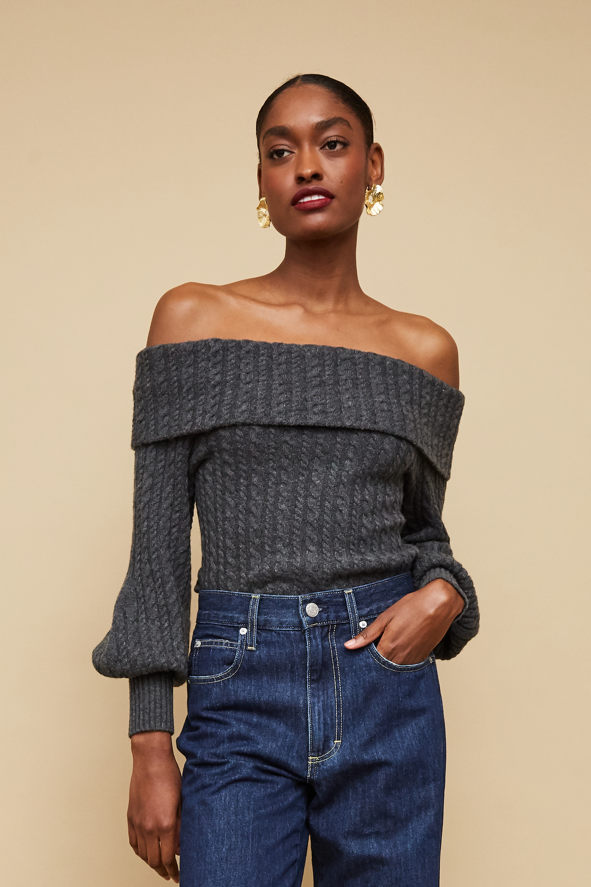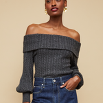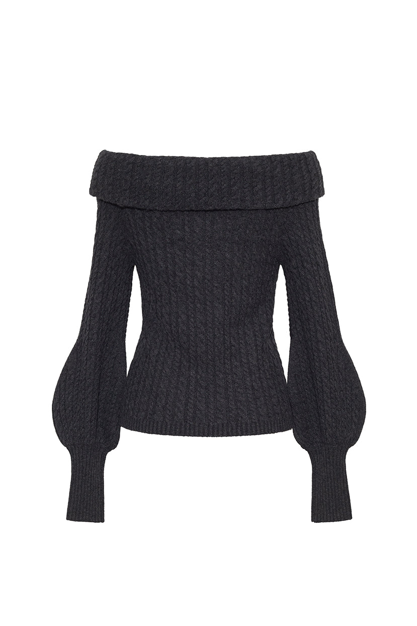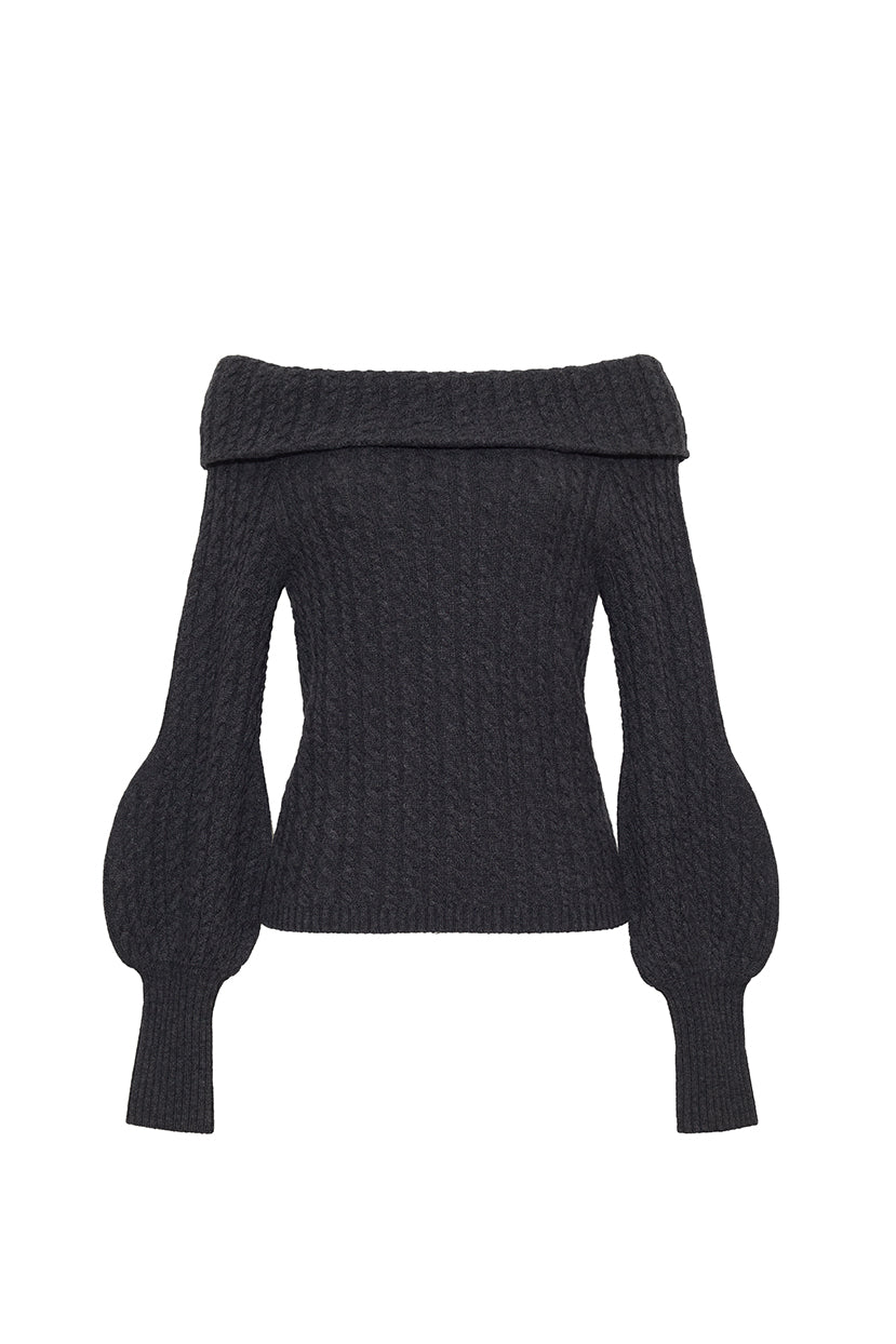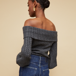 • Roll-over, off-the-shoulder lantern sleeve cable-knit pullover long sleeve sweater