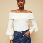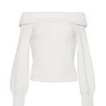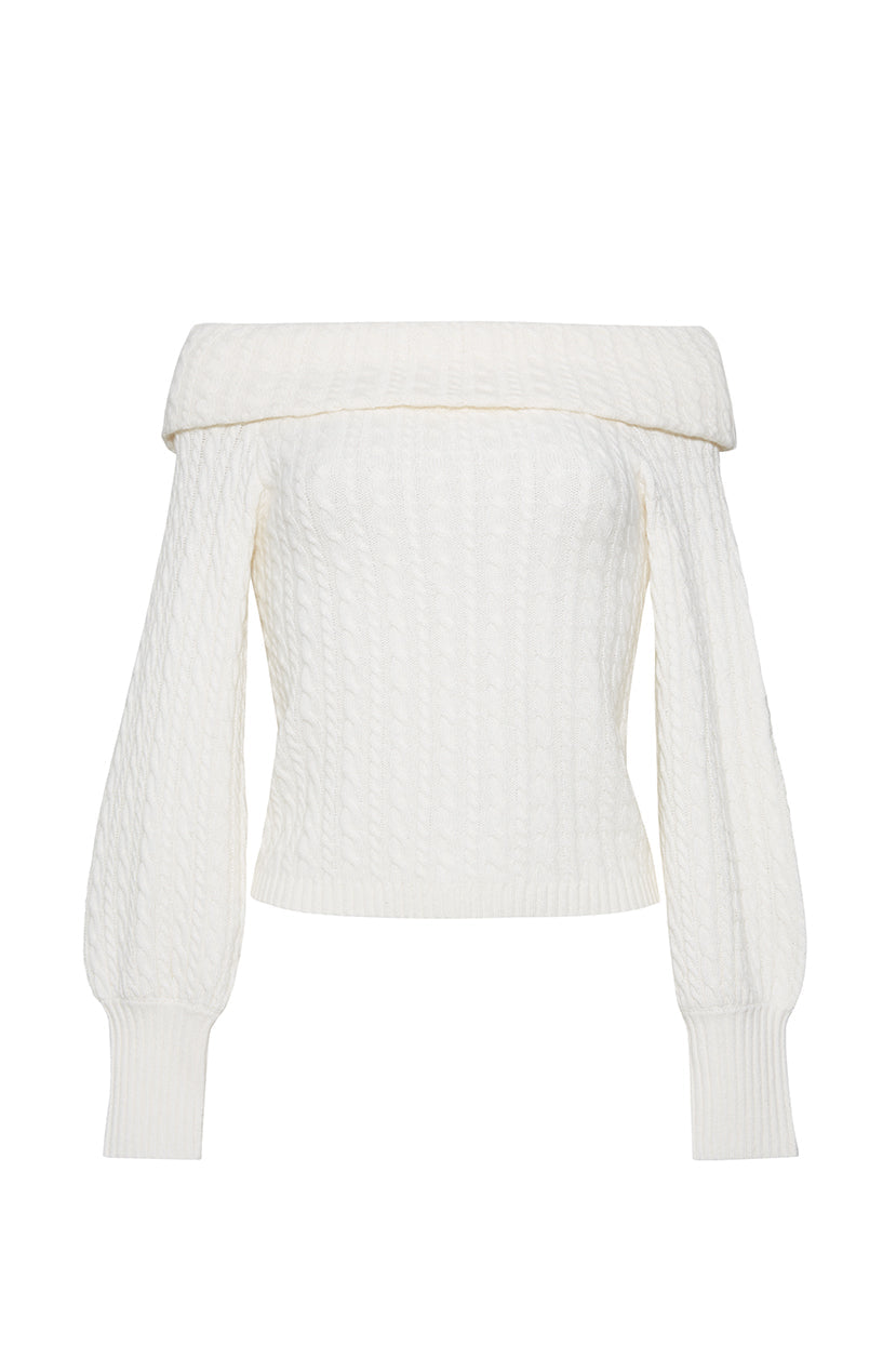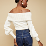 • Roll-over, off-the-shoulder lantern sleeve cable-knit pullover long sleeve sweater