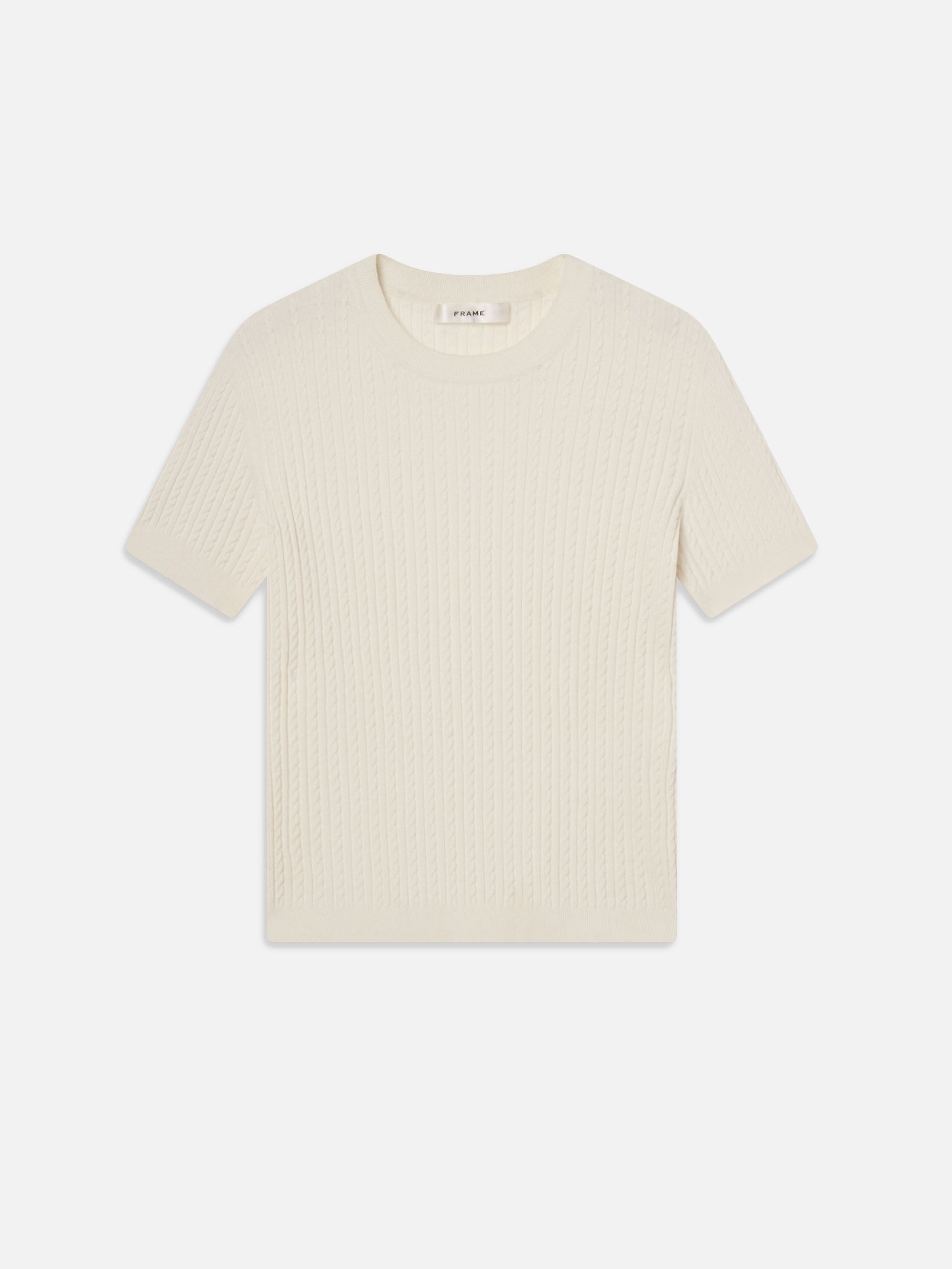 This lightweight, stretchy knit features delicate cable detailing and a slim, figure-flattering shape. Gorgeous on its own or layered beneath jackets and coats, with a sleeve that ends just above the elbow.